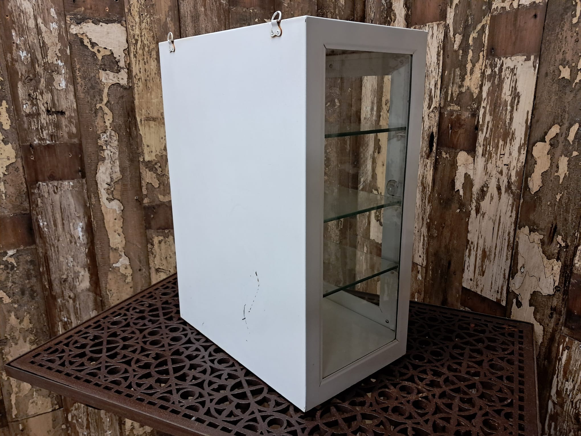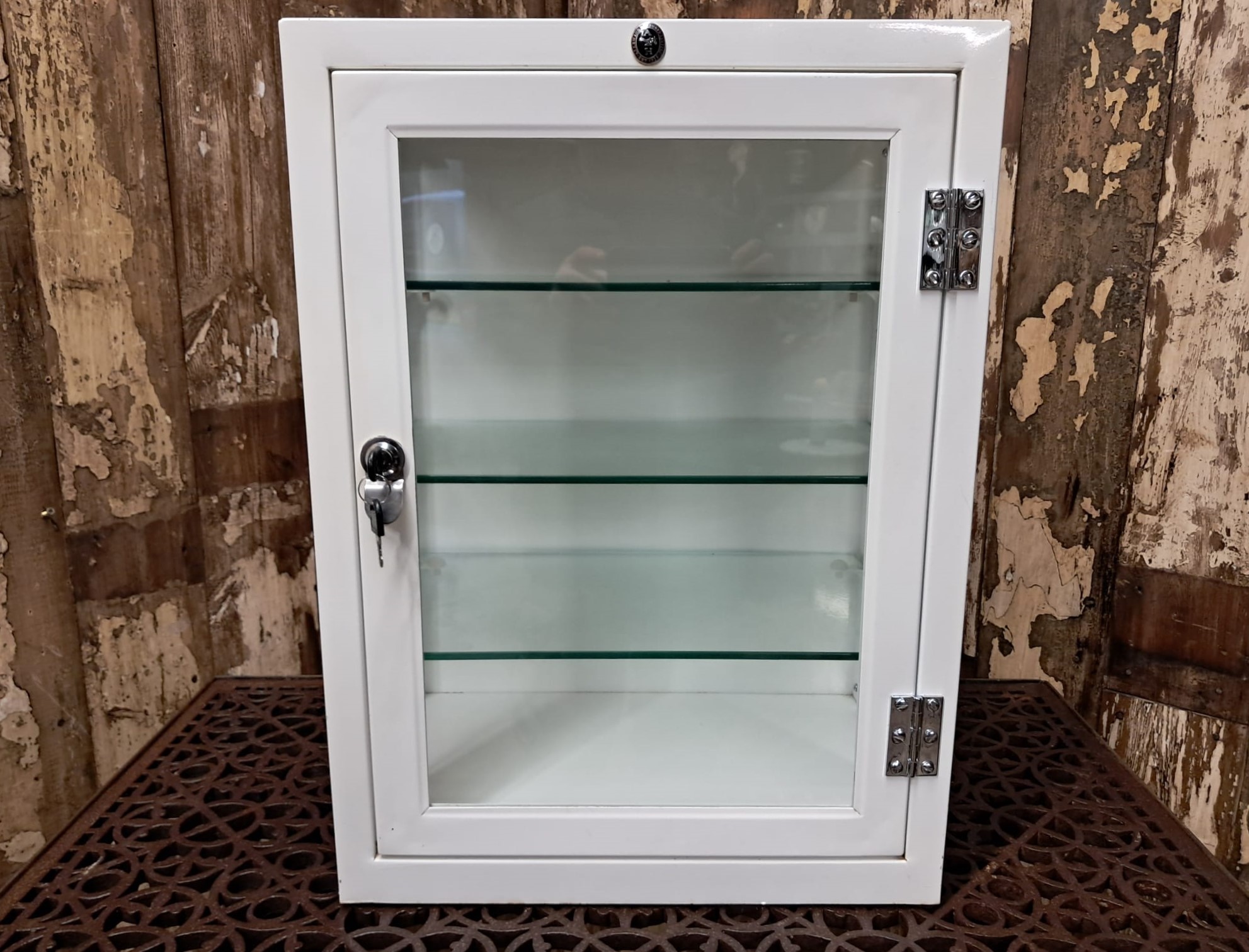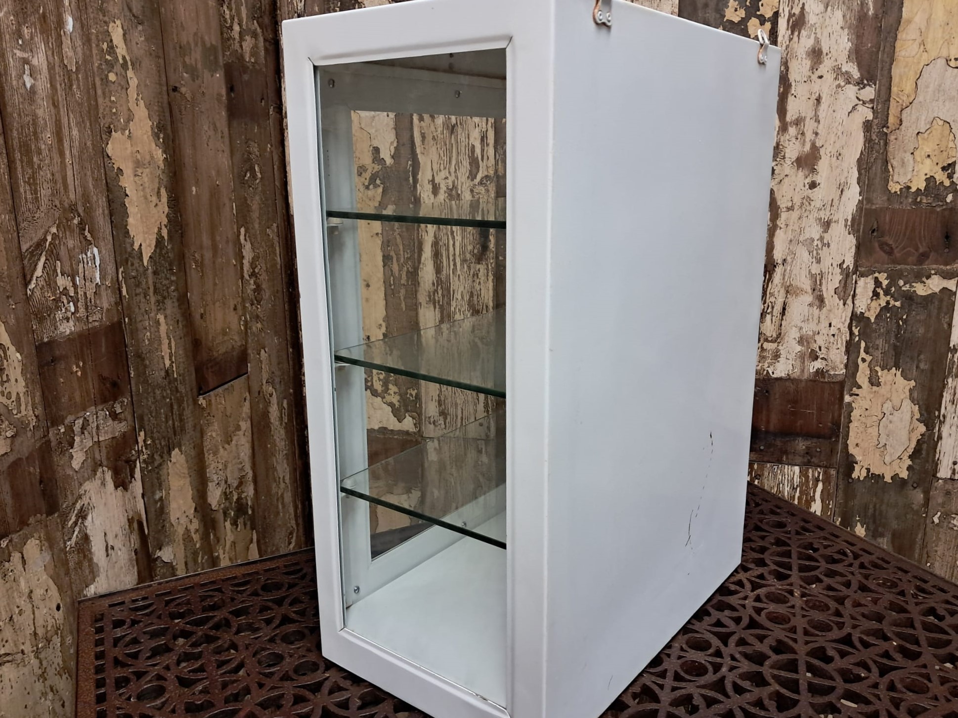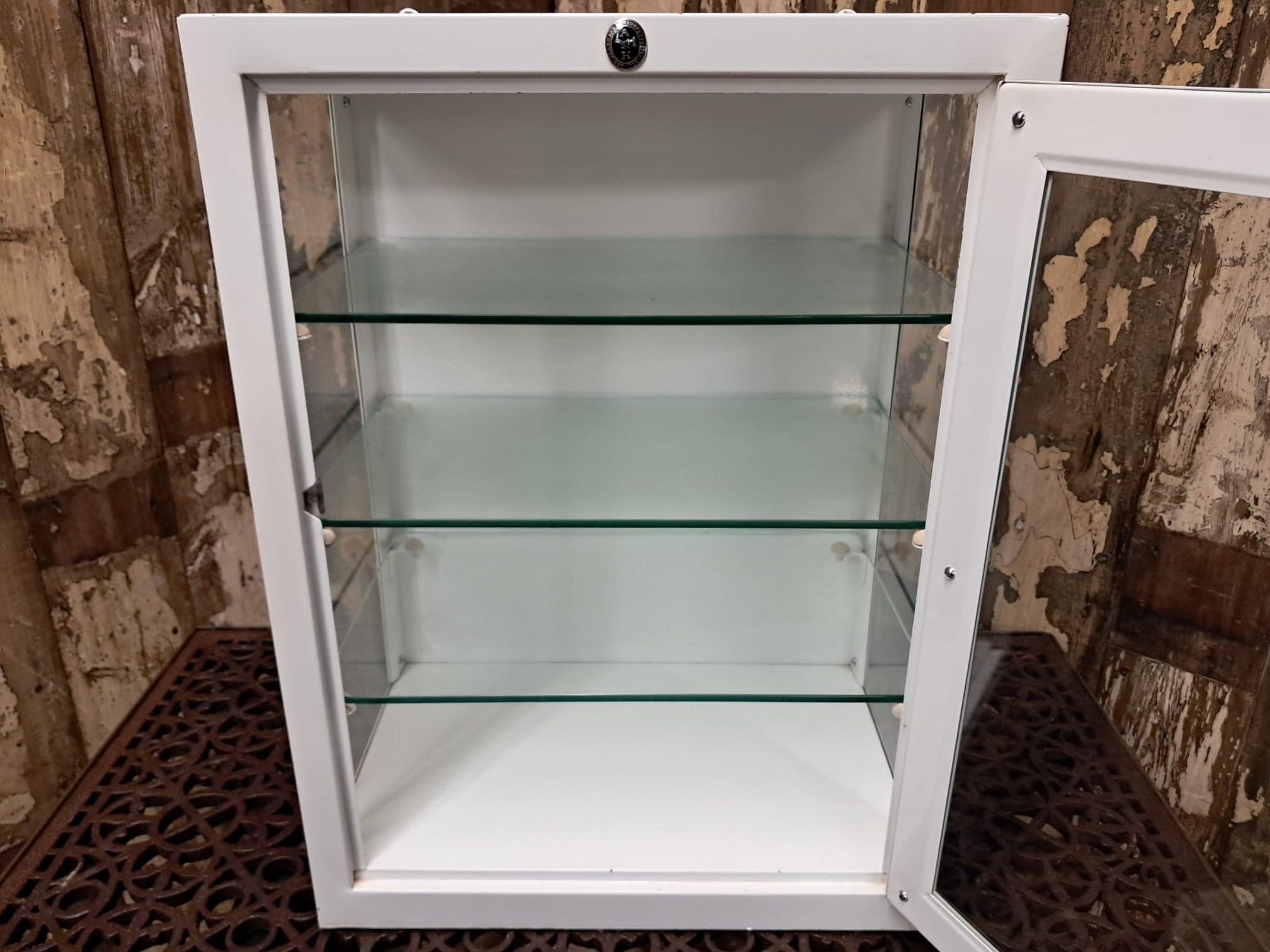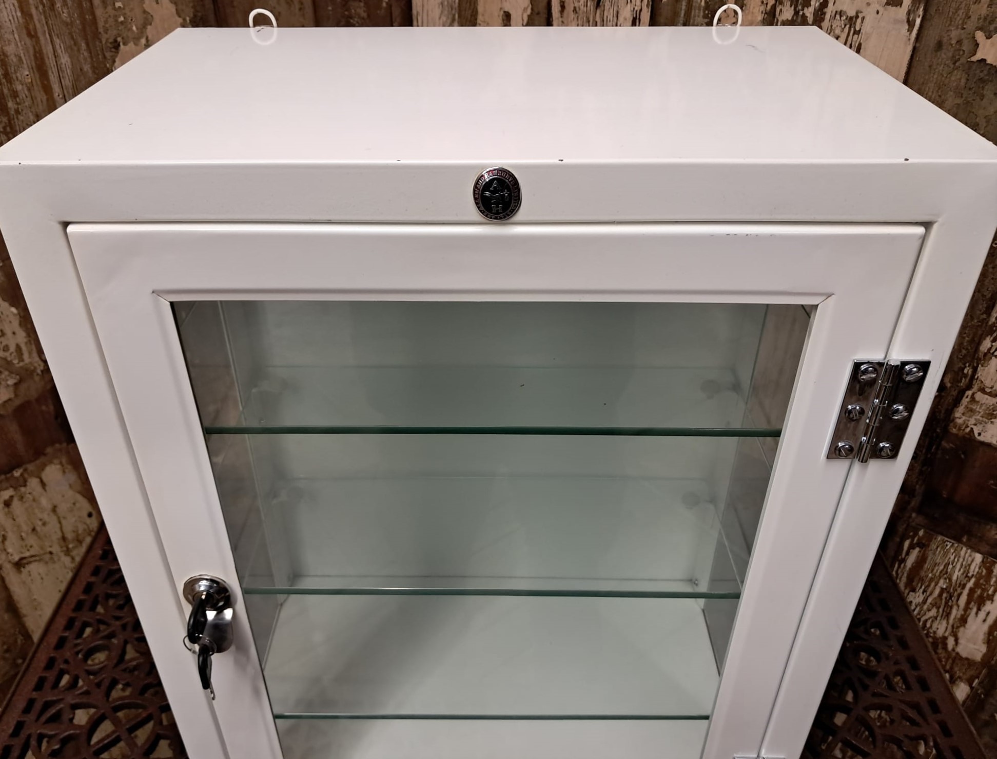 With enamelled white finish and glass front, this cabinet has three removable internal glass shelves, original chrome handle and working lock.