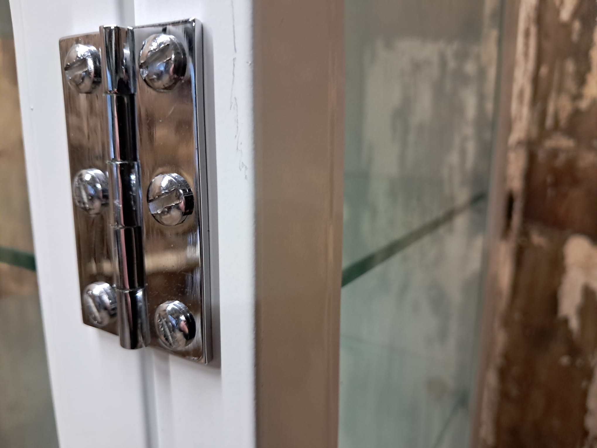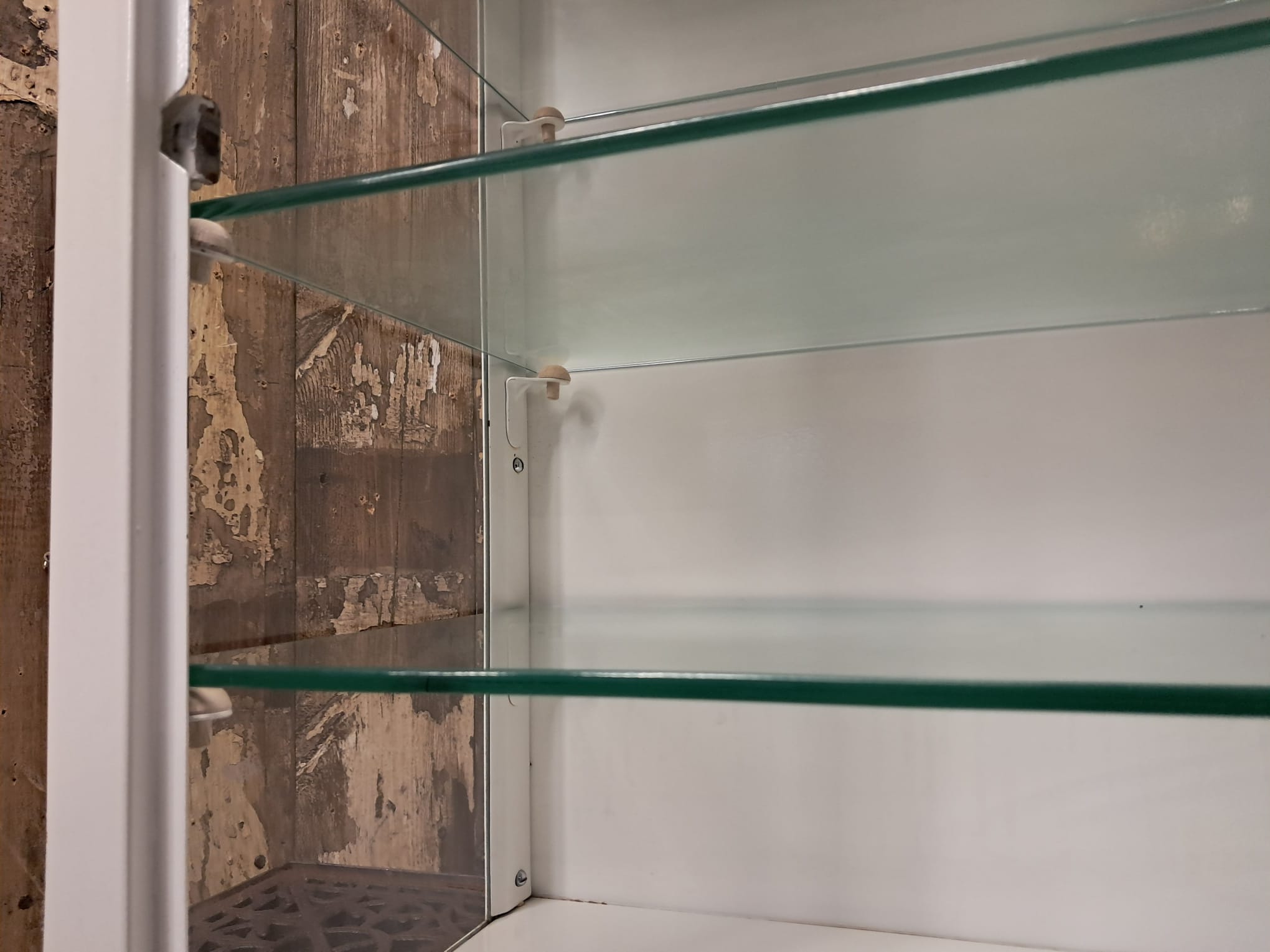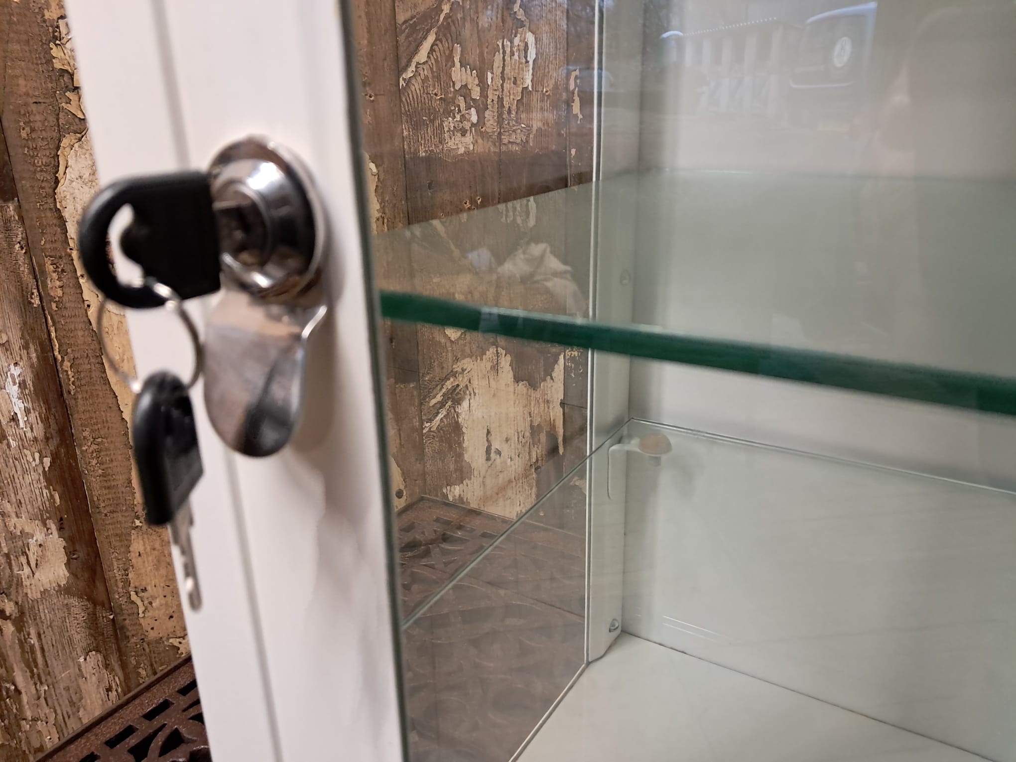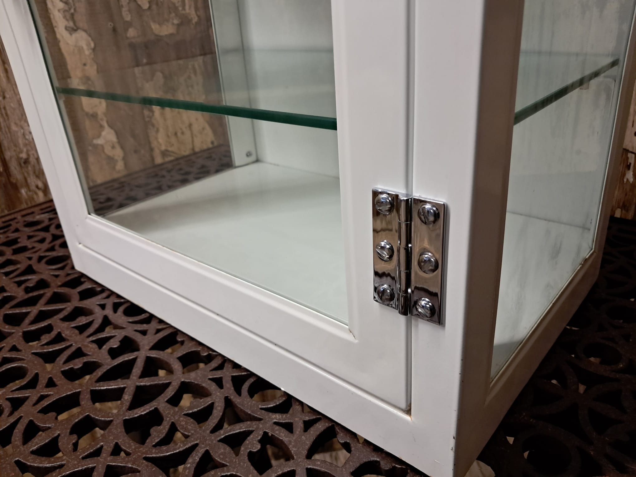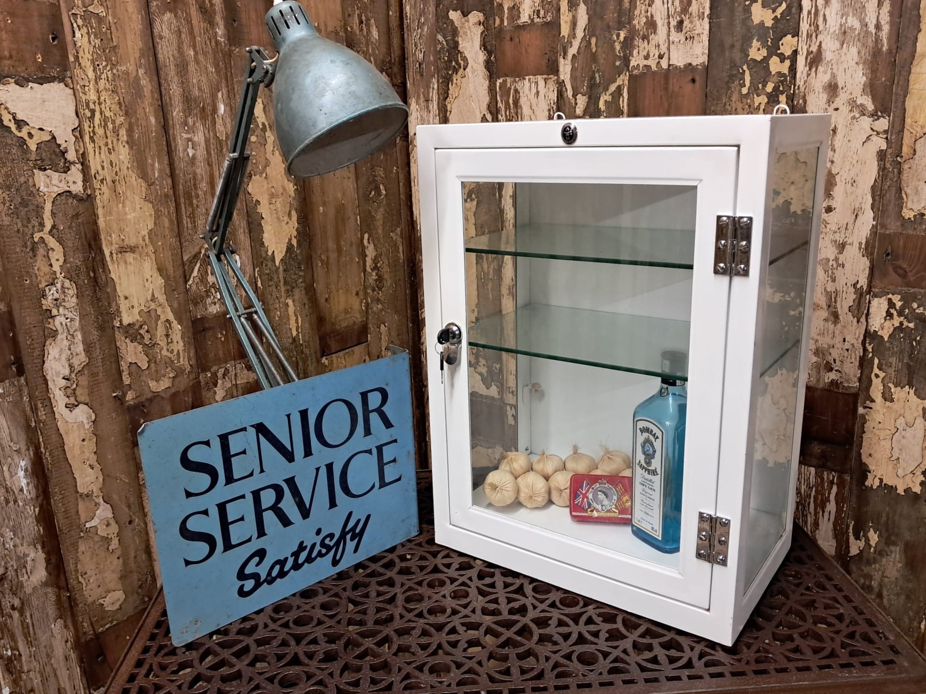 With enamelled white finish and glass front, this cabinet has three removable internal glass shelves, original chrome handle and working lock.