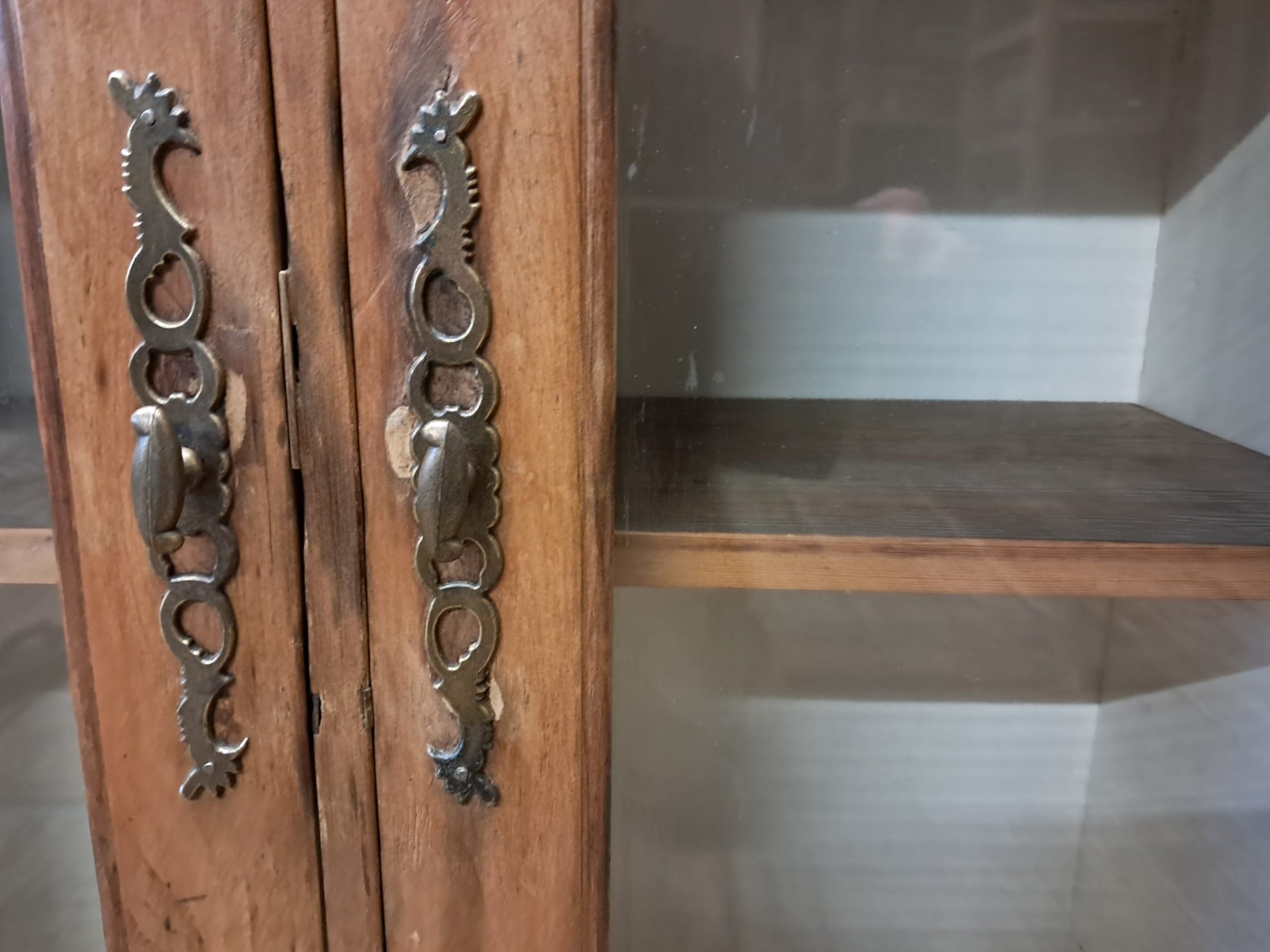 It has one internal split shelf and double glazed doors with brass handles and highly decorative finger plates.