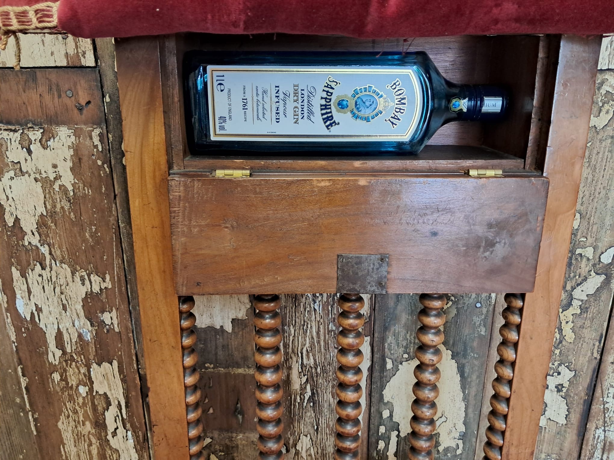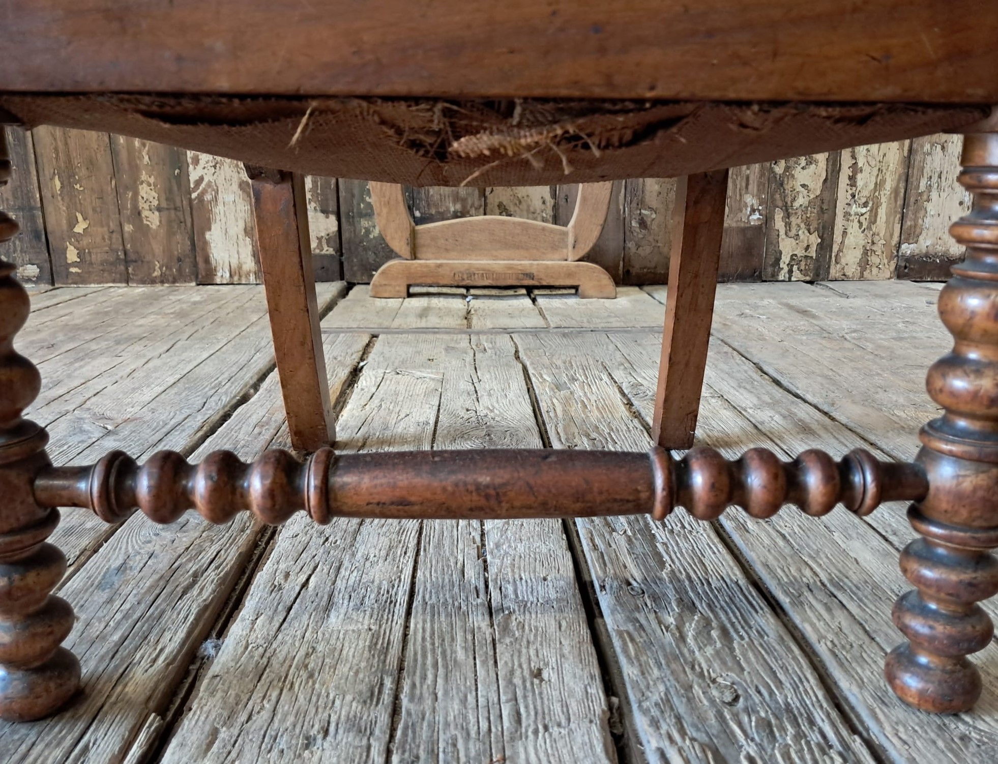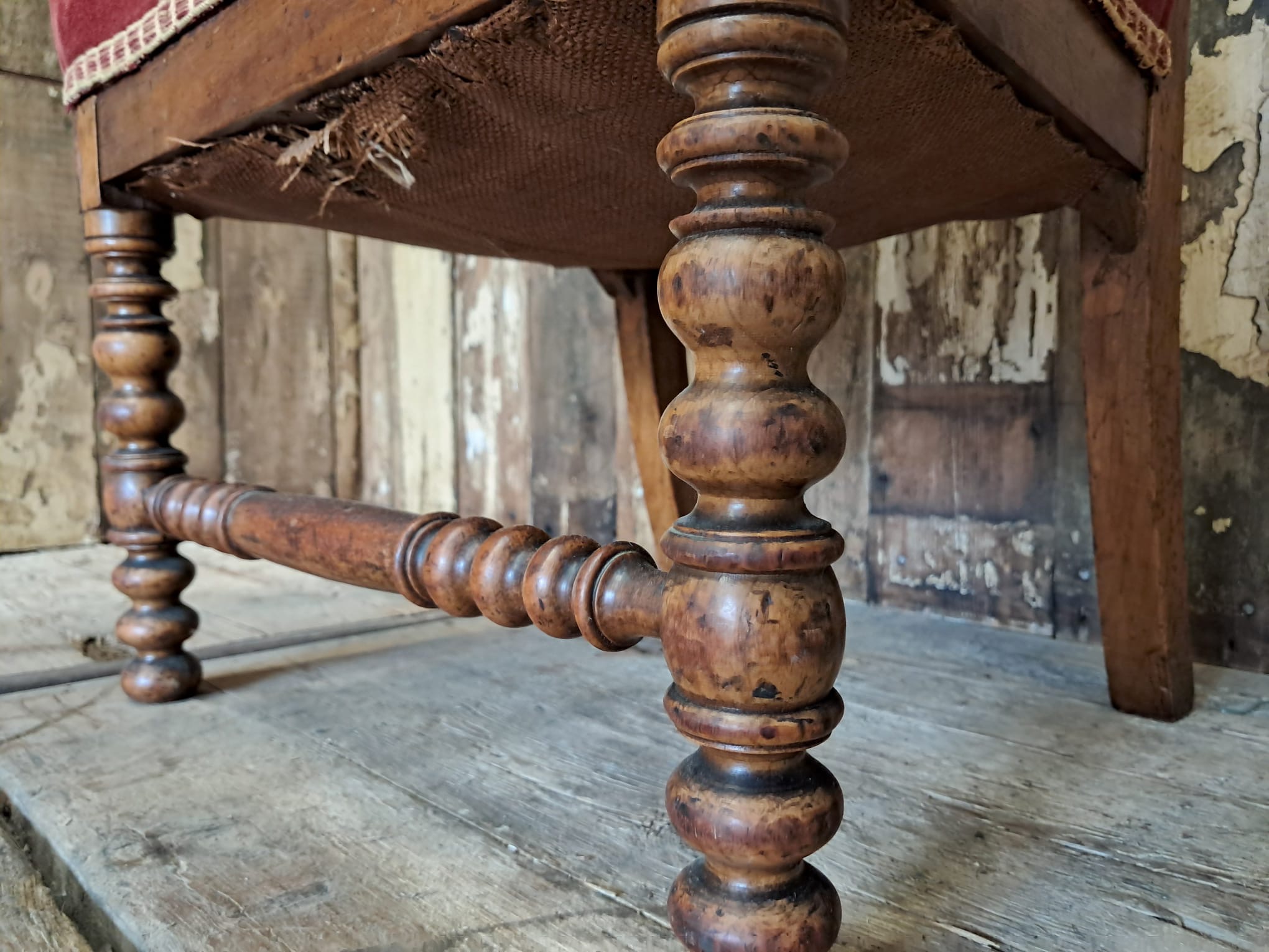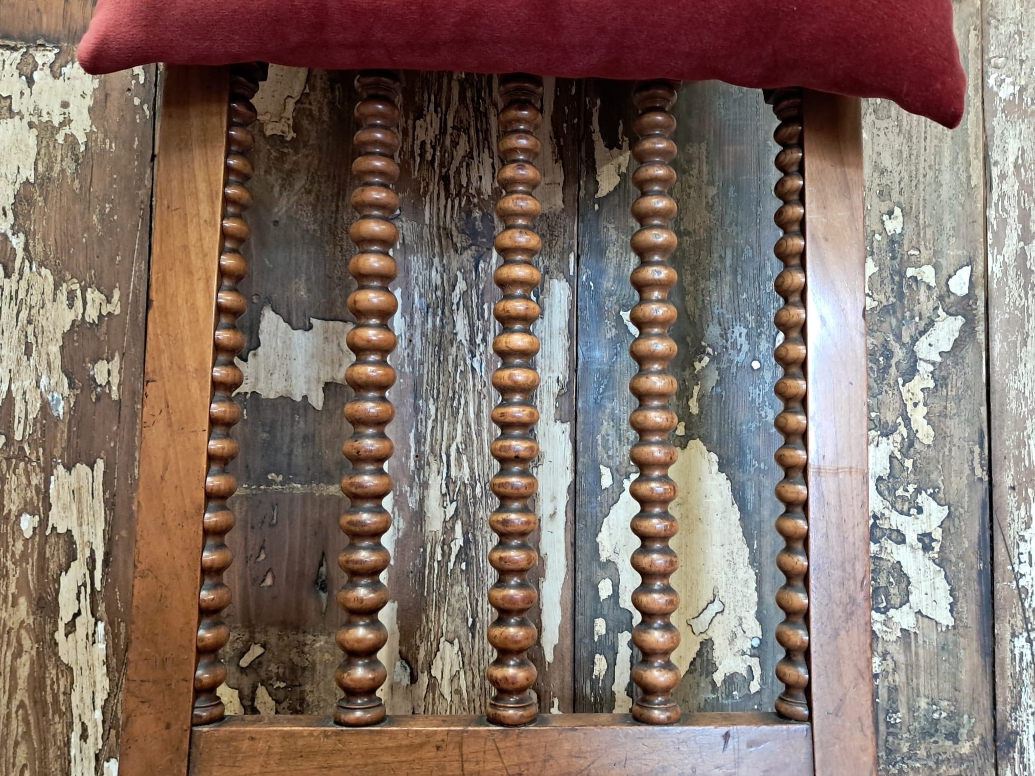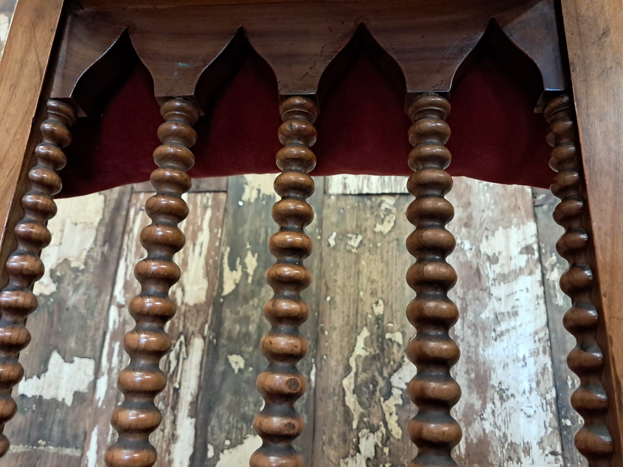 With original burgundy velvet upholstery and gold dress trims, and an aged oak frame with a beautiful patina and simple almost bobbin style legs and spindles.