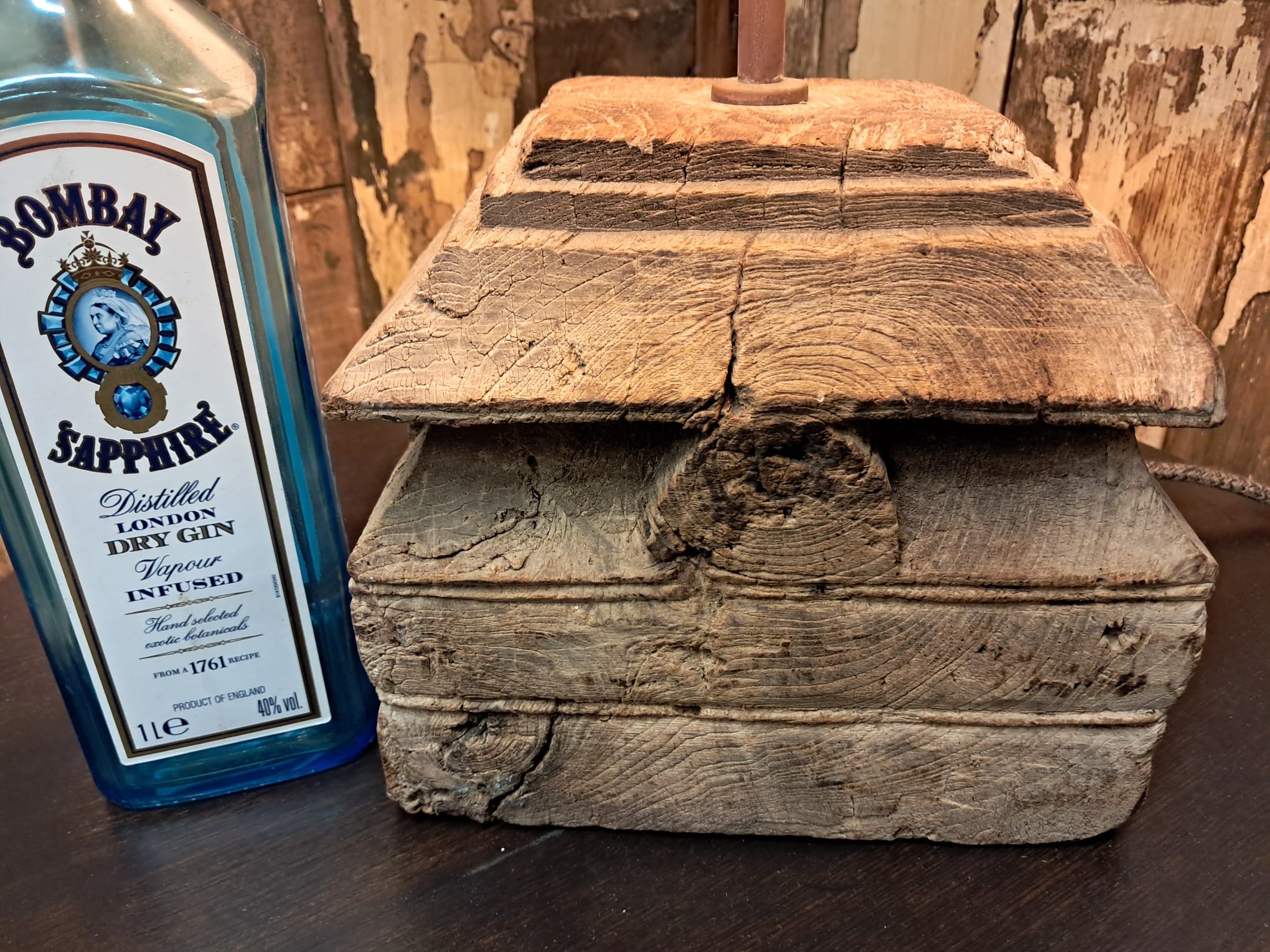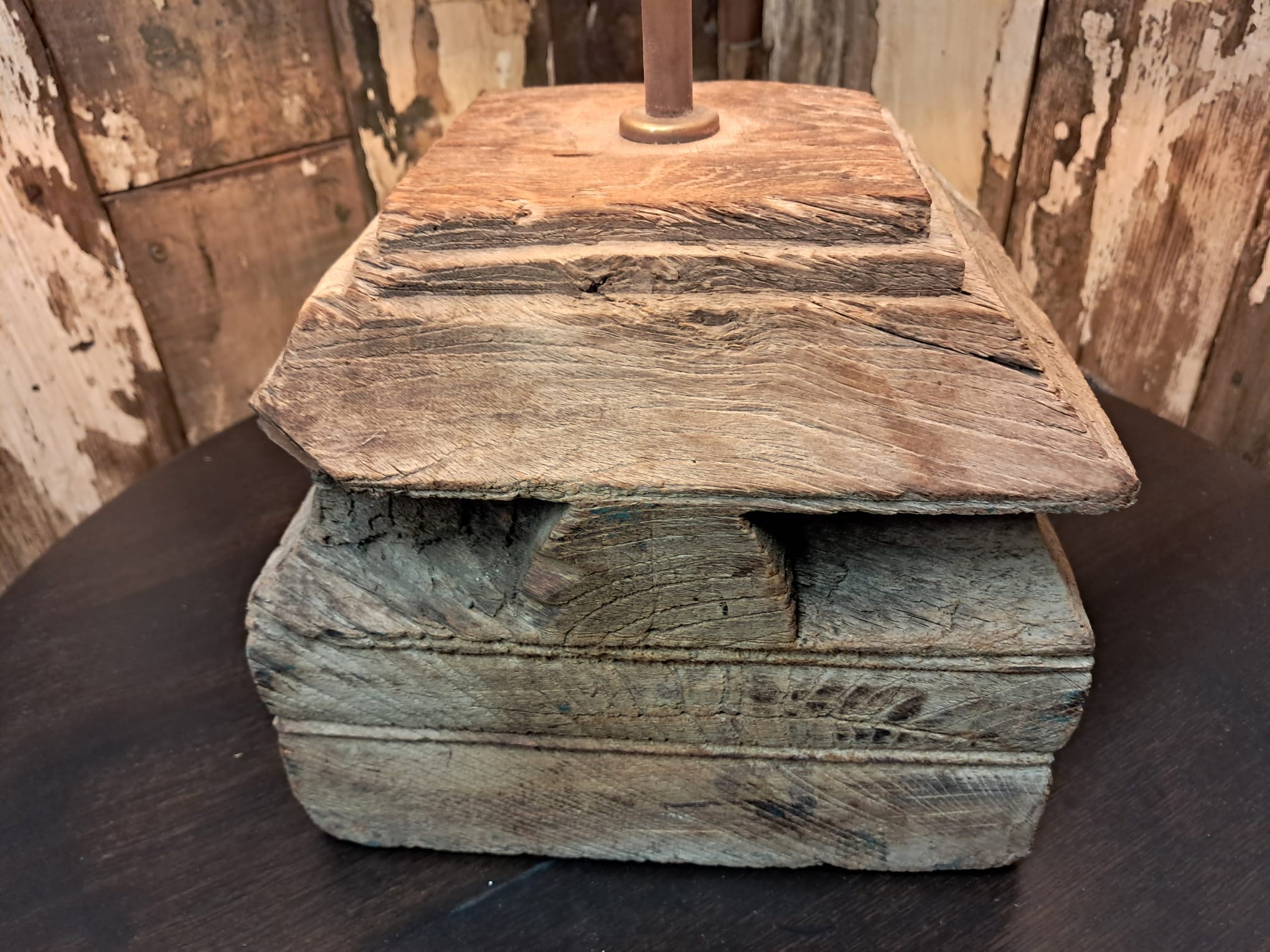 A wooden table lamp made from antique temple capitals – beautifully hand carved in solid teak which has weathered perfectly leaving a bleached grey patina.