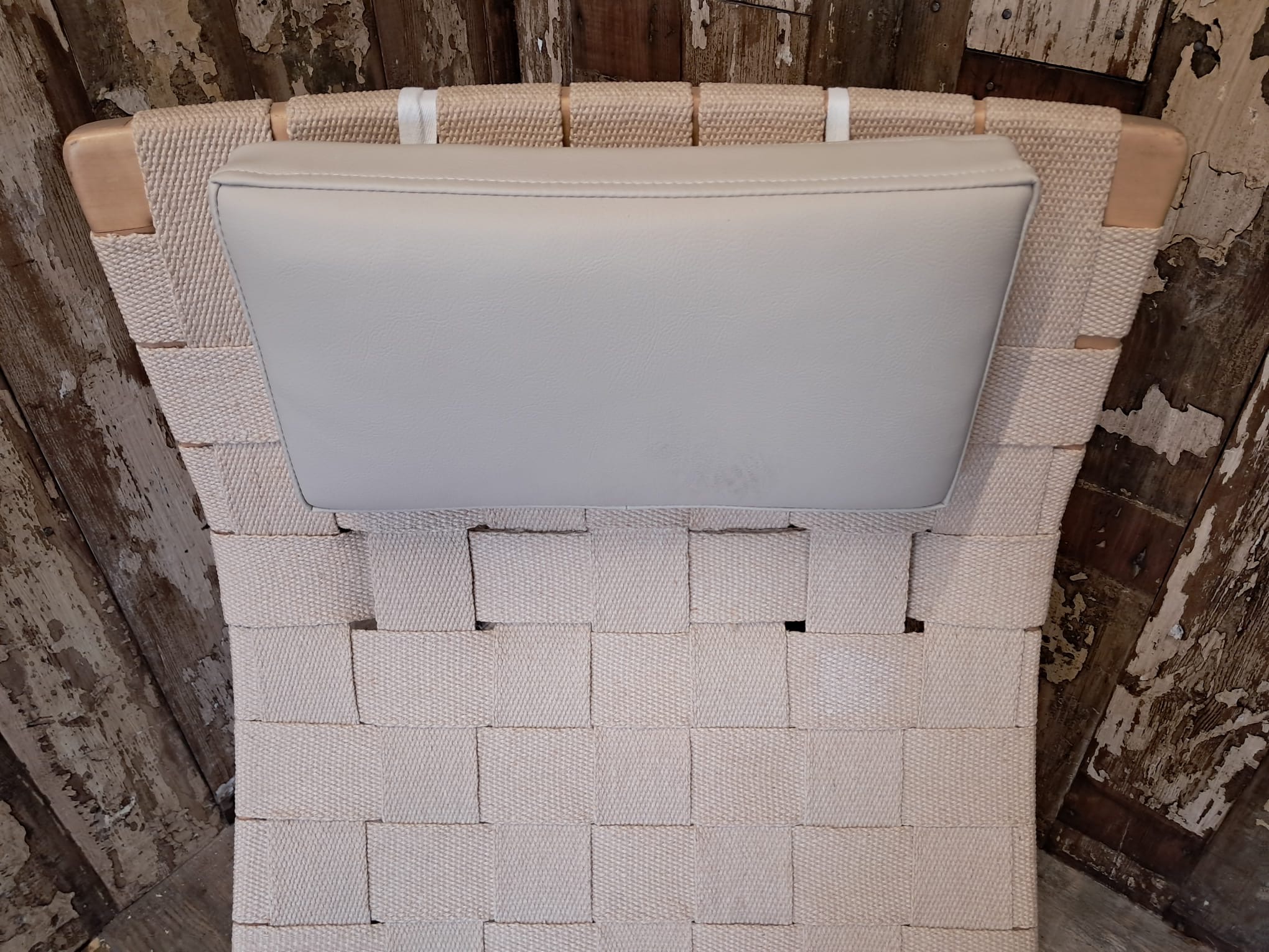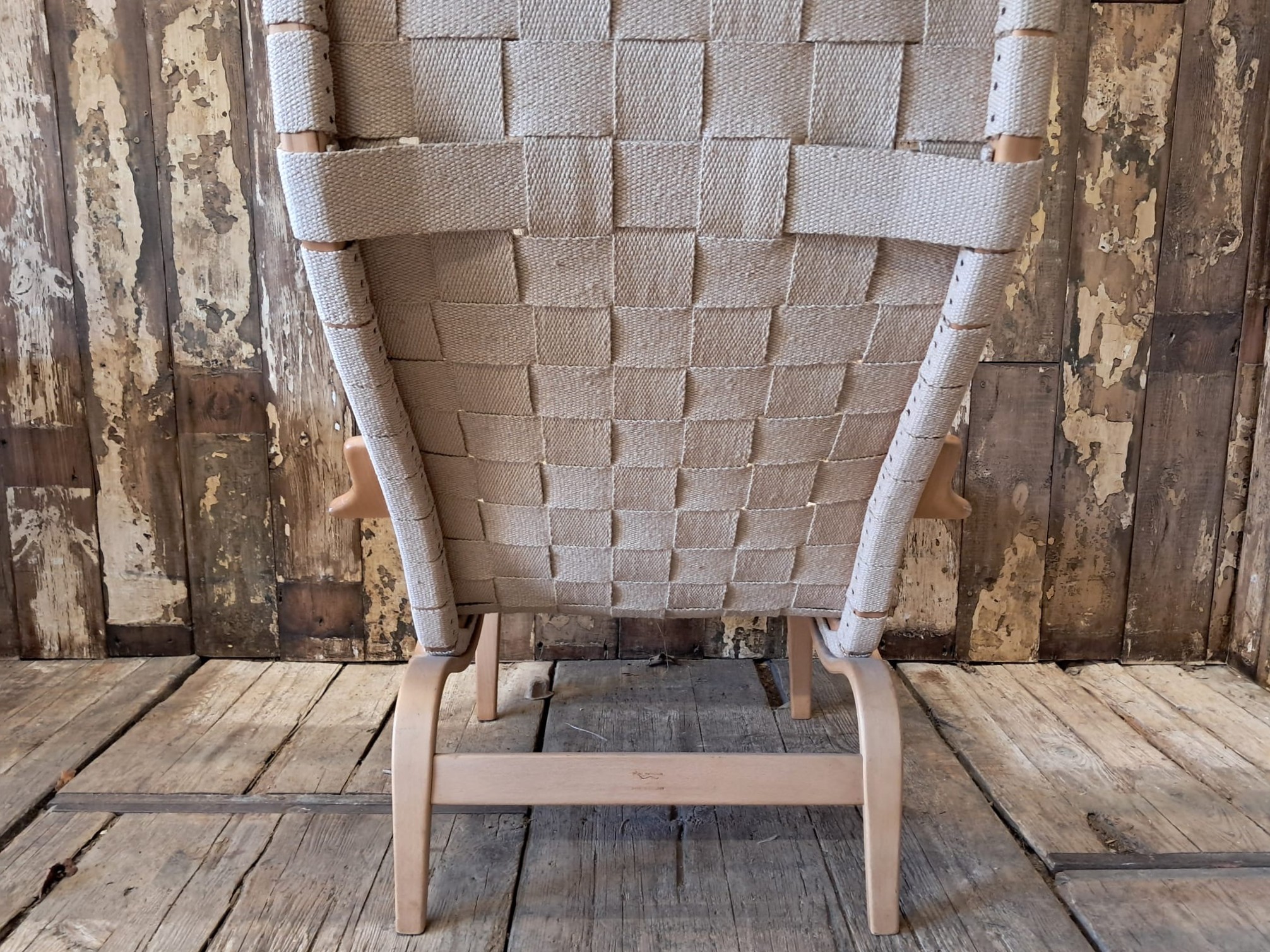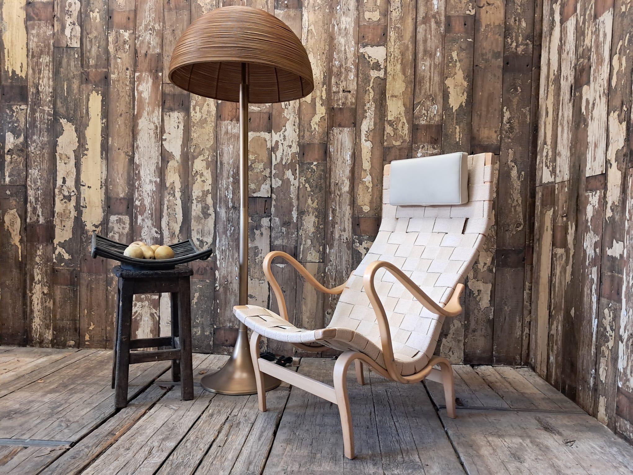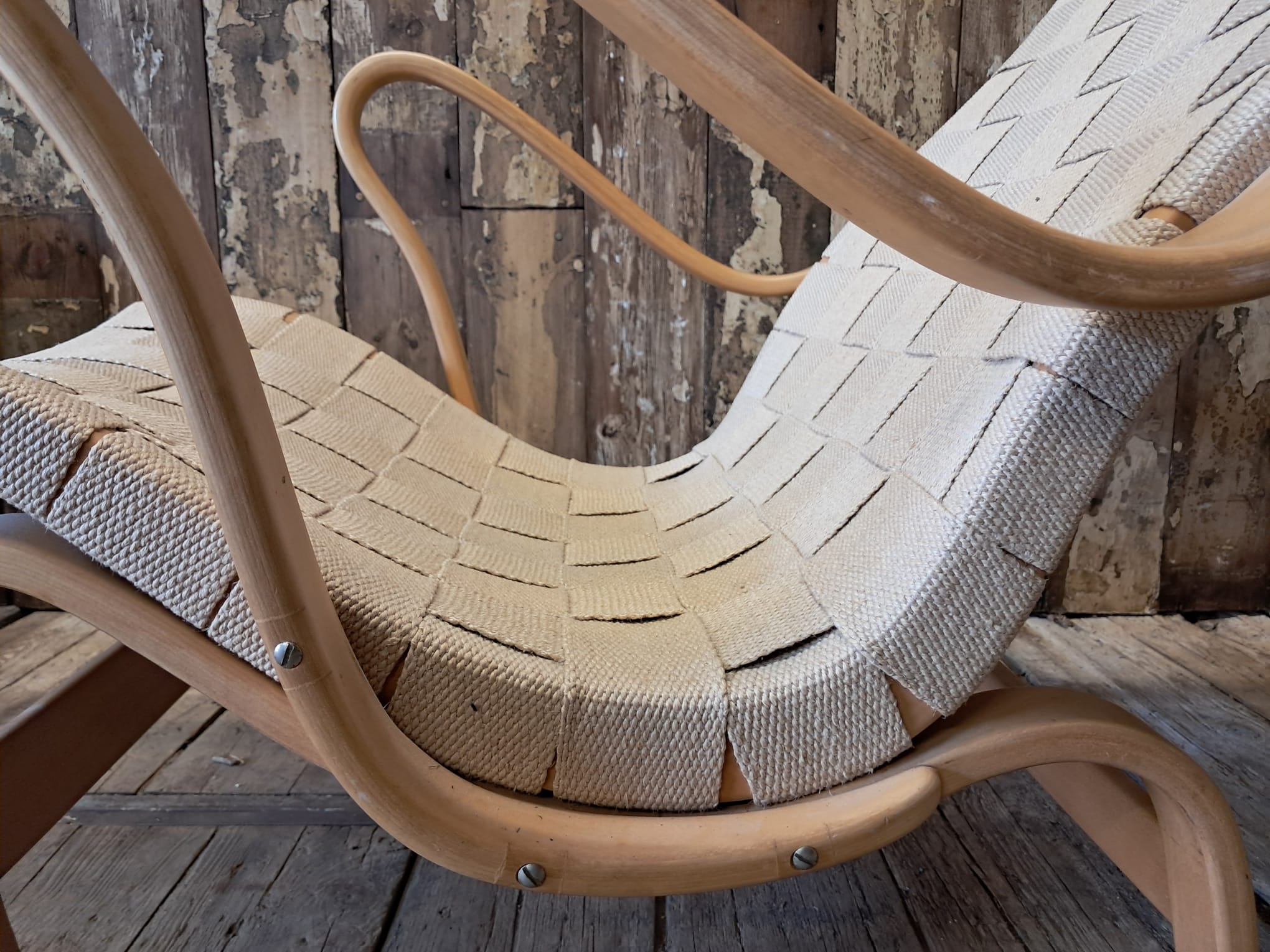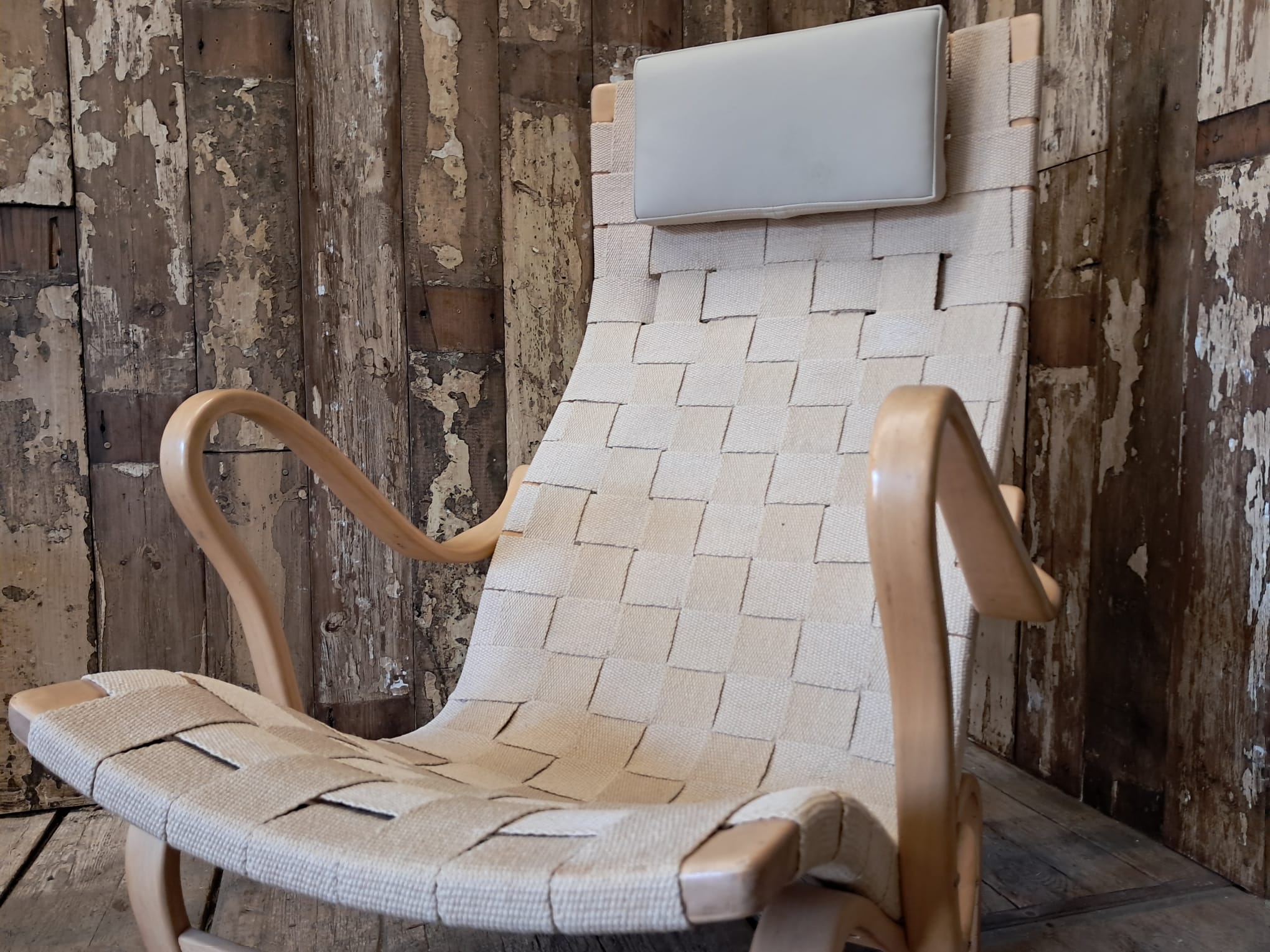 A Scandinavian modern classic, this piece showcases Mathsson’s signature steam-bent beech frame with upholstered natural cotton belt seating.