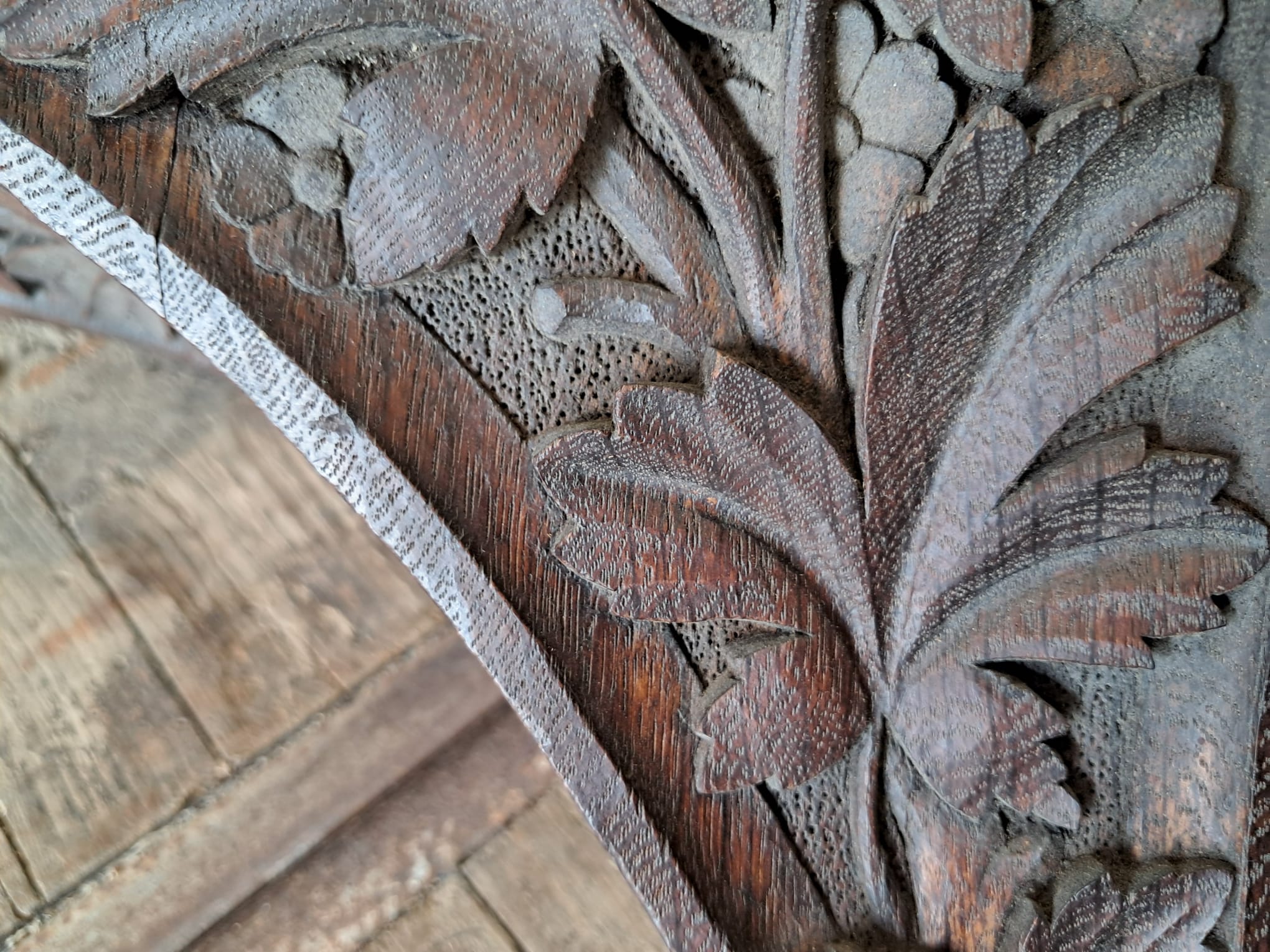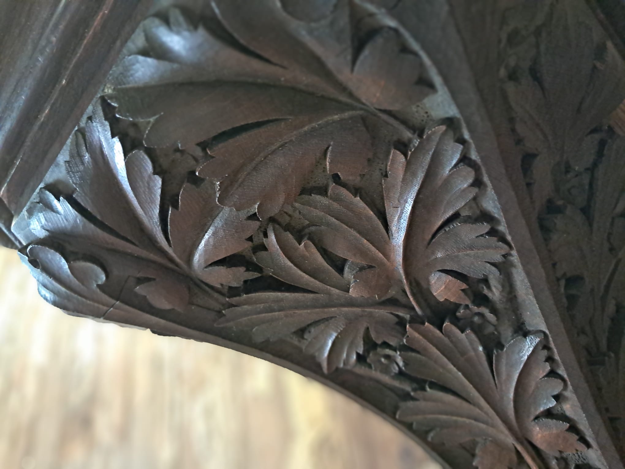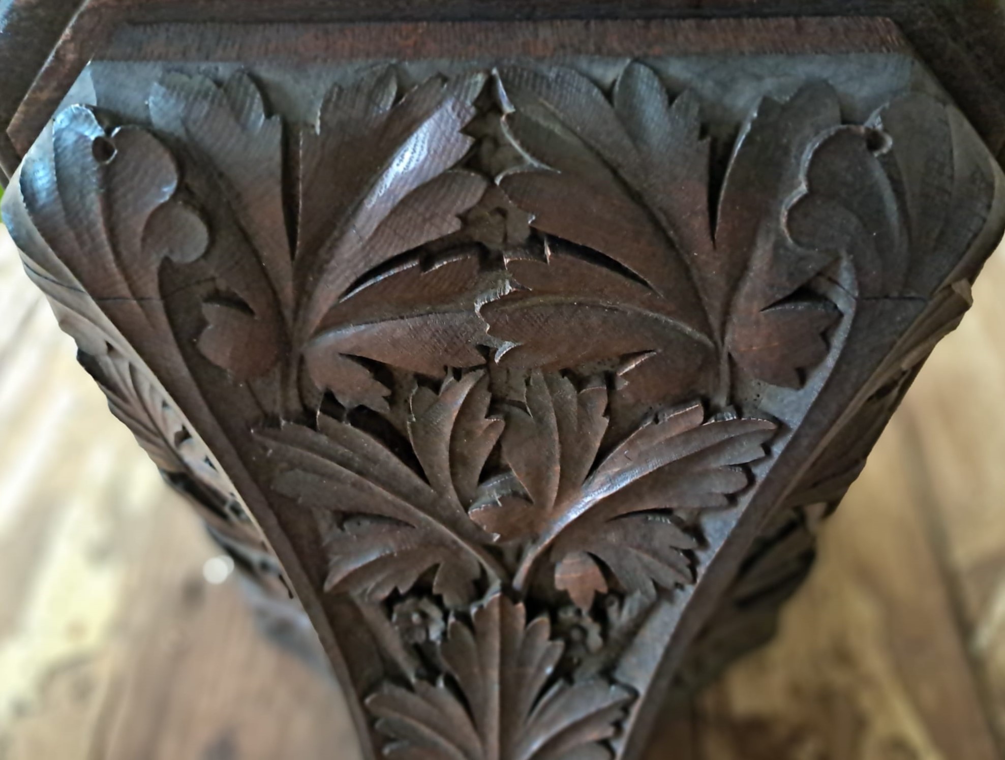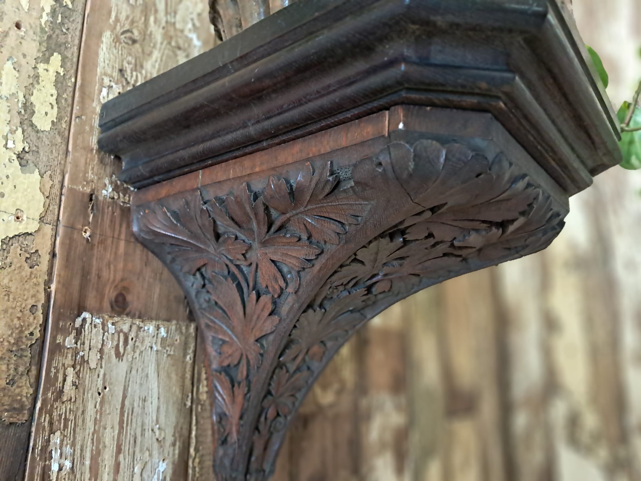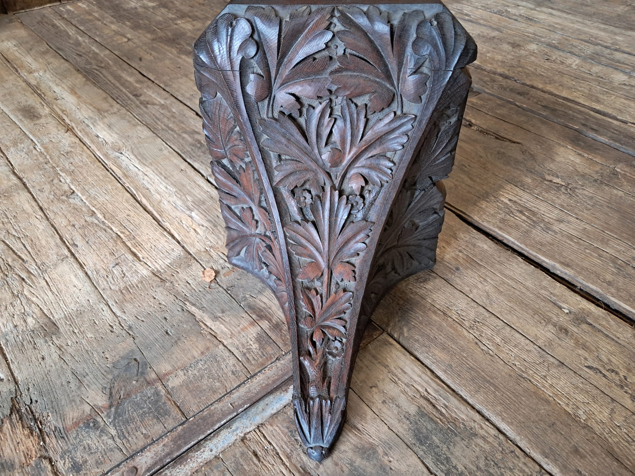 A large 19th century oak Gothic church corbel with hand-carved acanthus leaves.