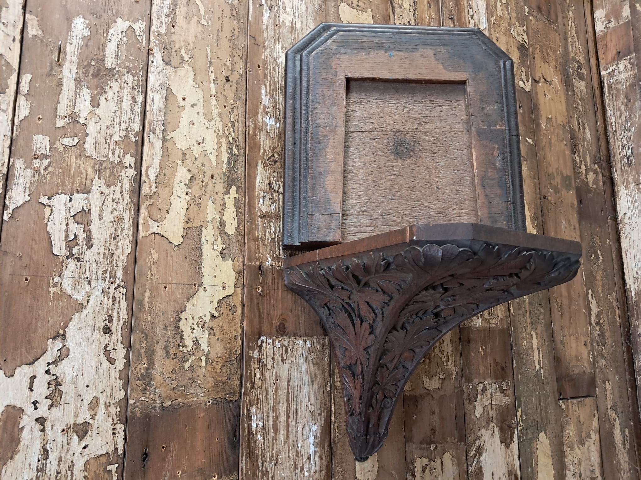 There are some superficial cracks (consistent with age) to the upper rim, but this top quality carved, solid oak 19th century Gothic bracket is a stunning statement piece.
