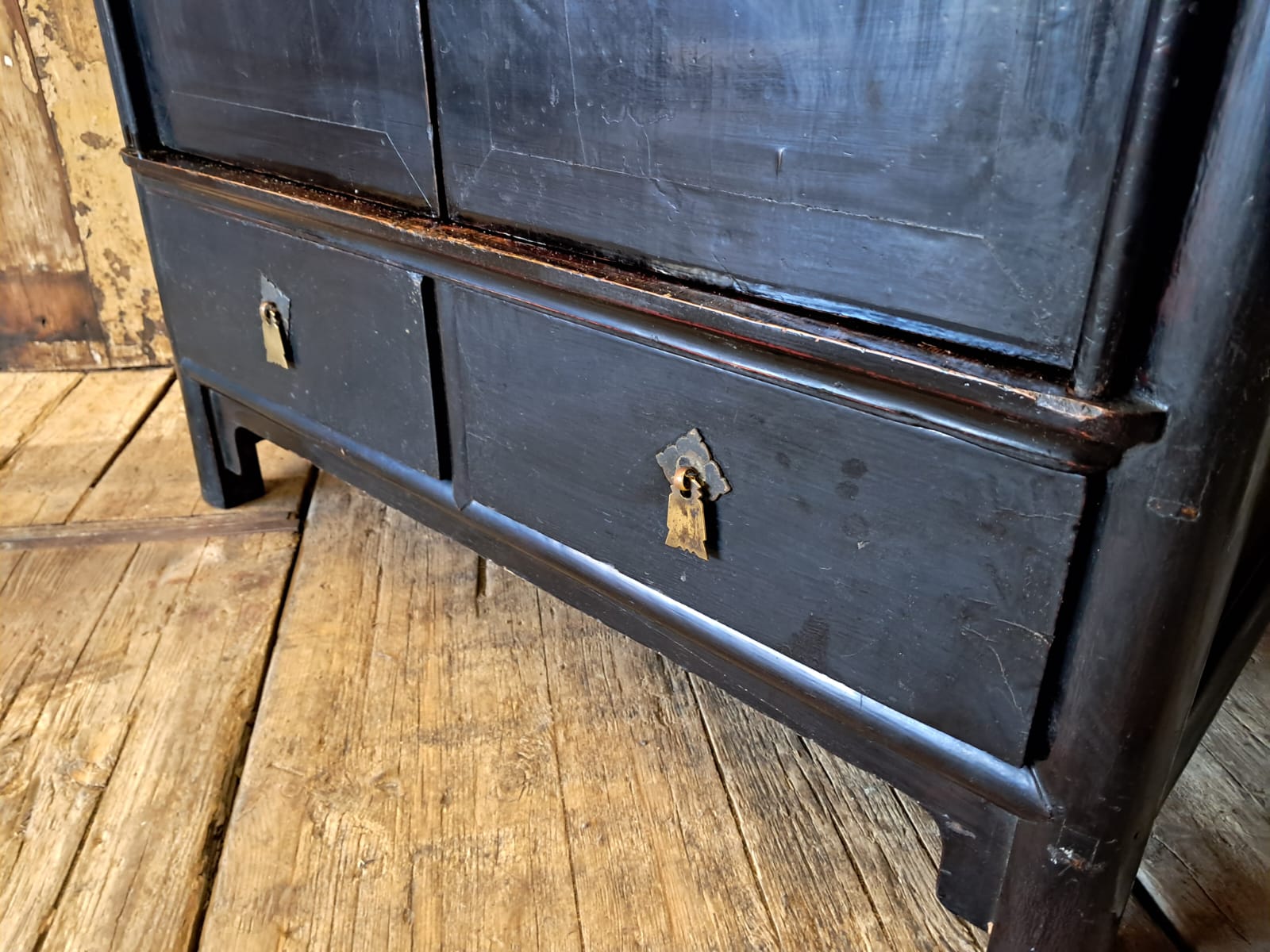 Typical simple box like, square-cornered style, with heavy brass hinges and circular door hardware synonymous with oriental design.