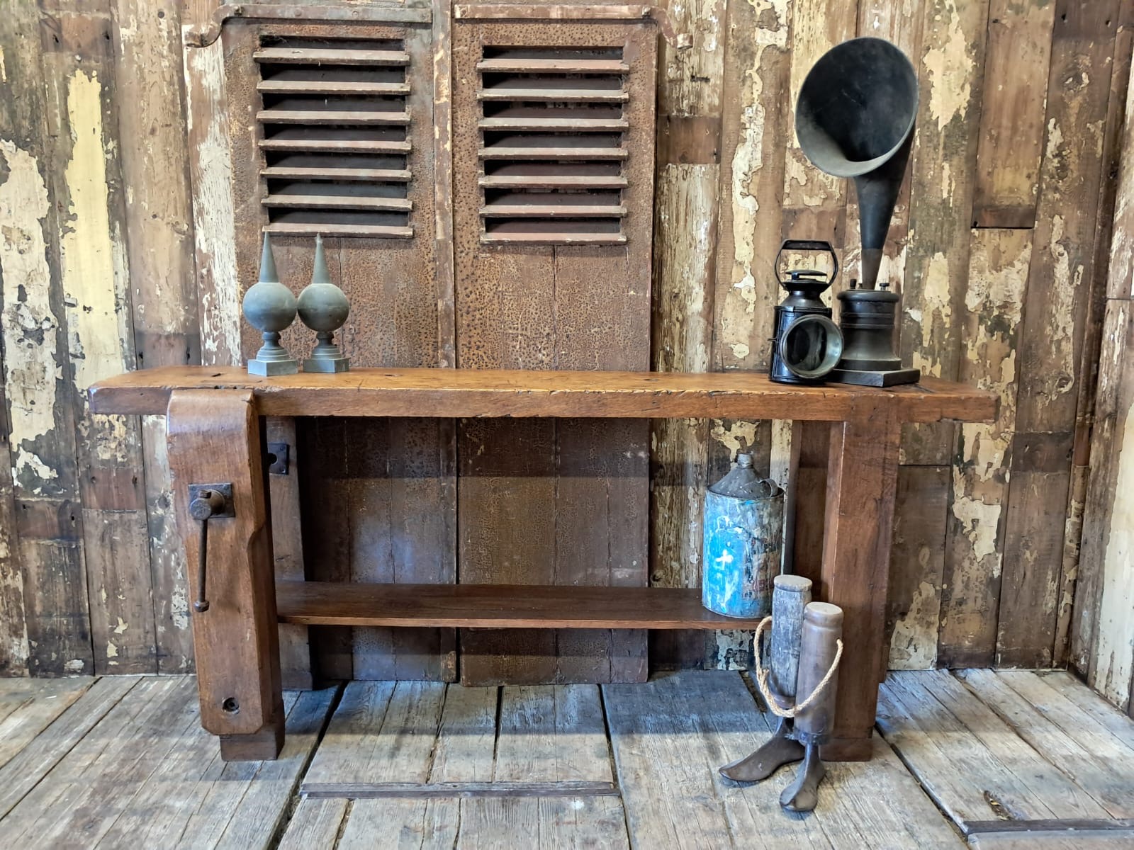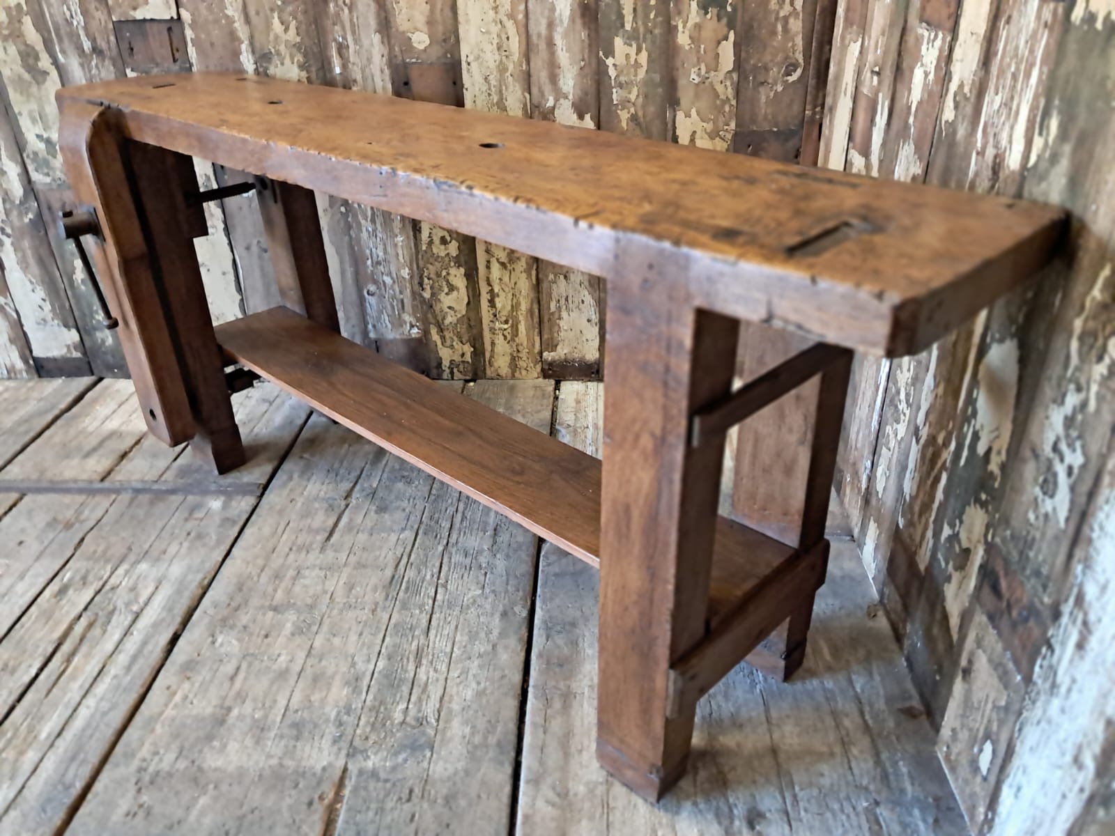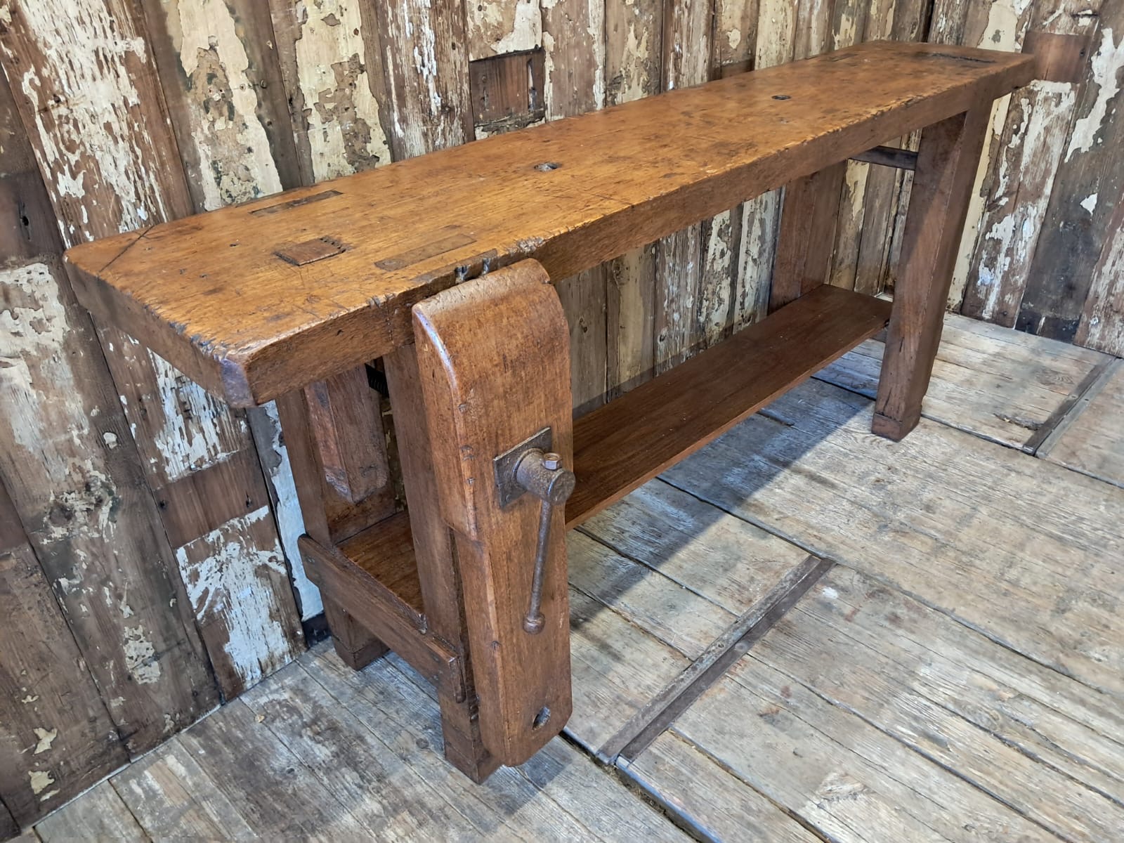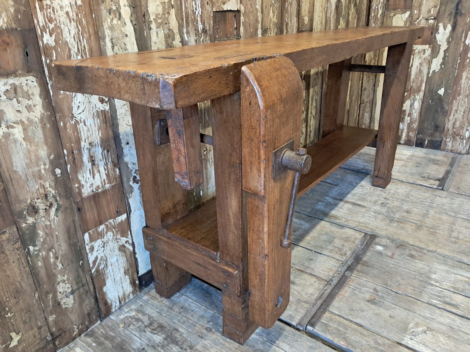 A classic French carpenters workbench complete with original robust vice and display base.