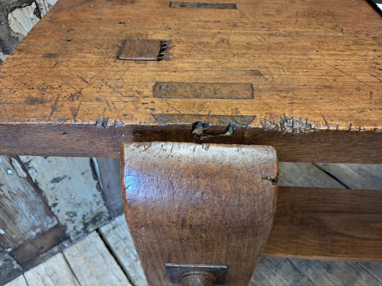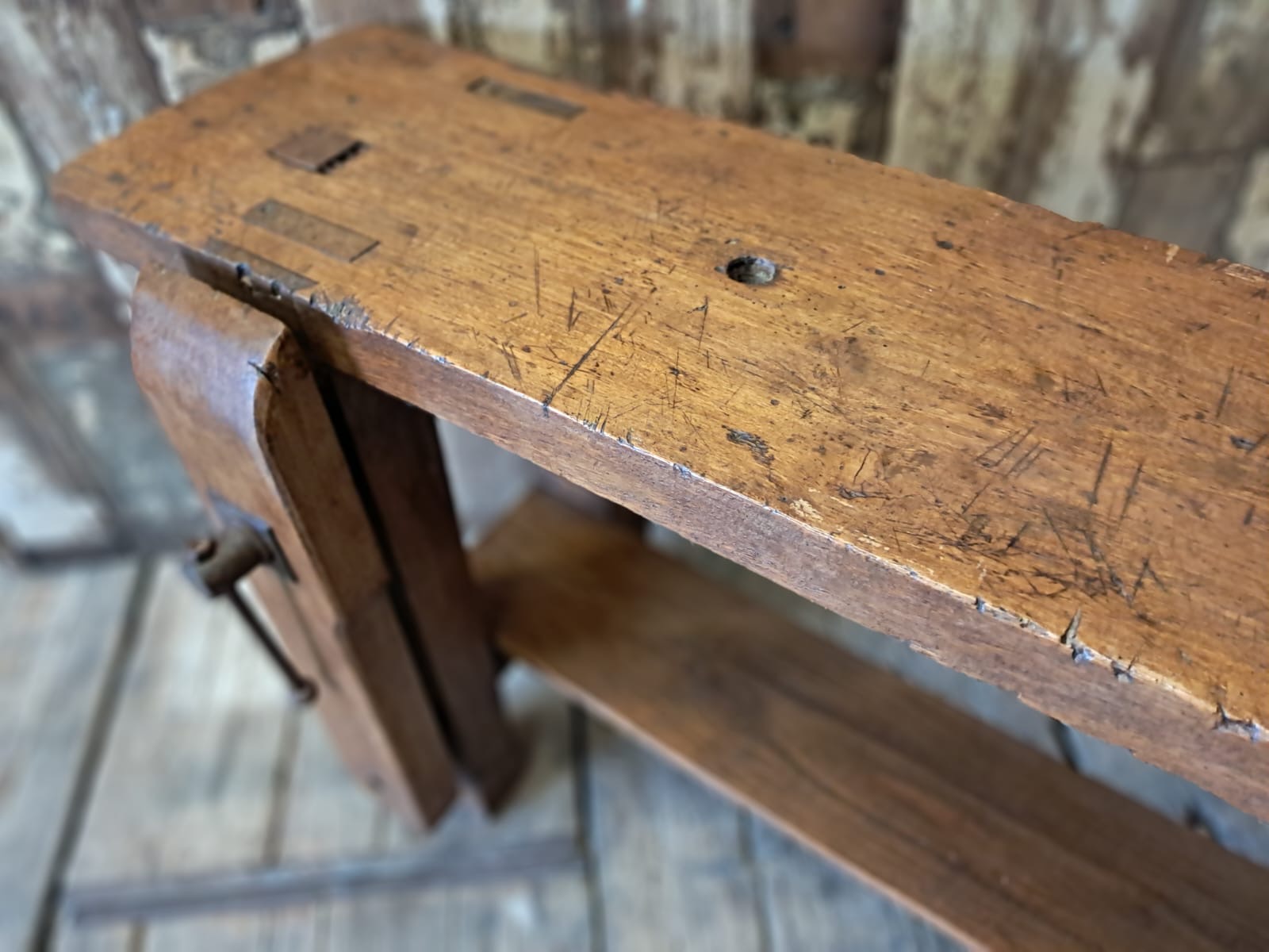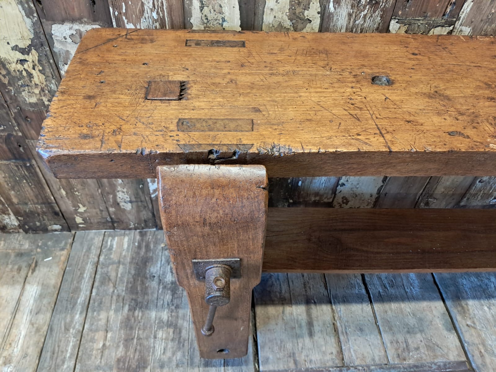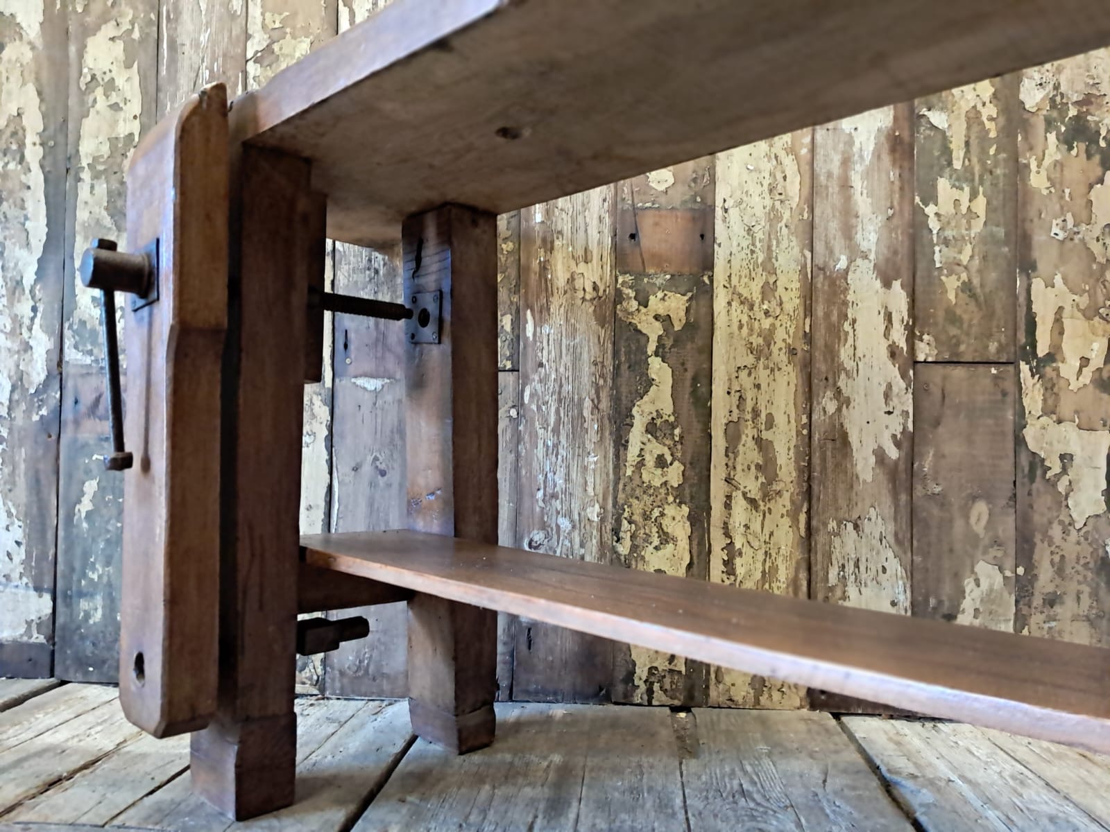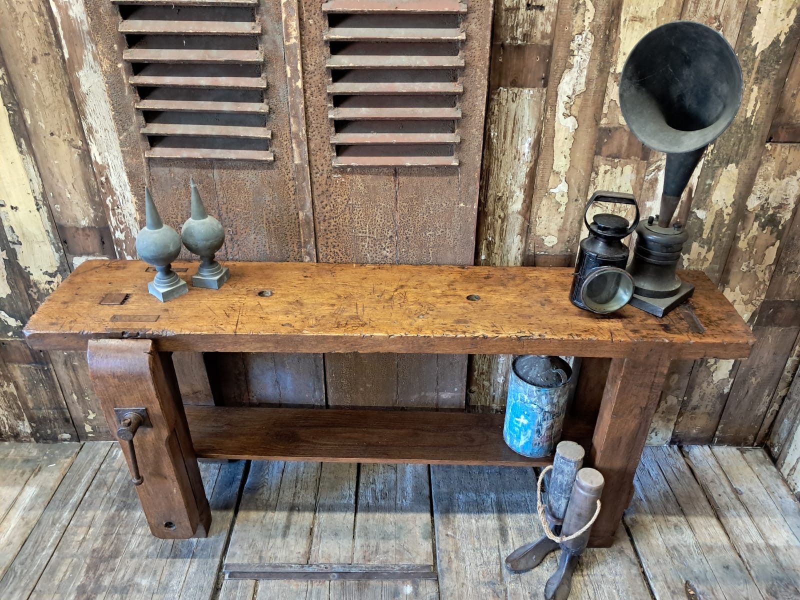 A classic French carpenters workbench complete with original robust vice and display base.