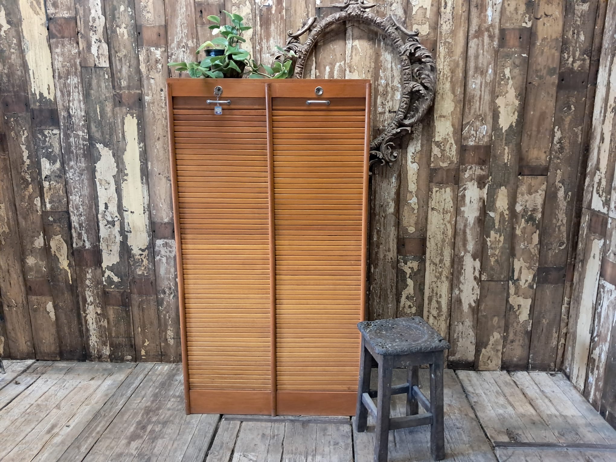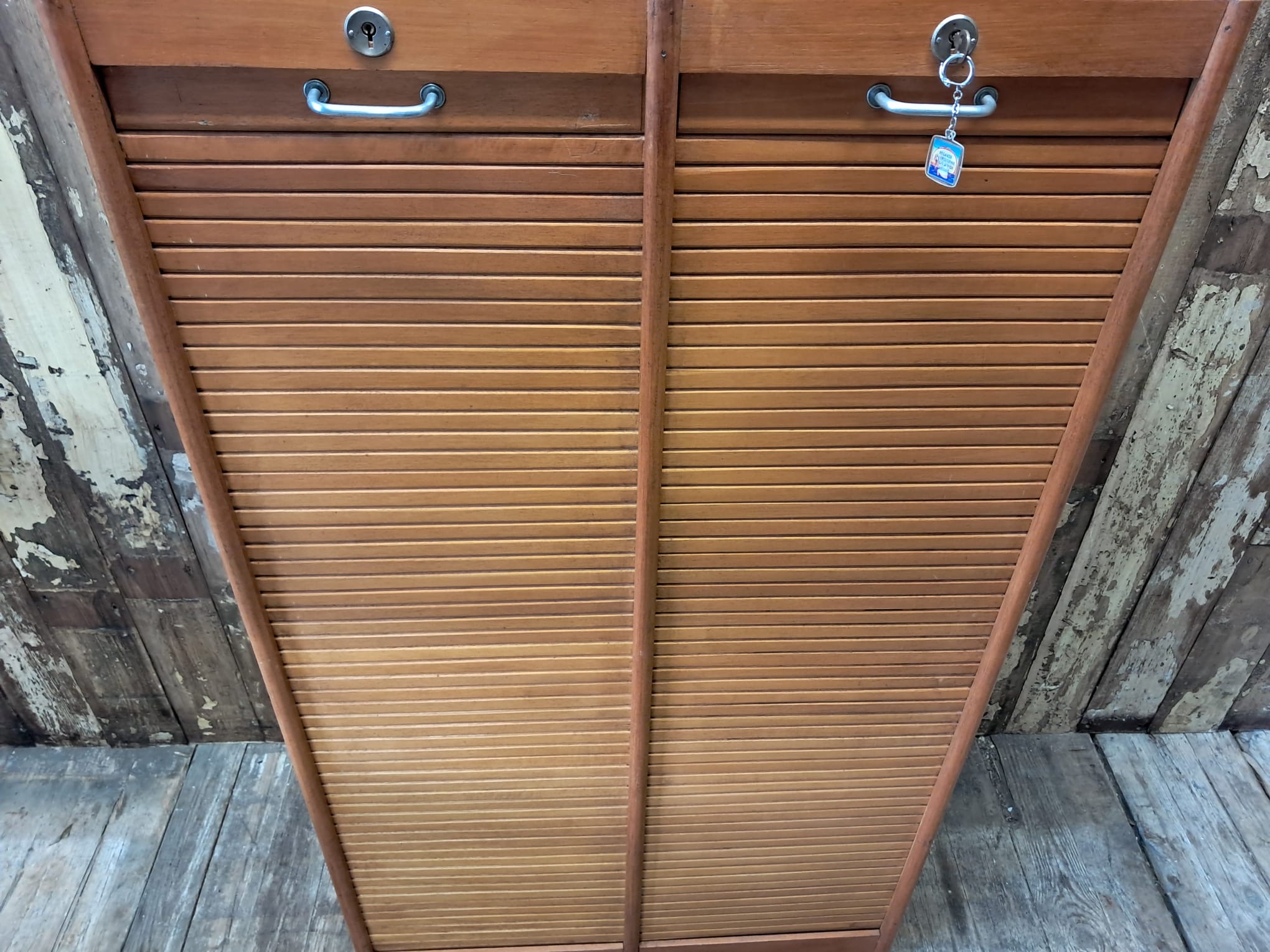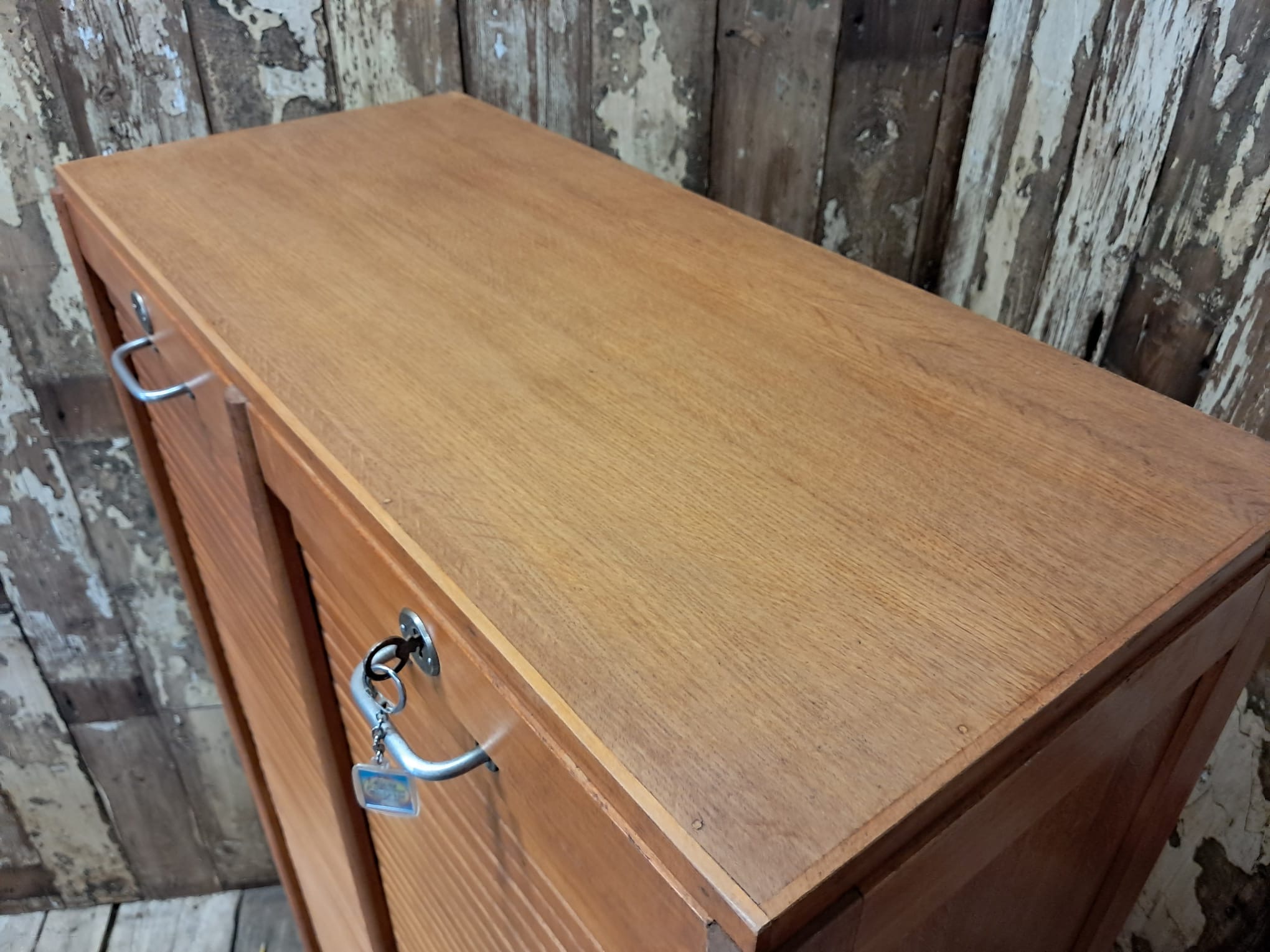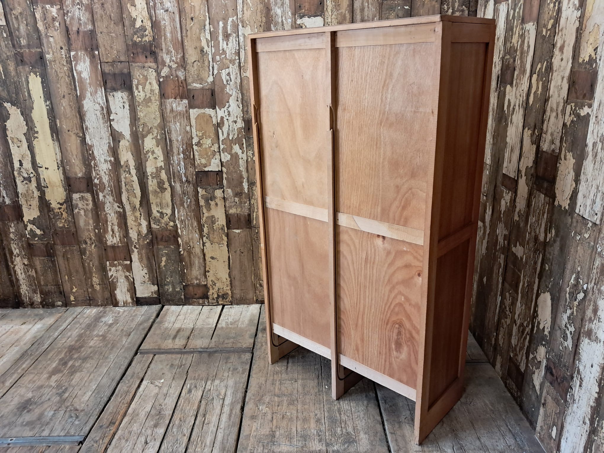 It has original working turn and drop locks and both doors work extremely well – a super storage piece for office or clothes or linens.