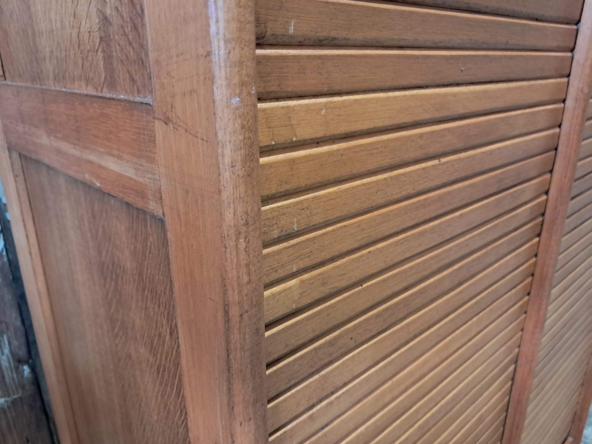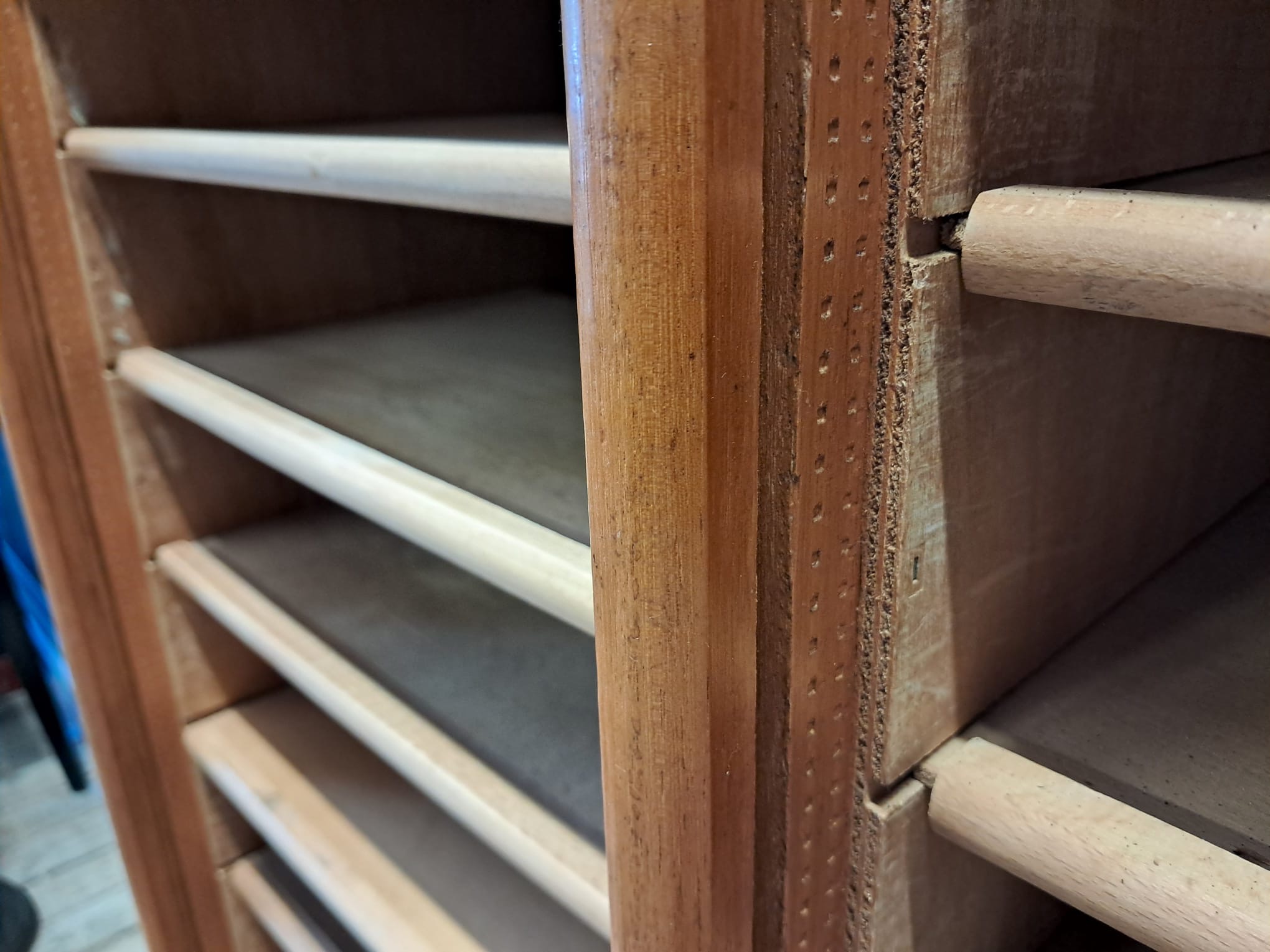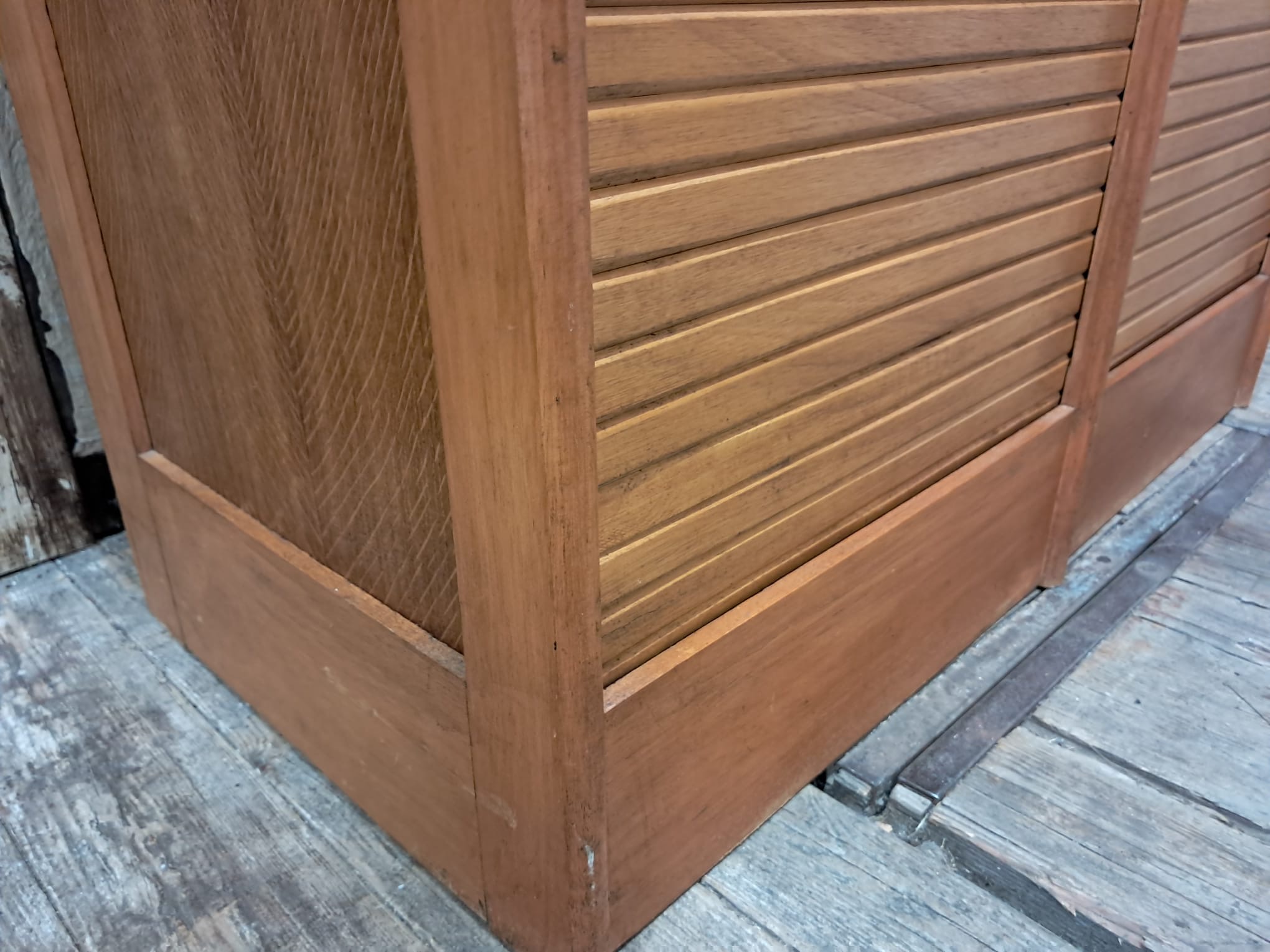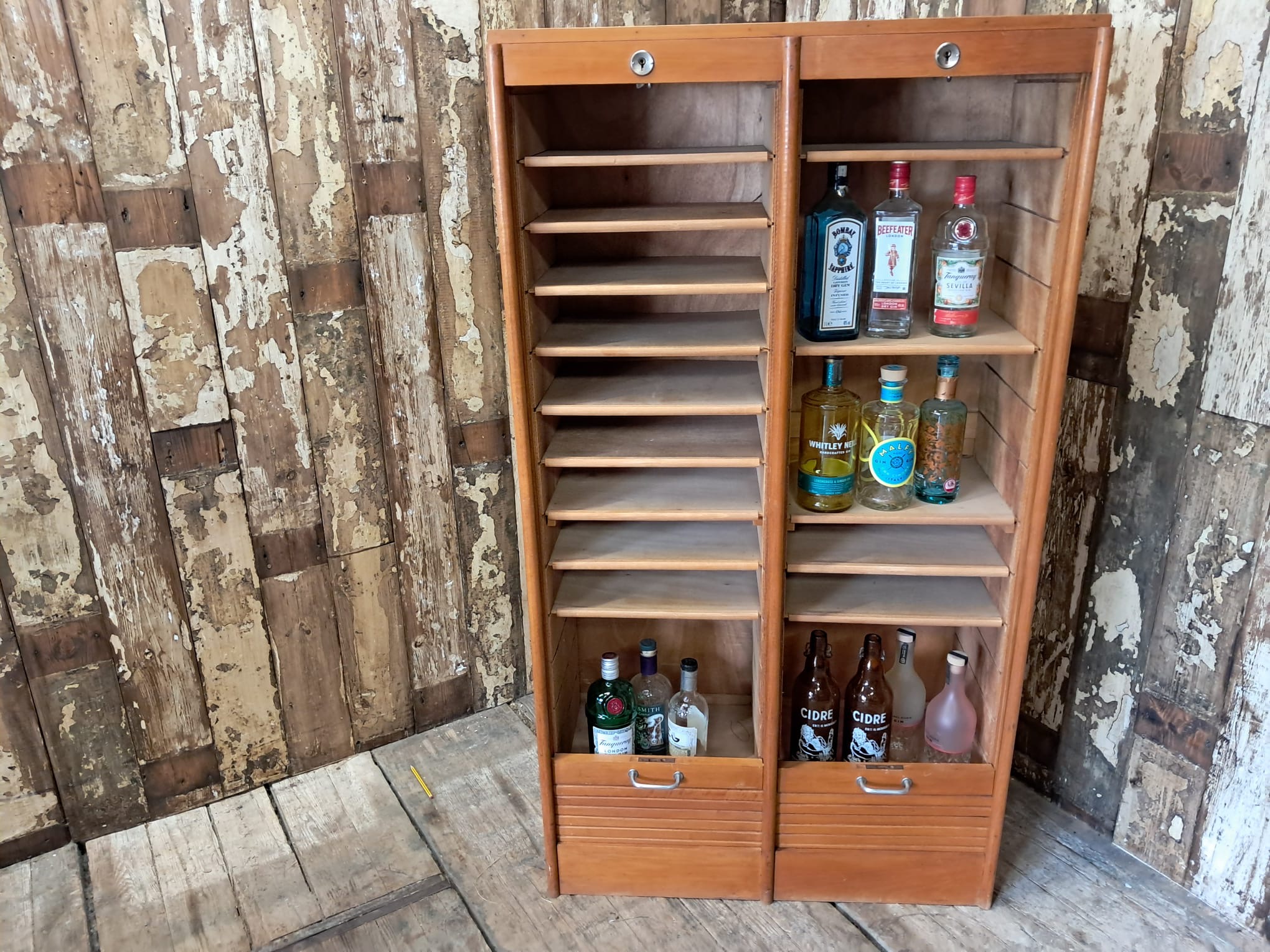 It has original working turn and drop locks and both doors work extremely well – a super storage piece for office or clothes or linens.