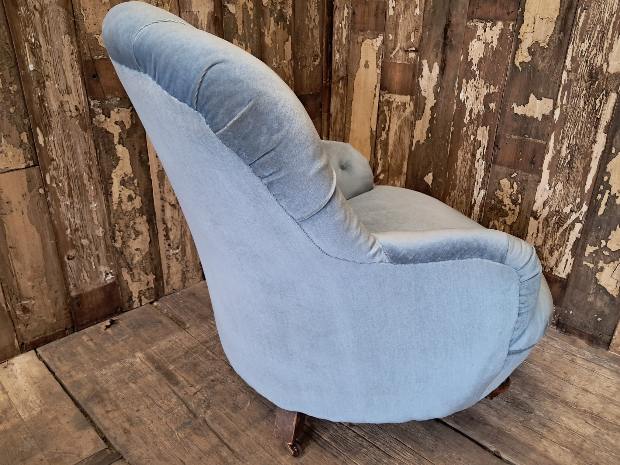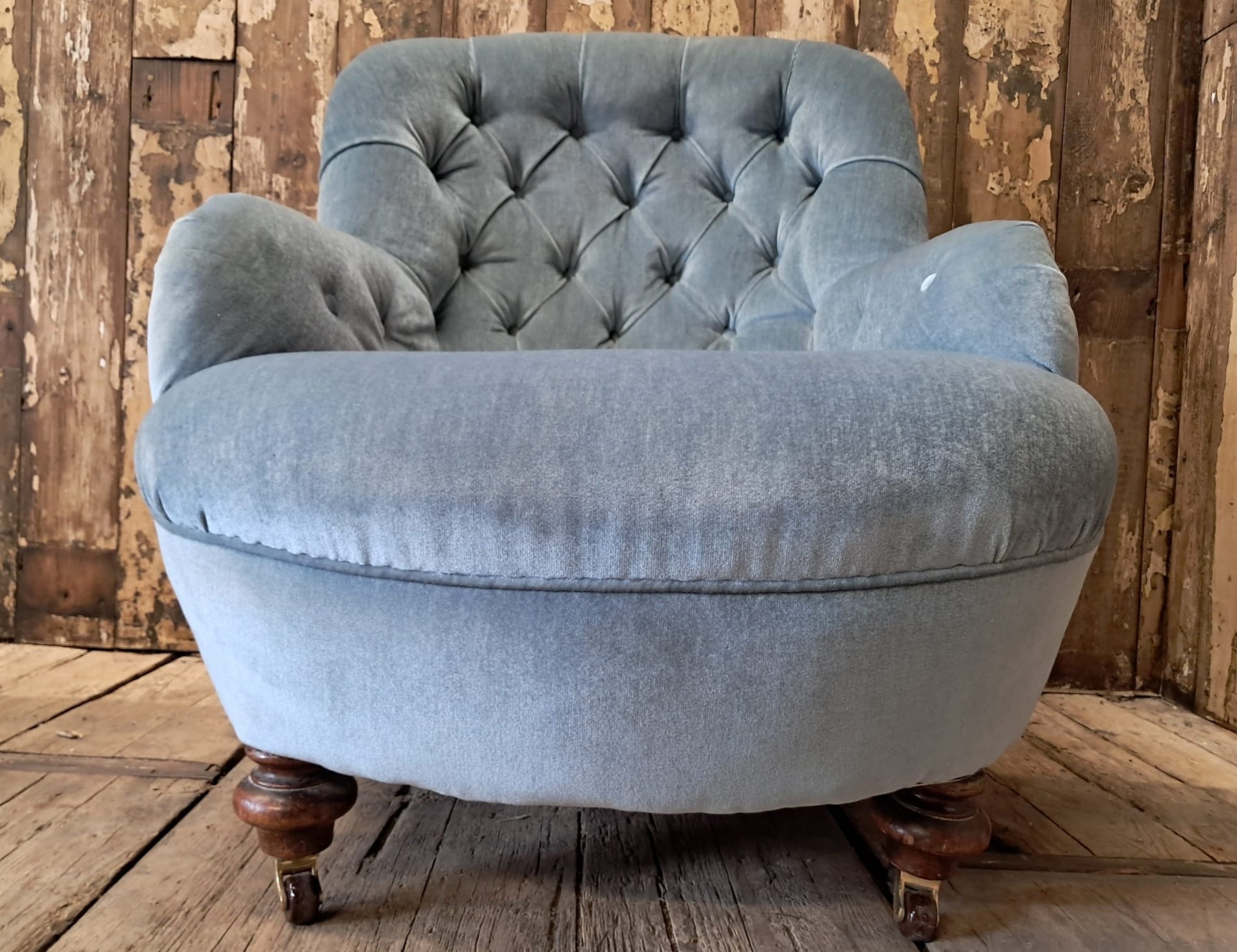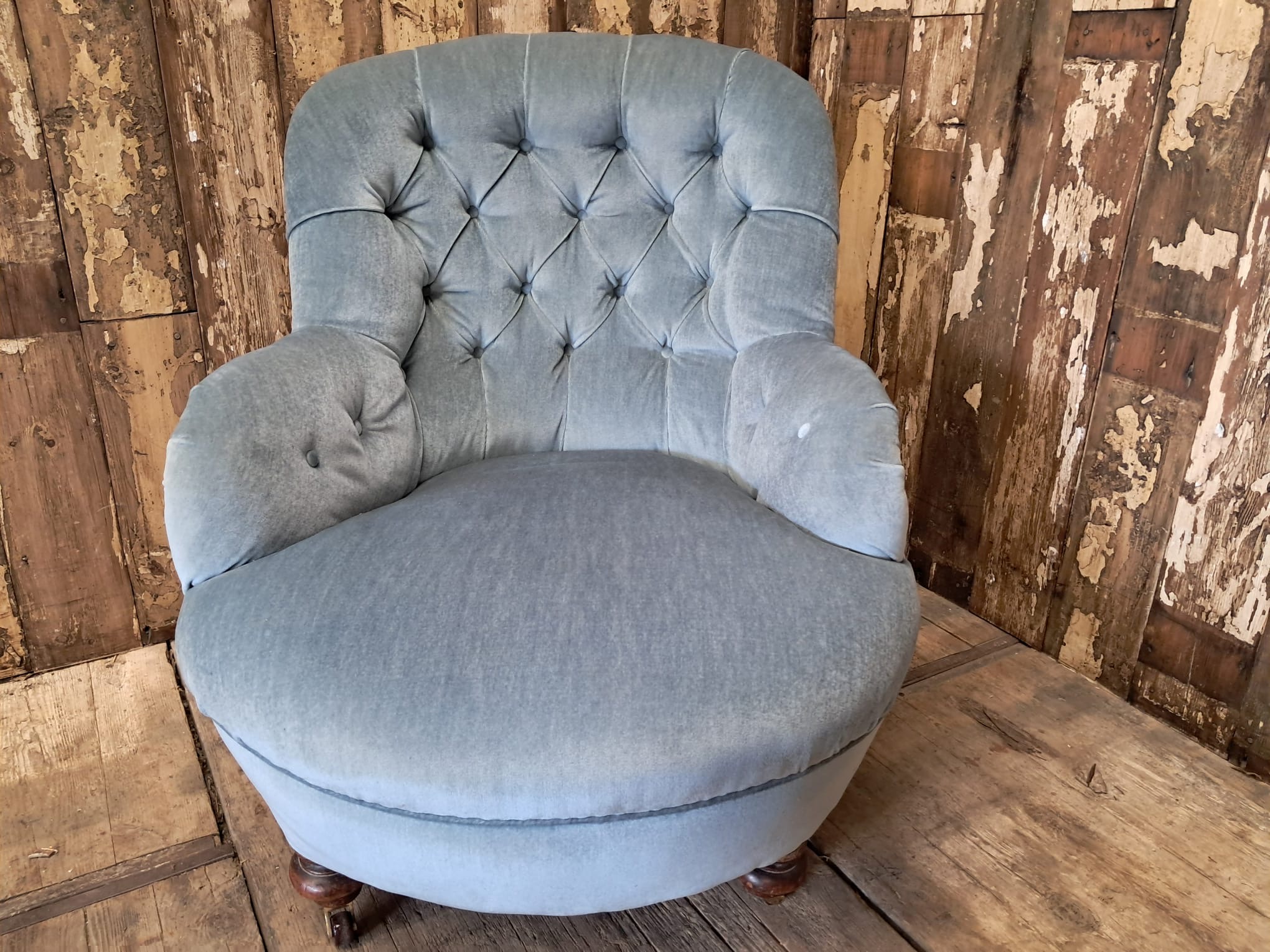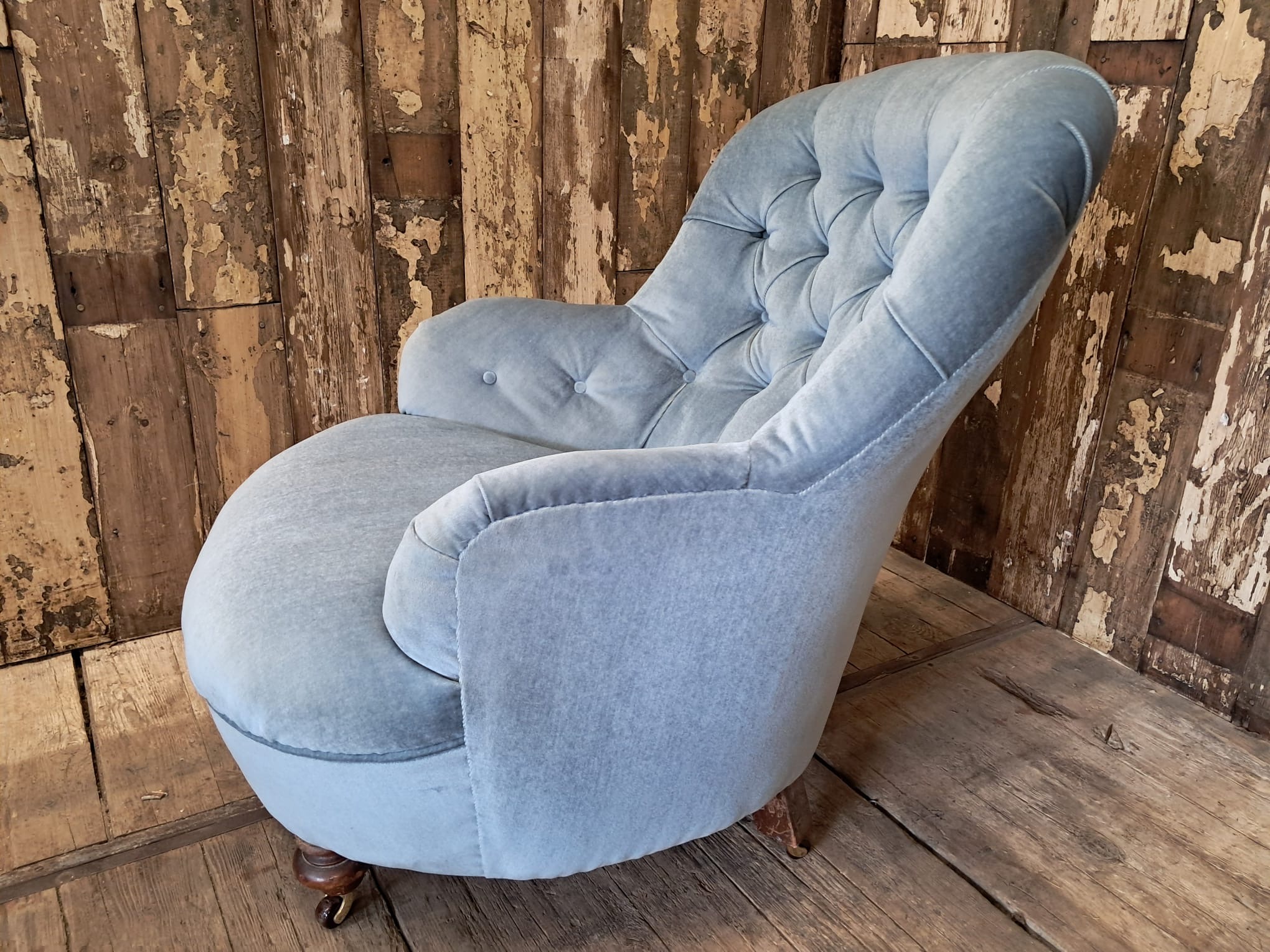 The chair is horse hair filled and has been reupholstered in the 70’s with a dusty blue velvet fabric that enhances the style of the chair while giving it a modern edge.