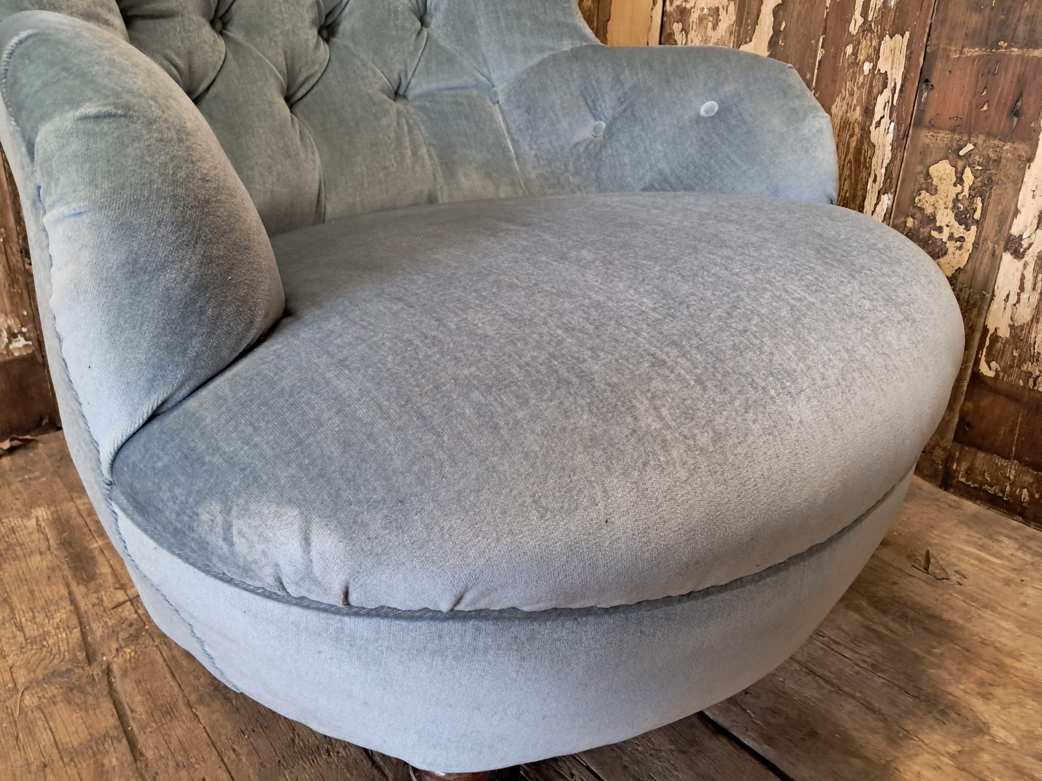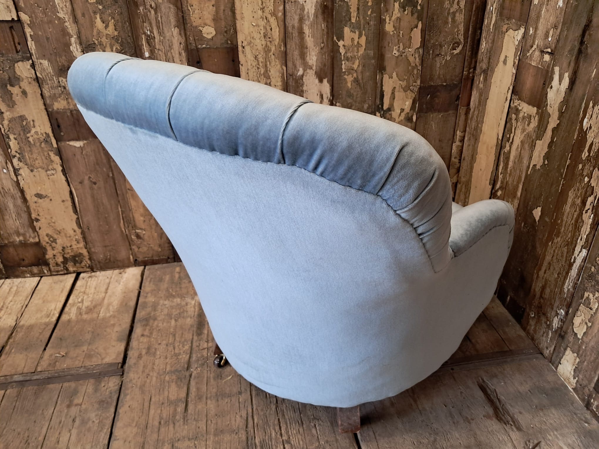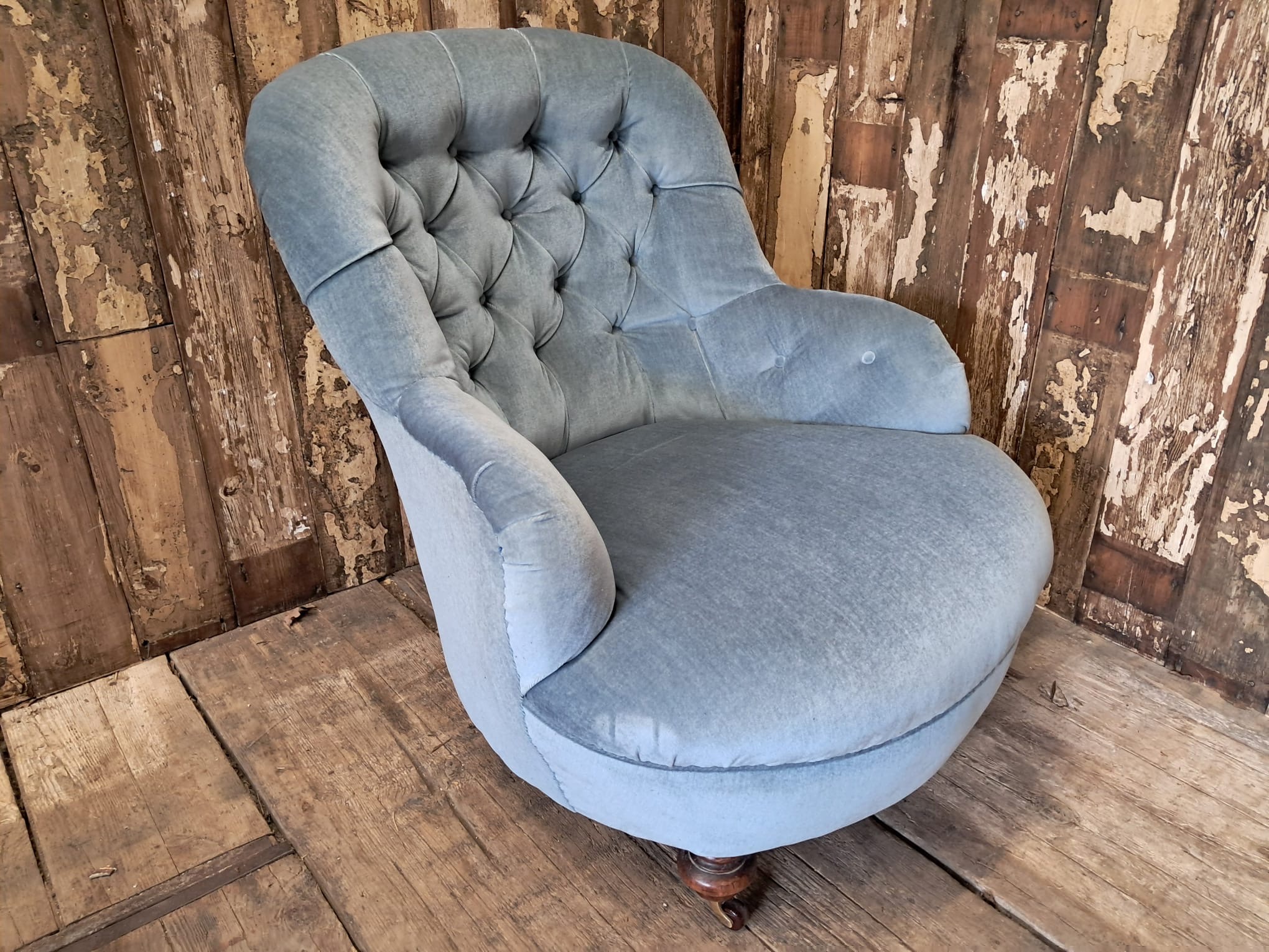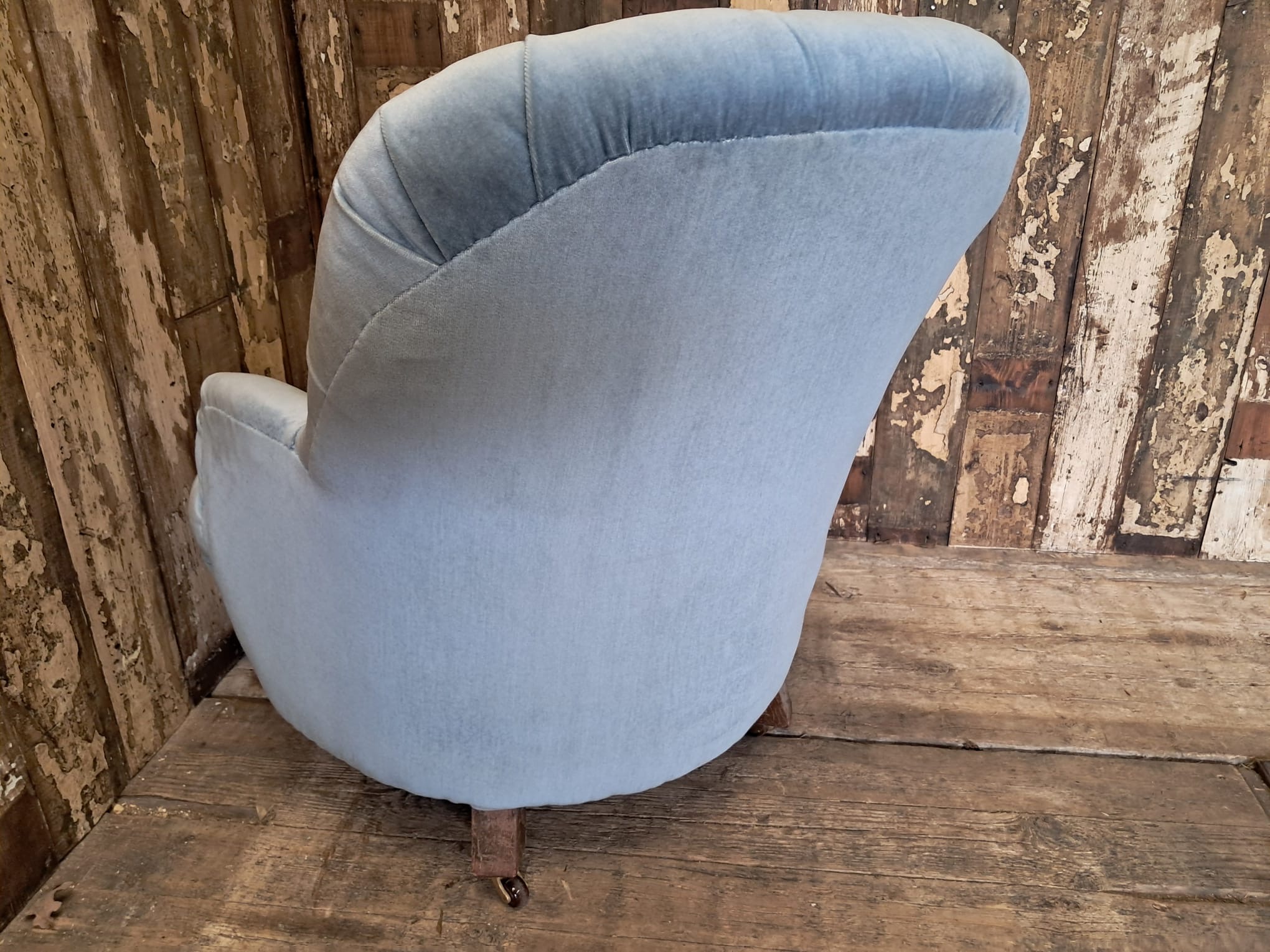 The chair is horse hair filled and has been reupholstered in the 70’s with a dusty blue velvet fabric that enhances the style of the chair while giving it a modern edge.
