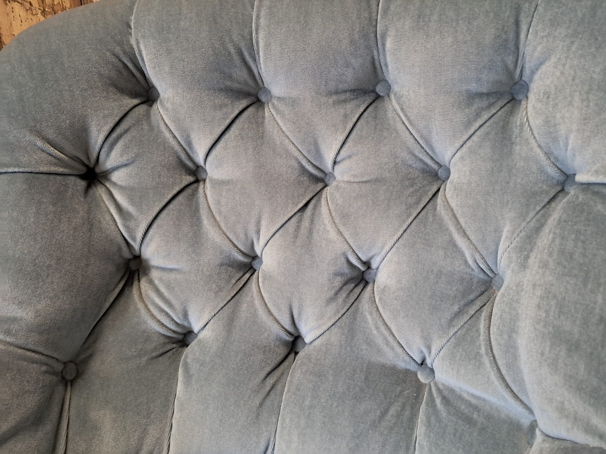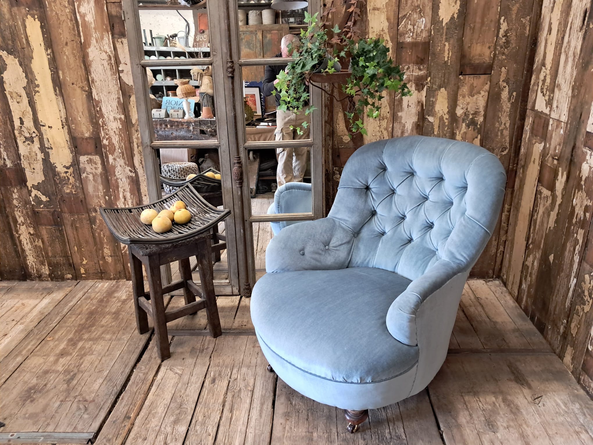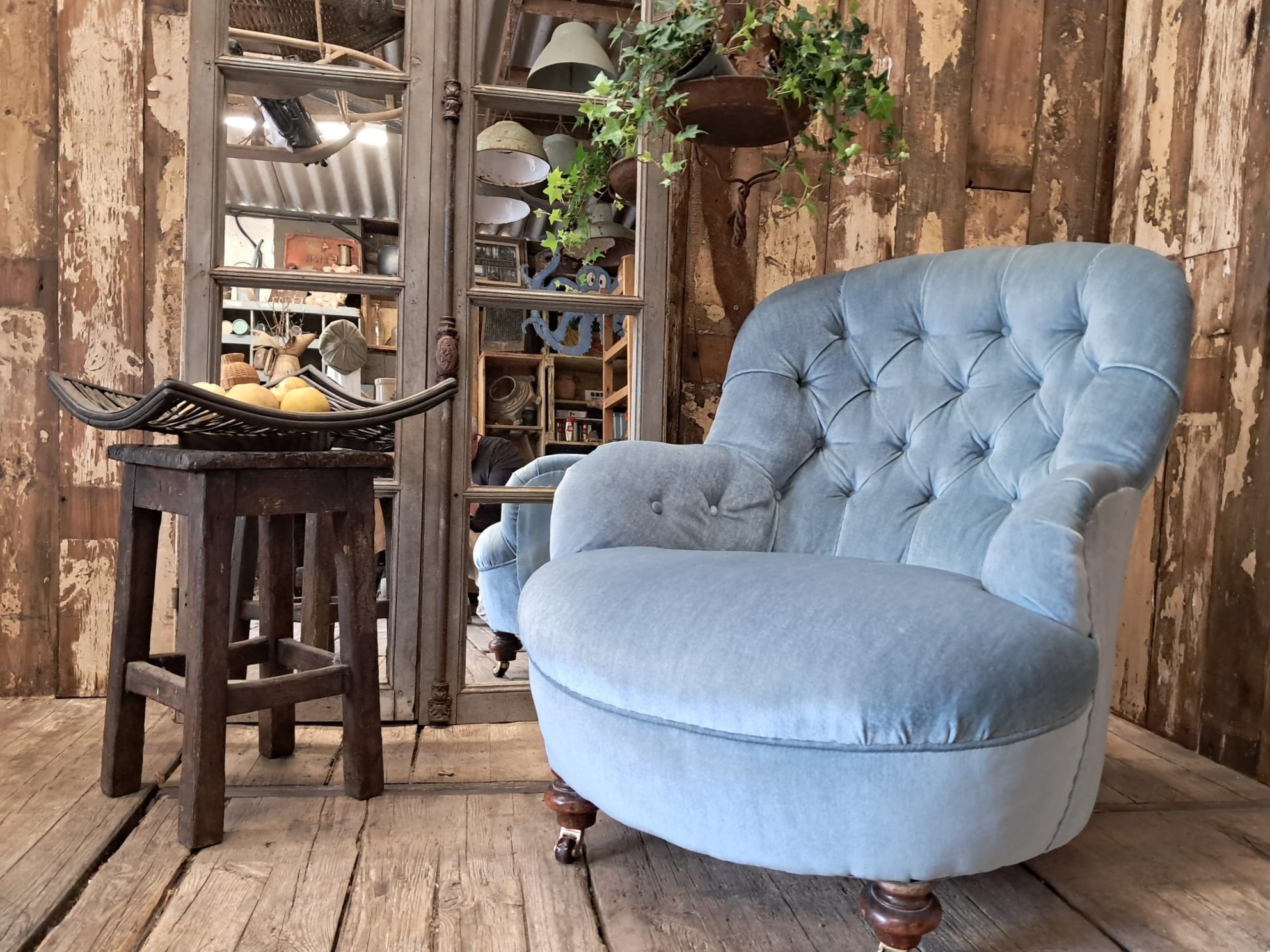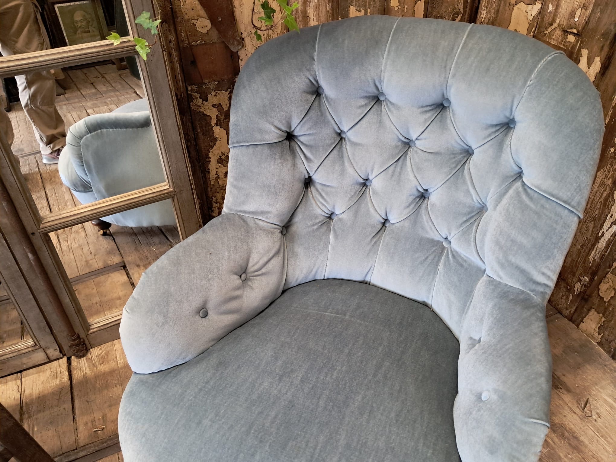 The chair is horse hair filled and has been reupholstered in the 70’s with a dusty blue velvet fabric that enhances the style of the chair while giving it a modern edge.