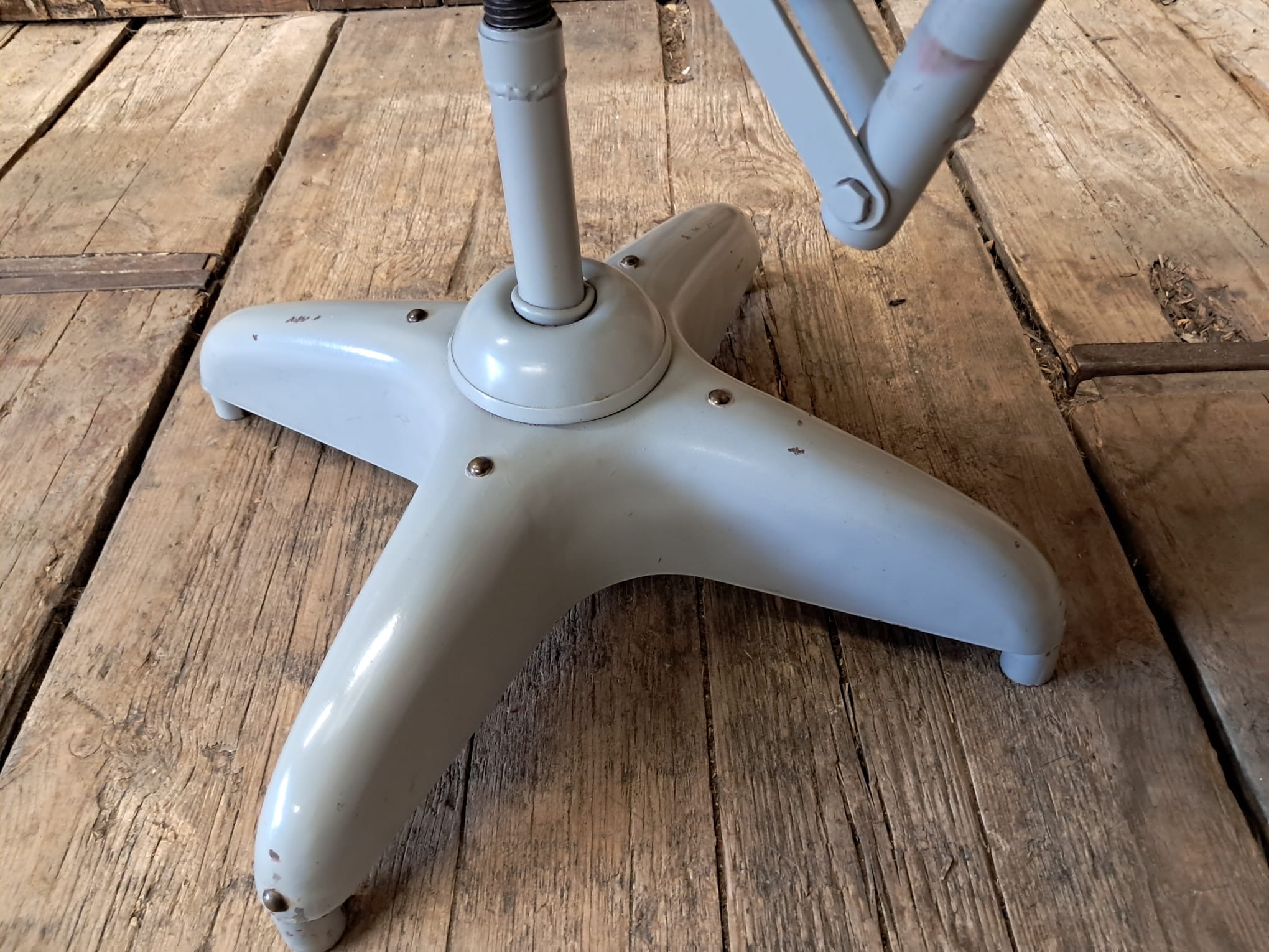 A mid century factory chair with steel frame and legs in mid grey and black vinyl seat pad and back rest.