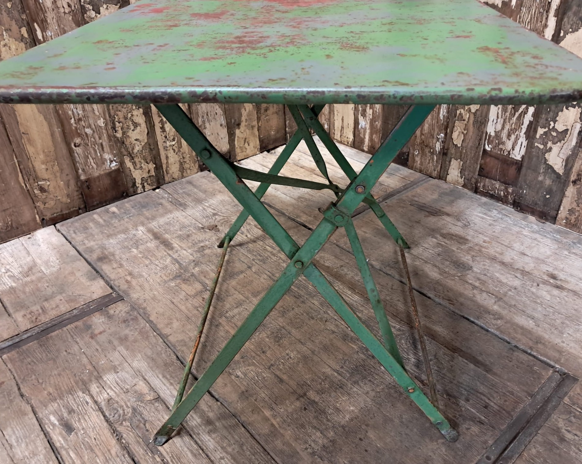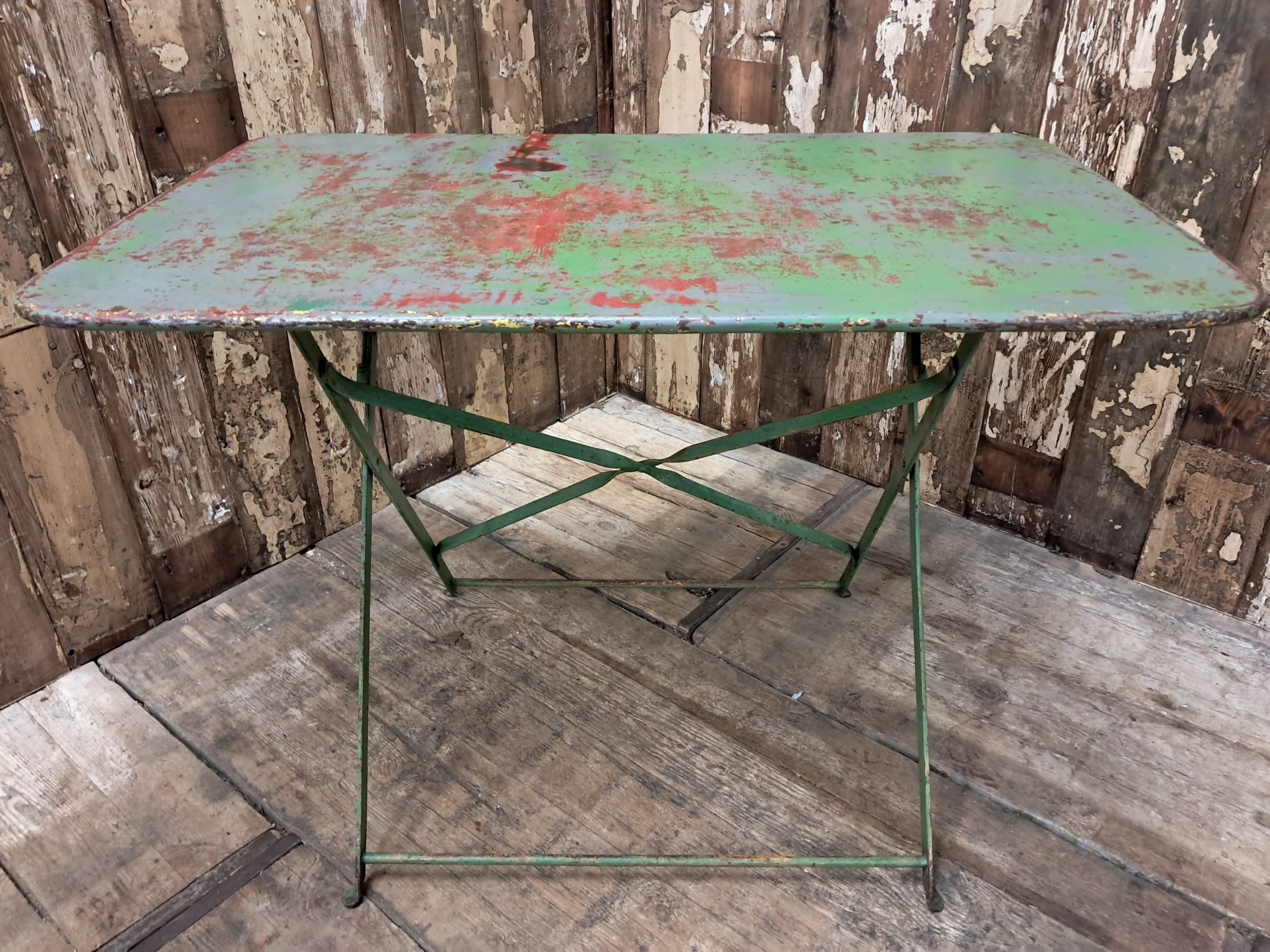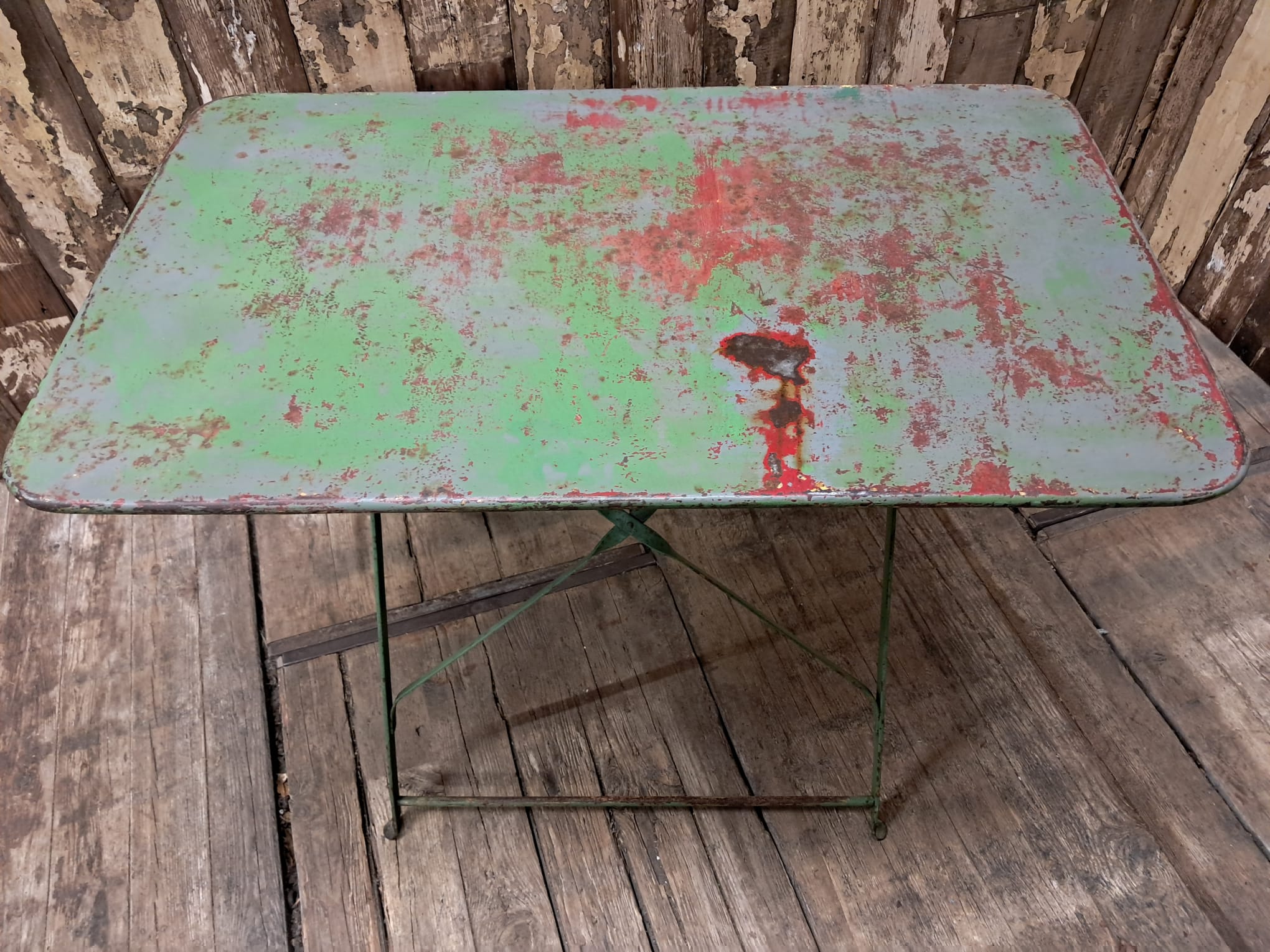 A rectangular metal bistro table with authentic red and green patina.