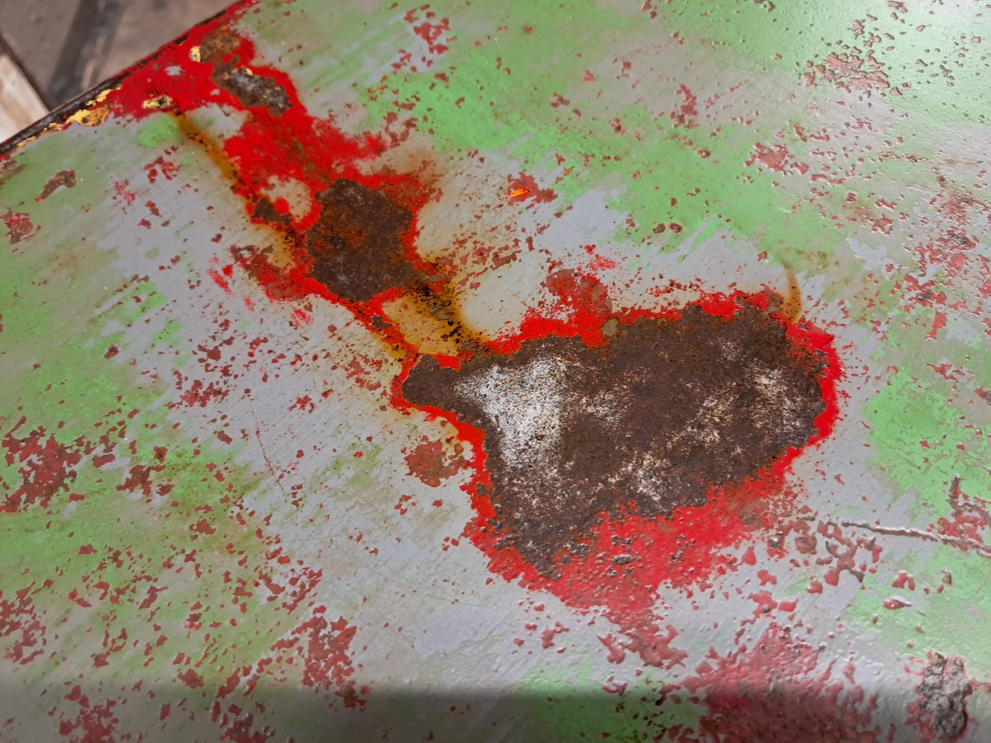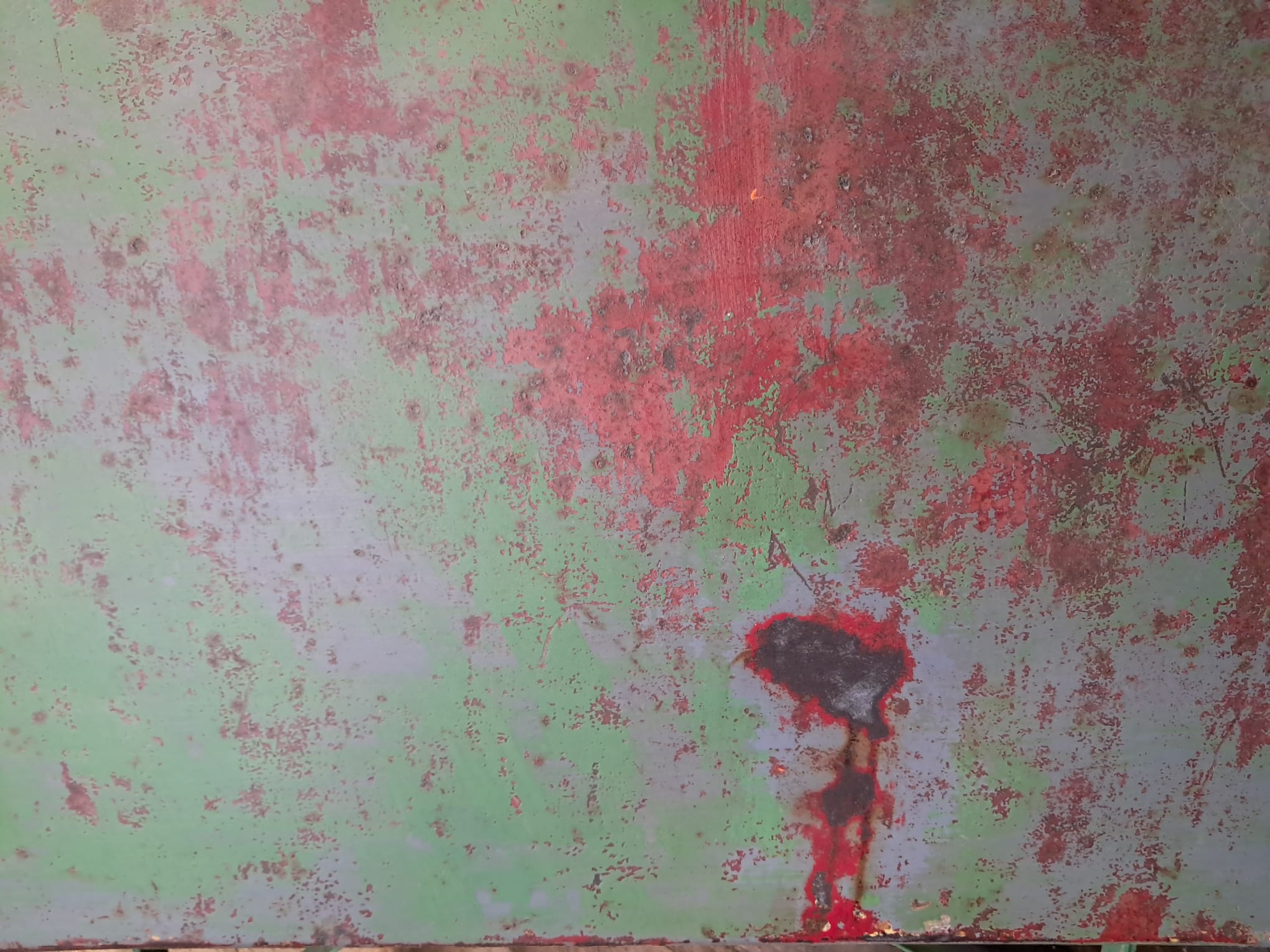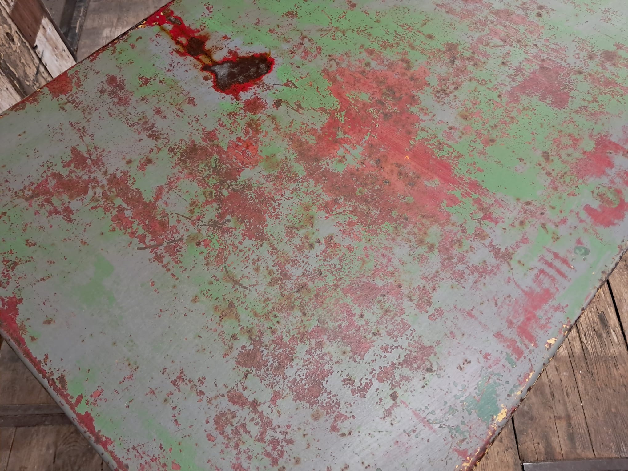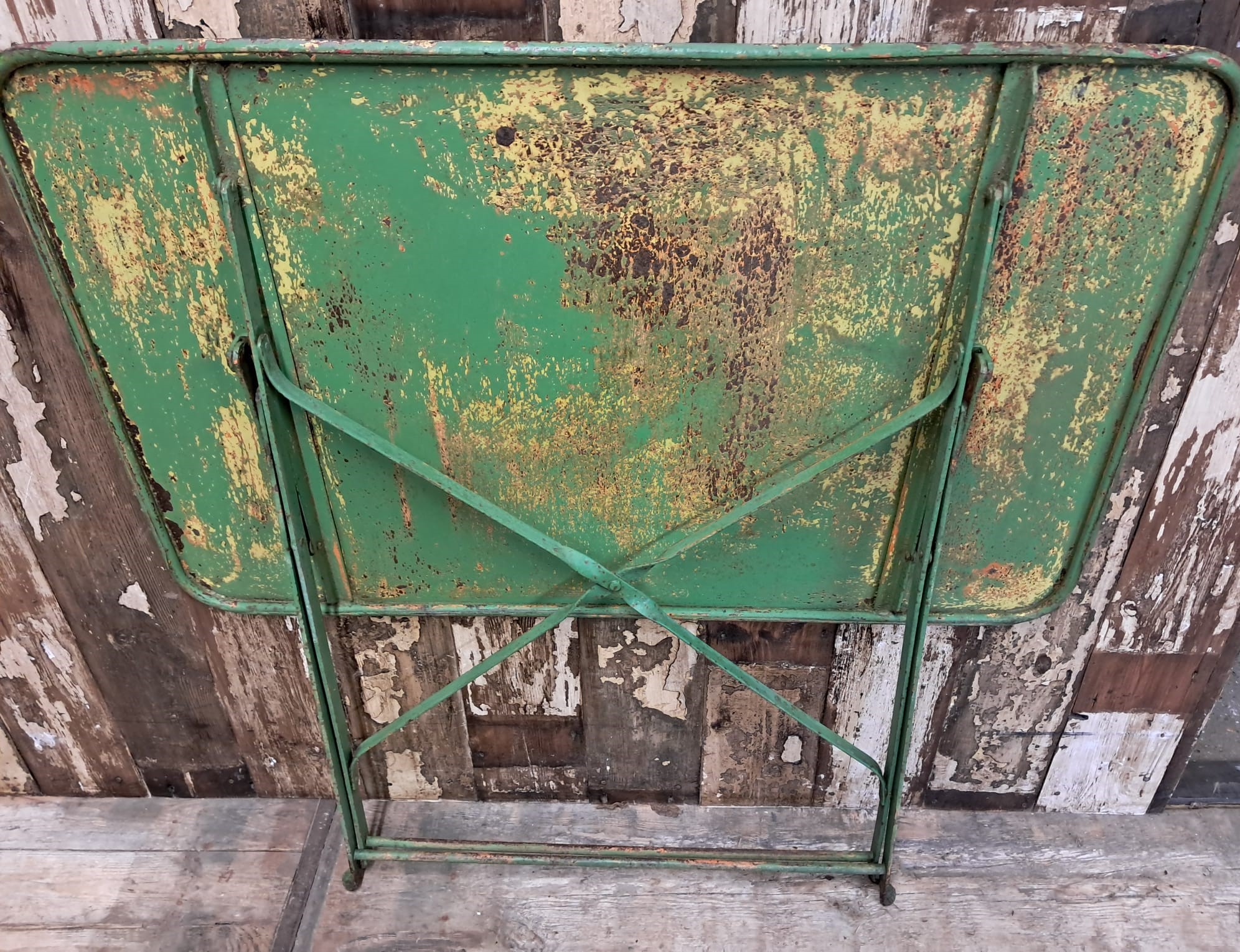 A rectangular metal bistro table with authentic red and green patina.