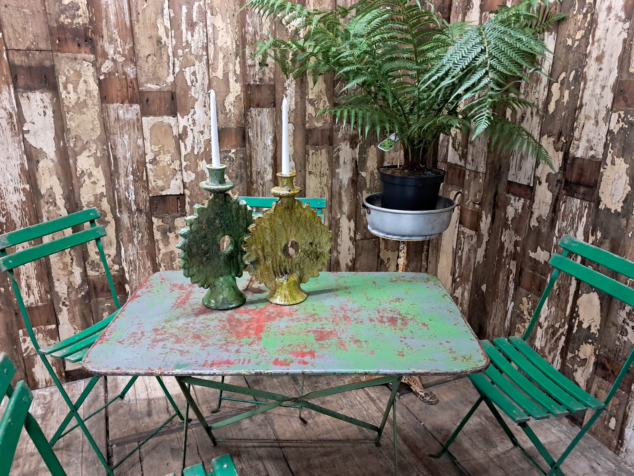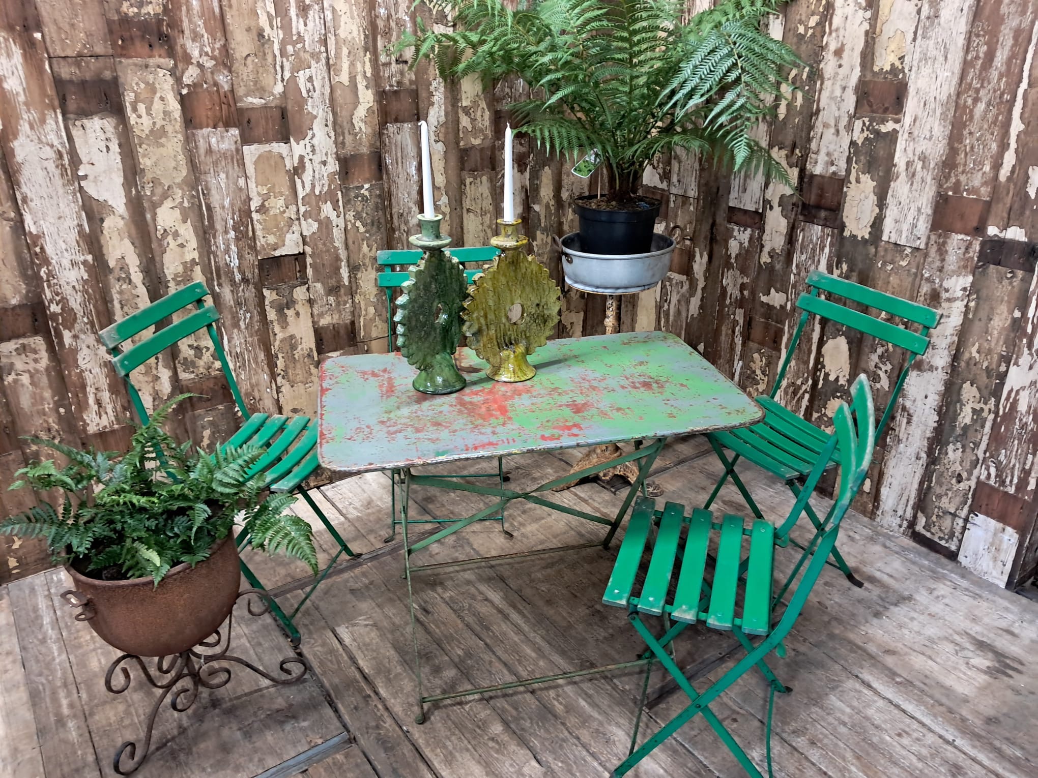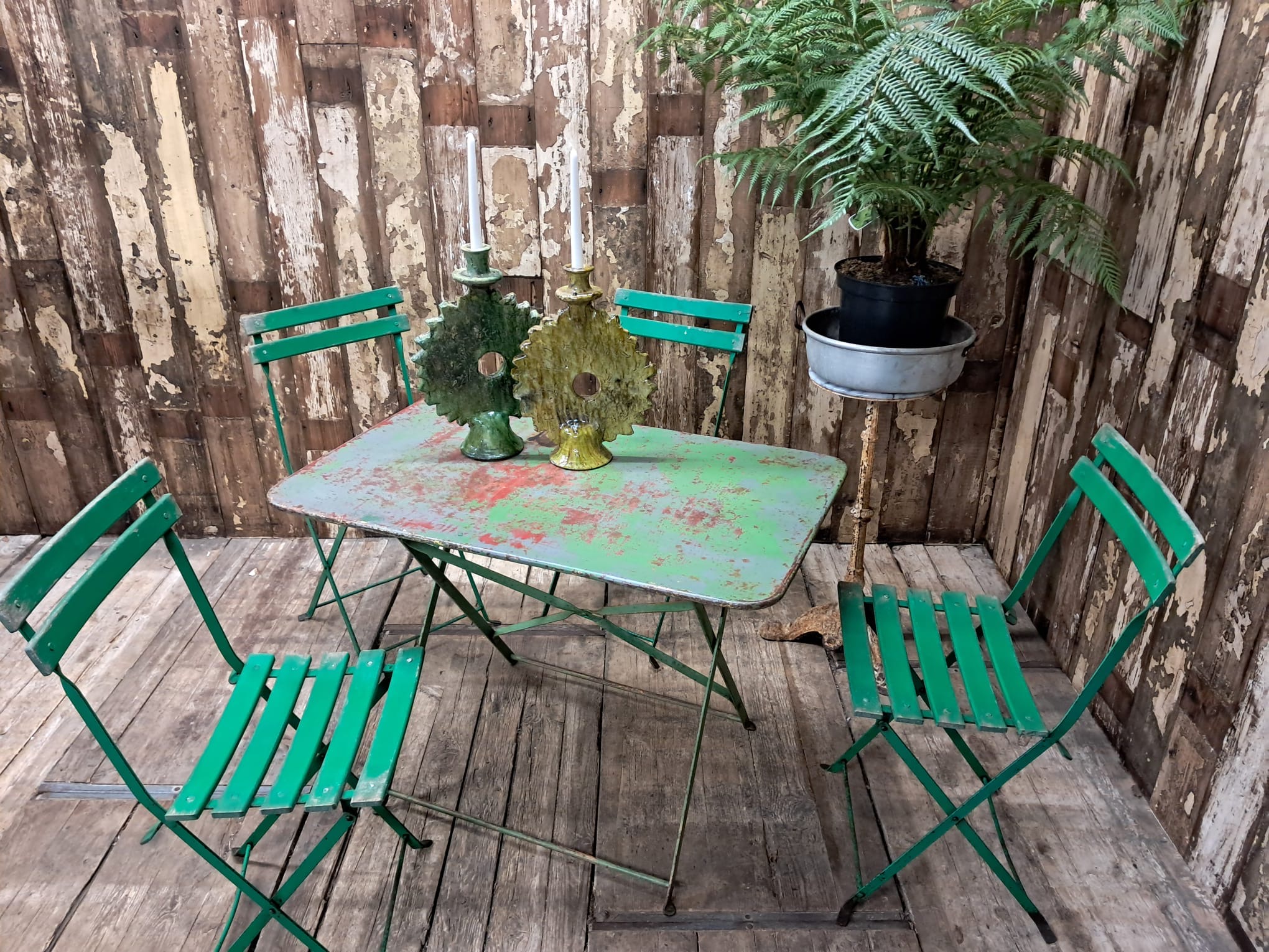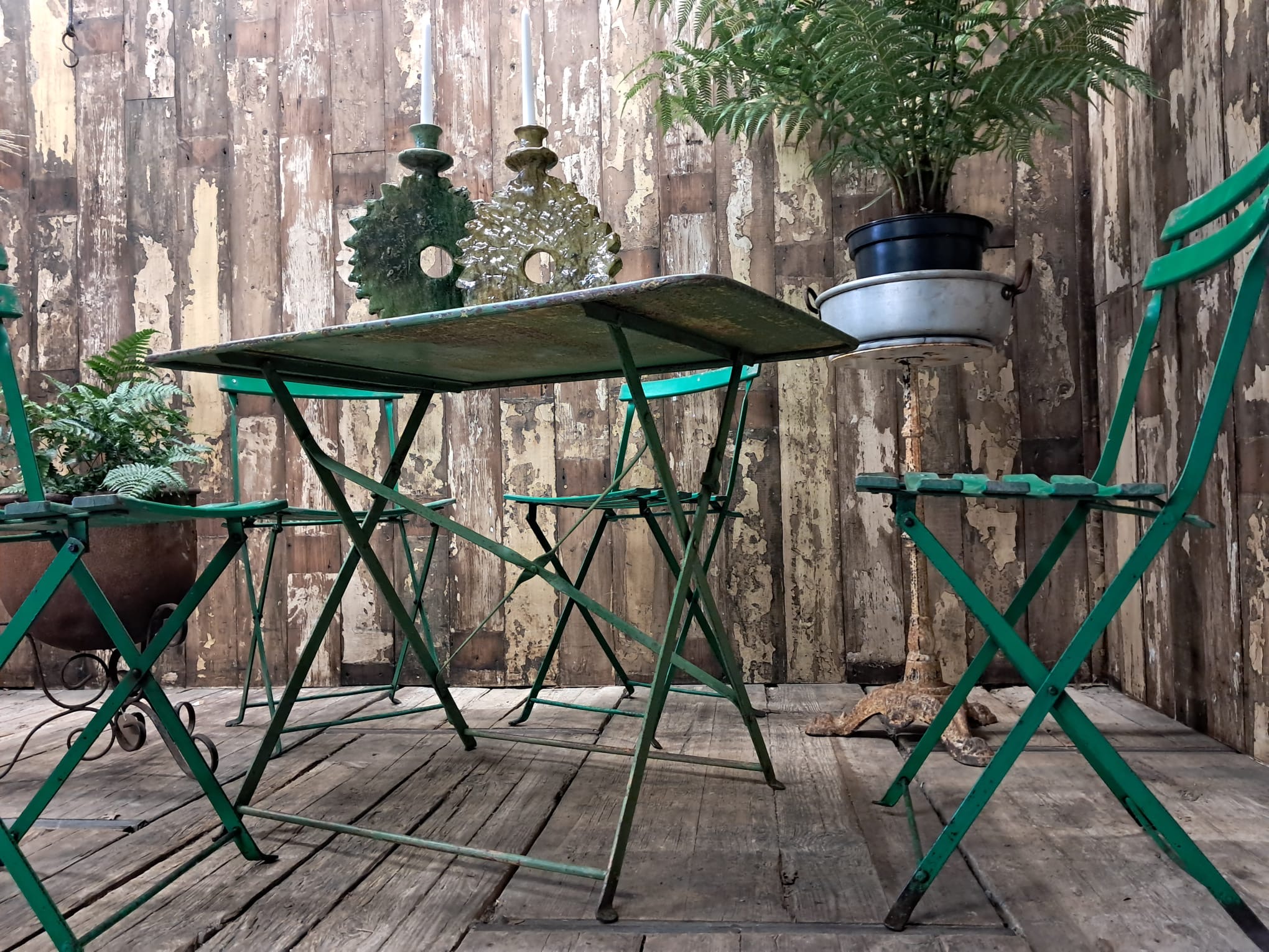 Also pictured with our set of green Folding Slatted Bistro Chairs listed separately.