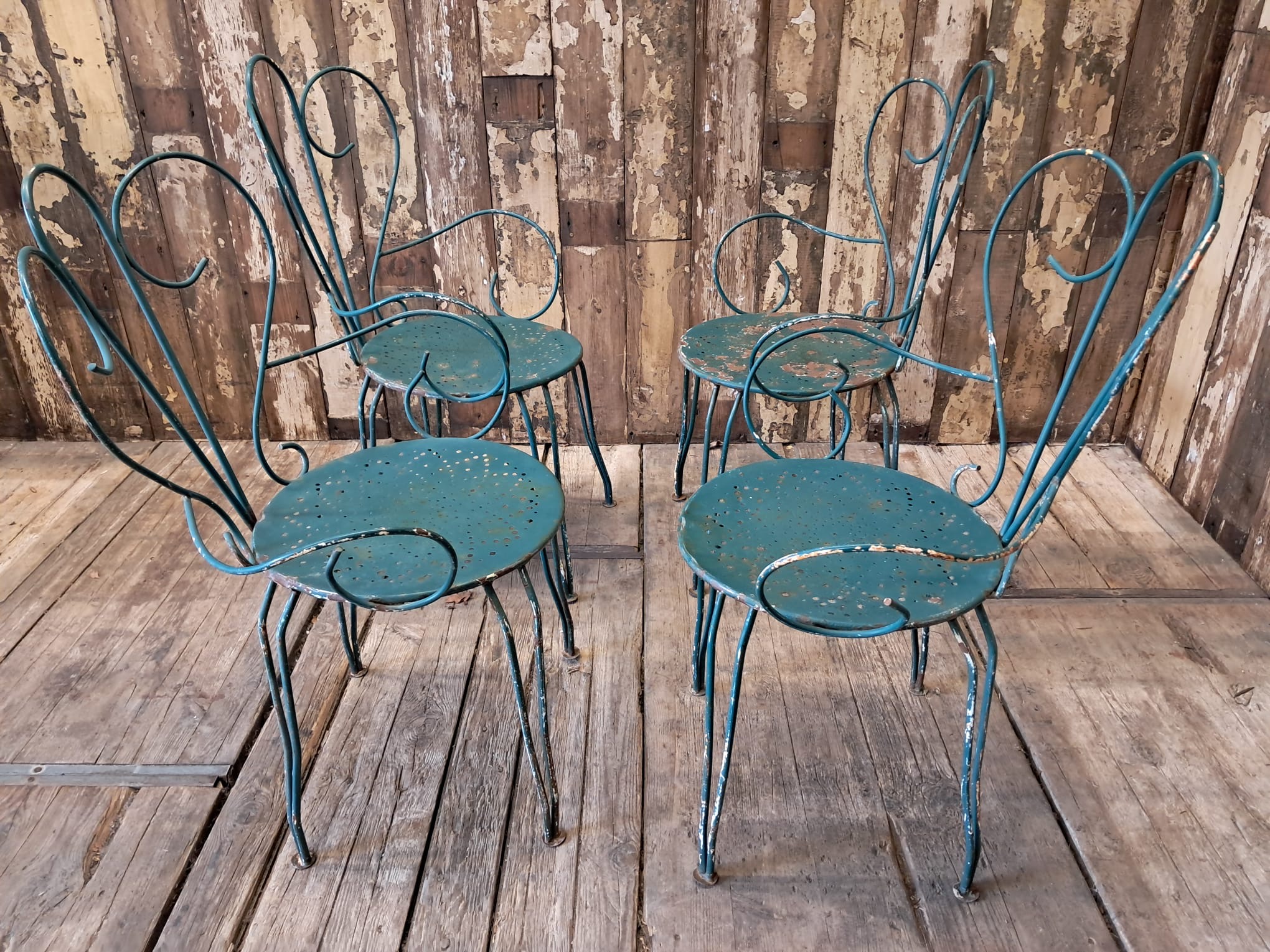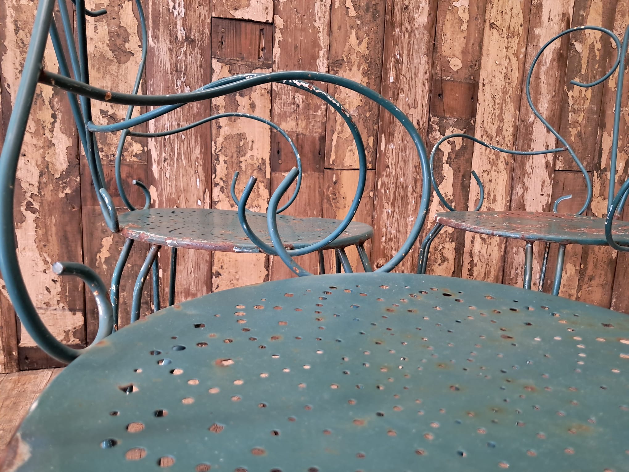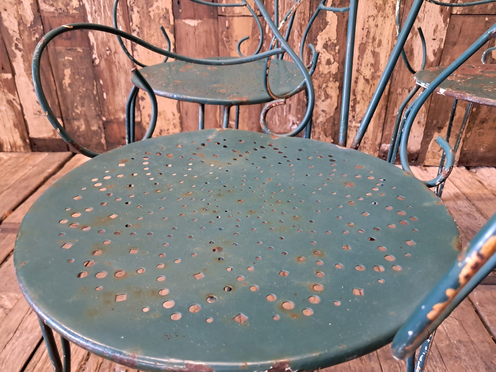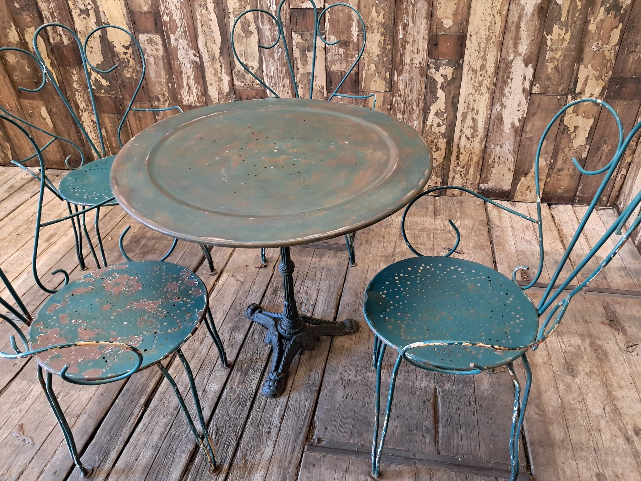 Comprising a round bistro table, with tray style top and four matching carver chairs with pretty heart shaped scroll work to the back rests and perforated seats.