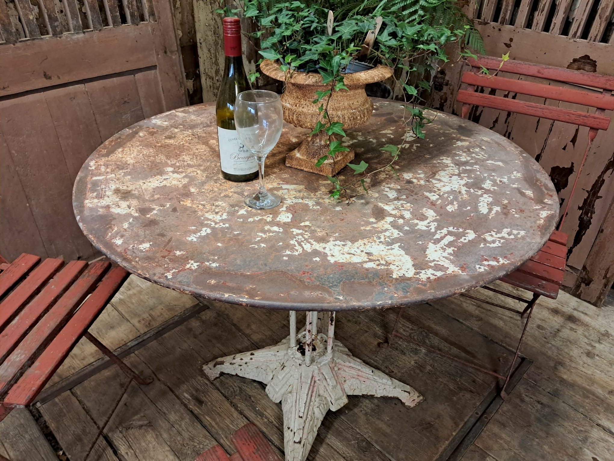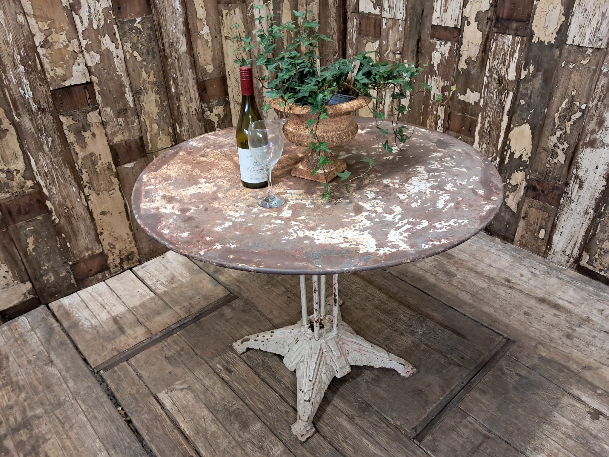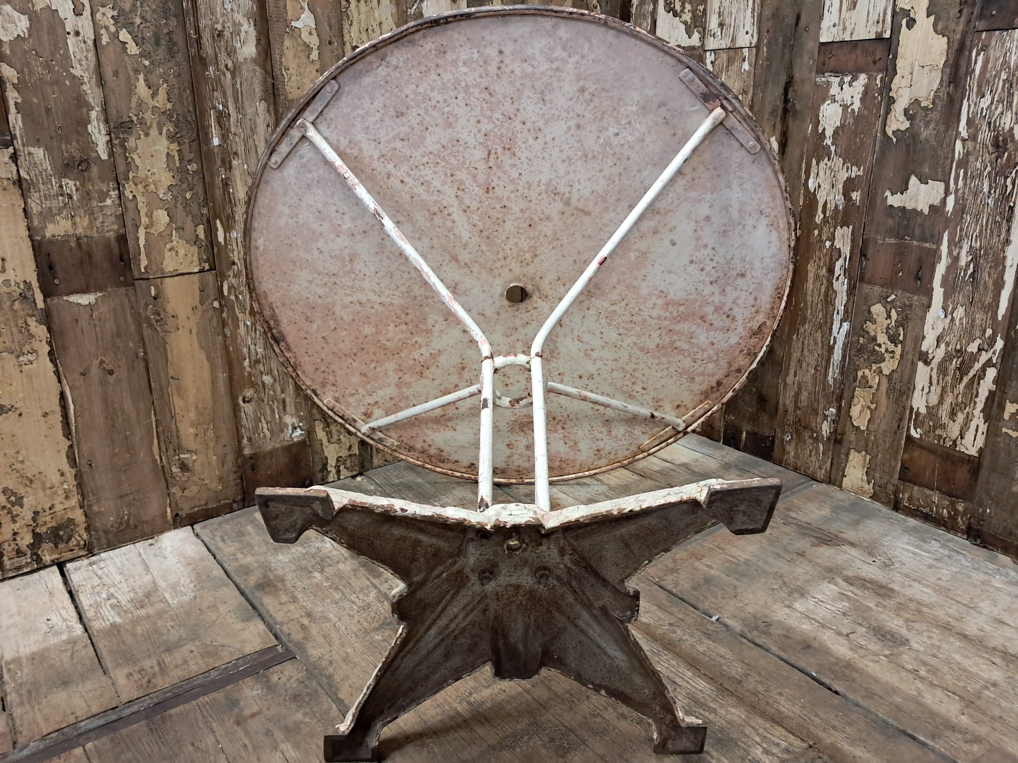 An antique French round bistro table with steel top and cast iron centre leg and base.