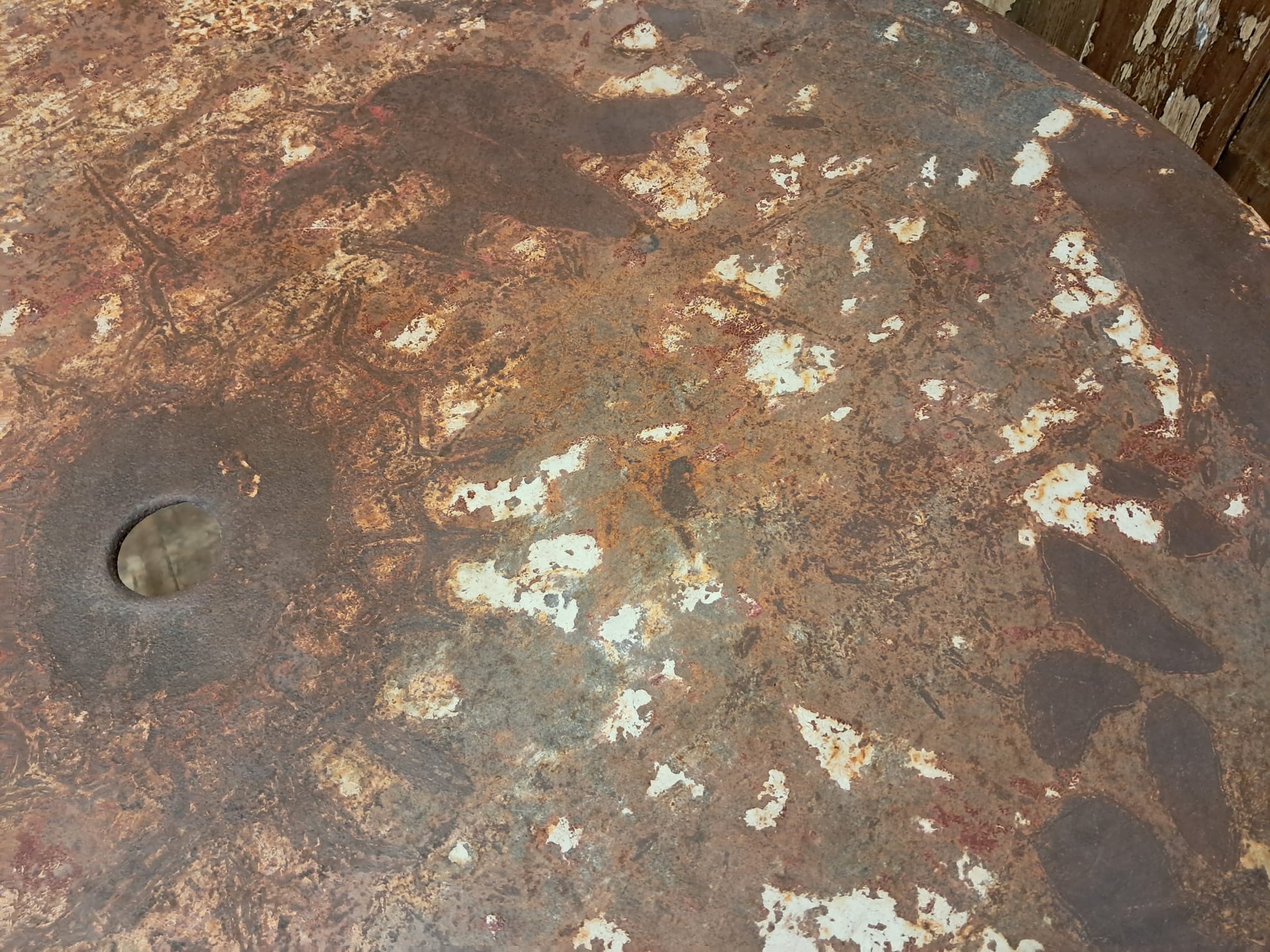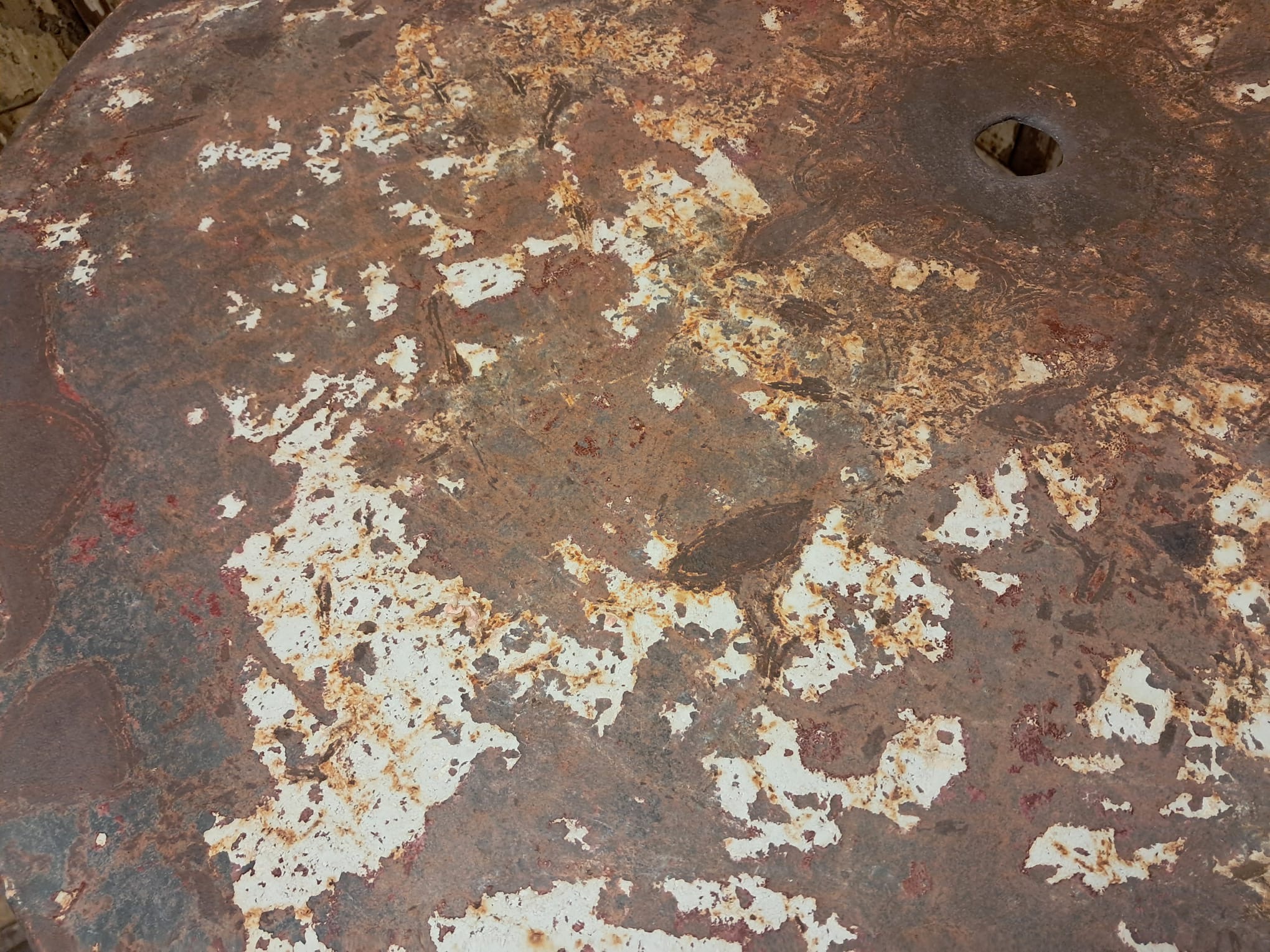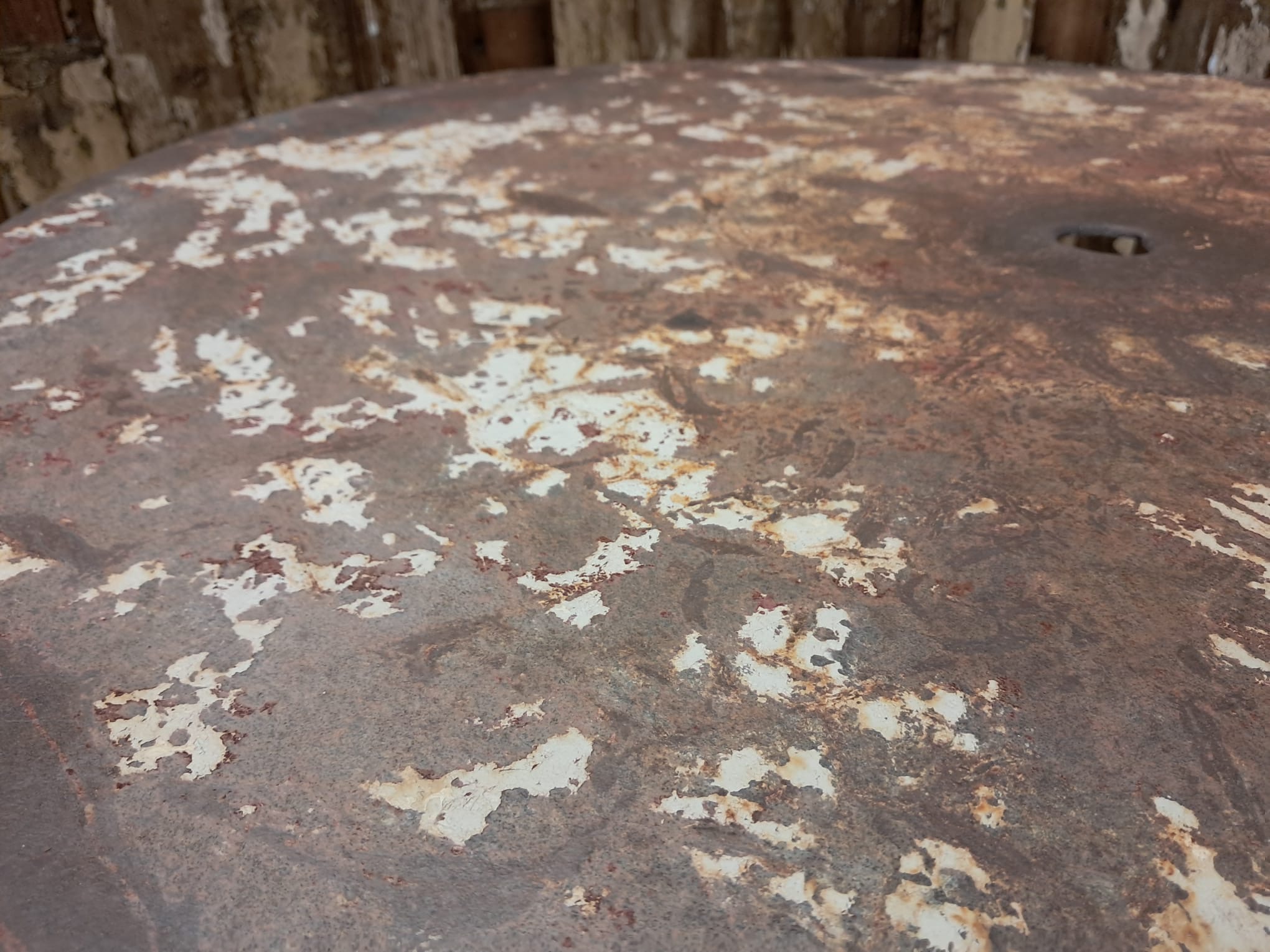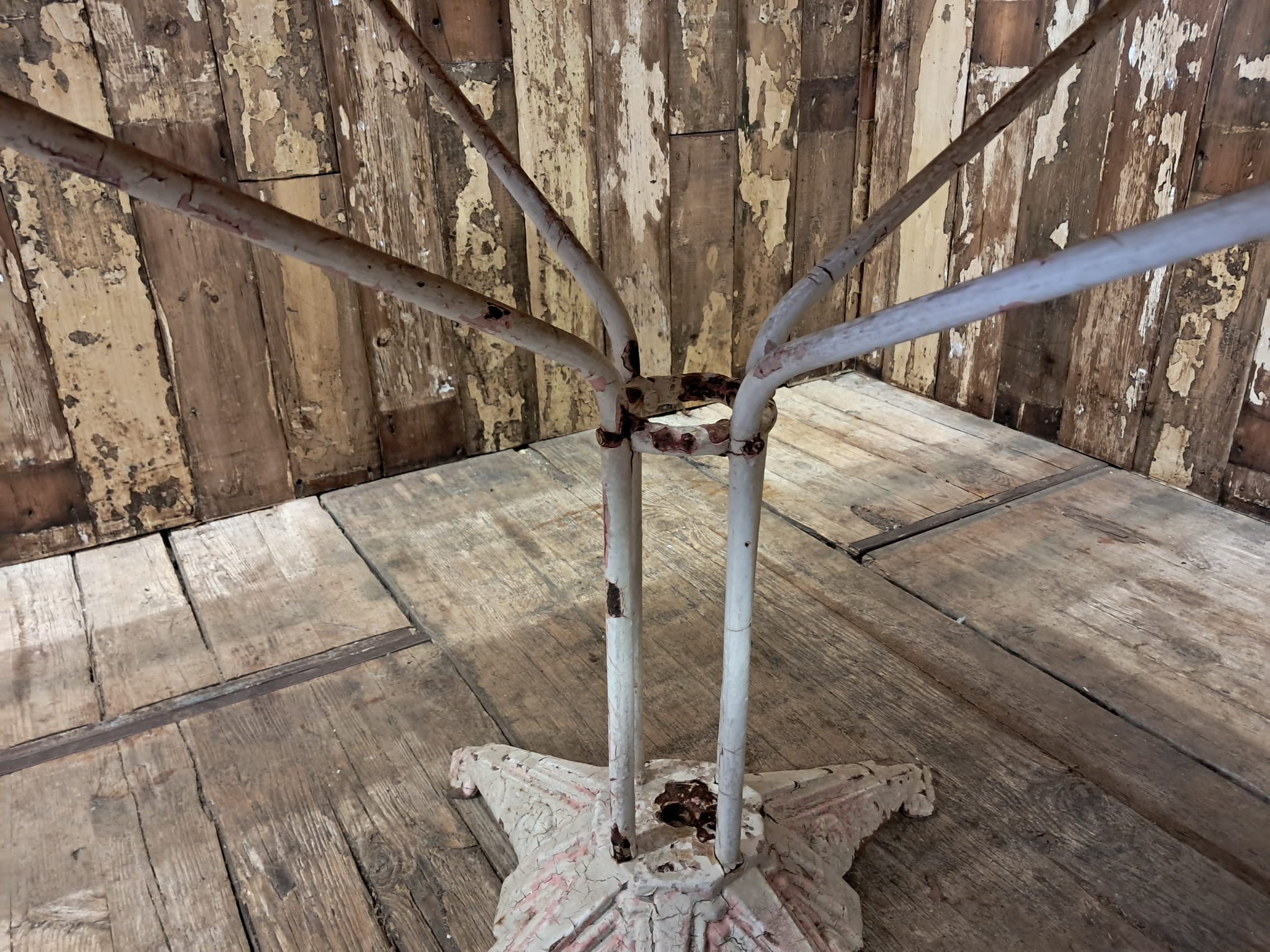 An antique French round bistro table with steel top and cast iron centre leg and base.