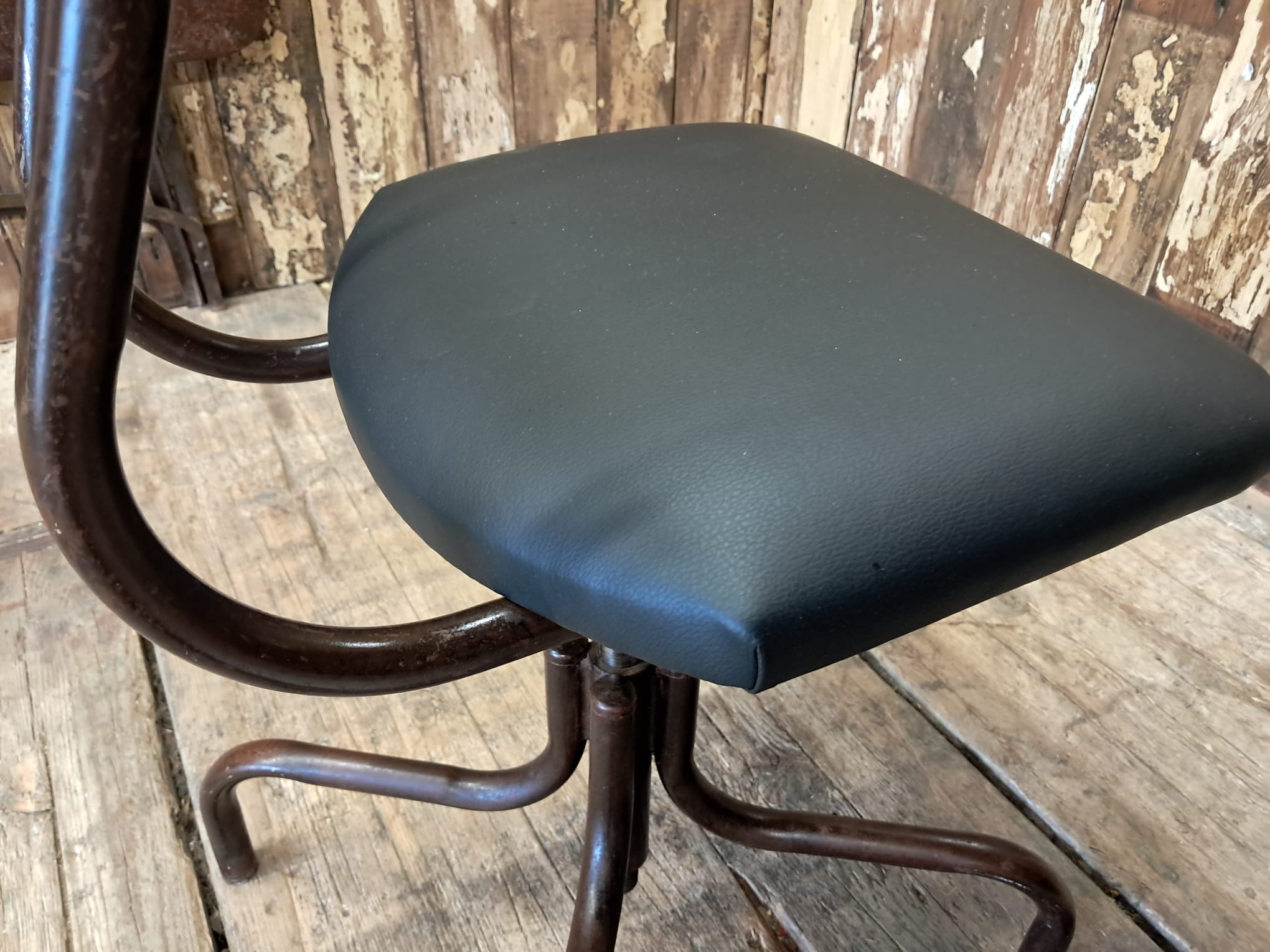 The adjustable seat pad and back rest have been re-upholstered in black vinyl.