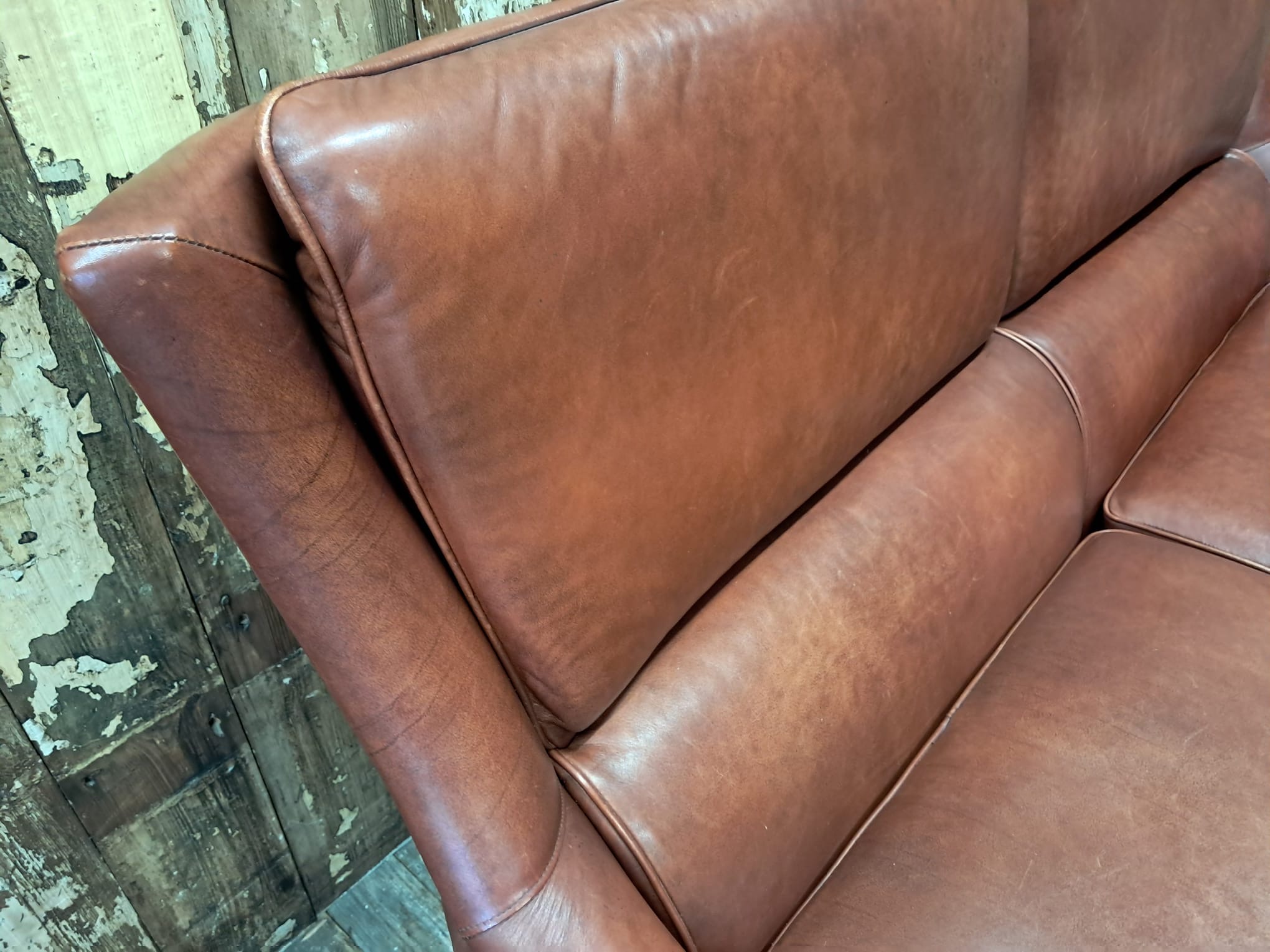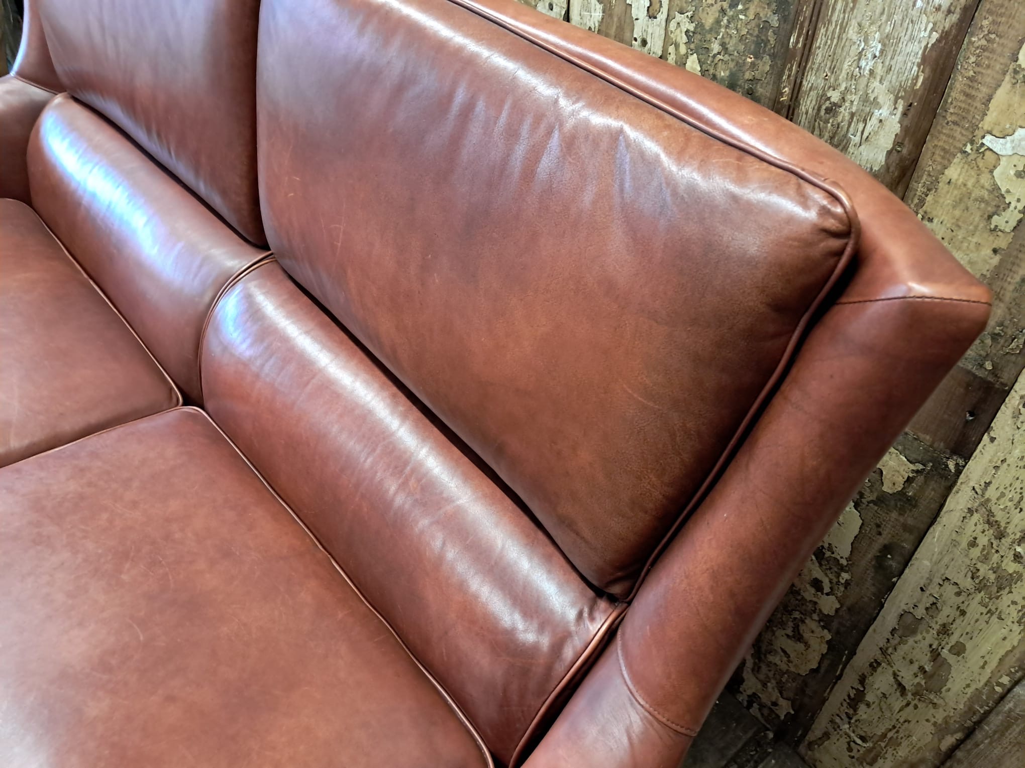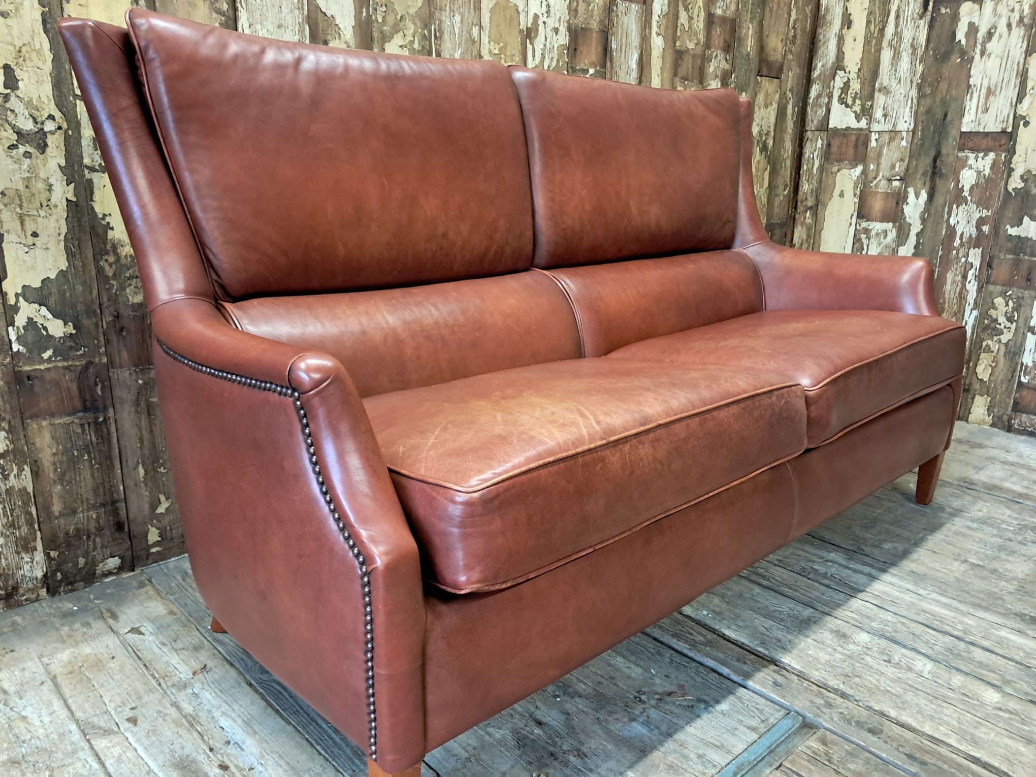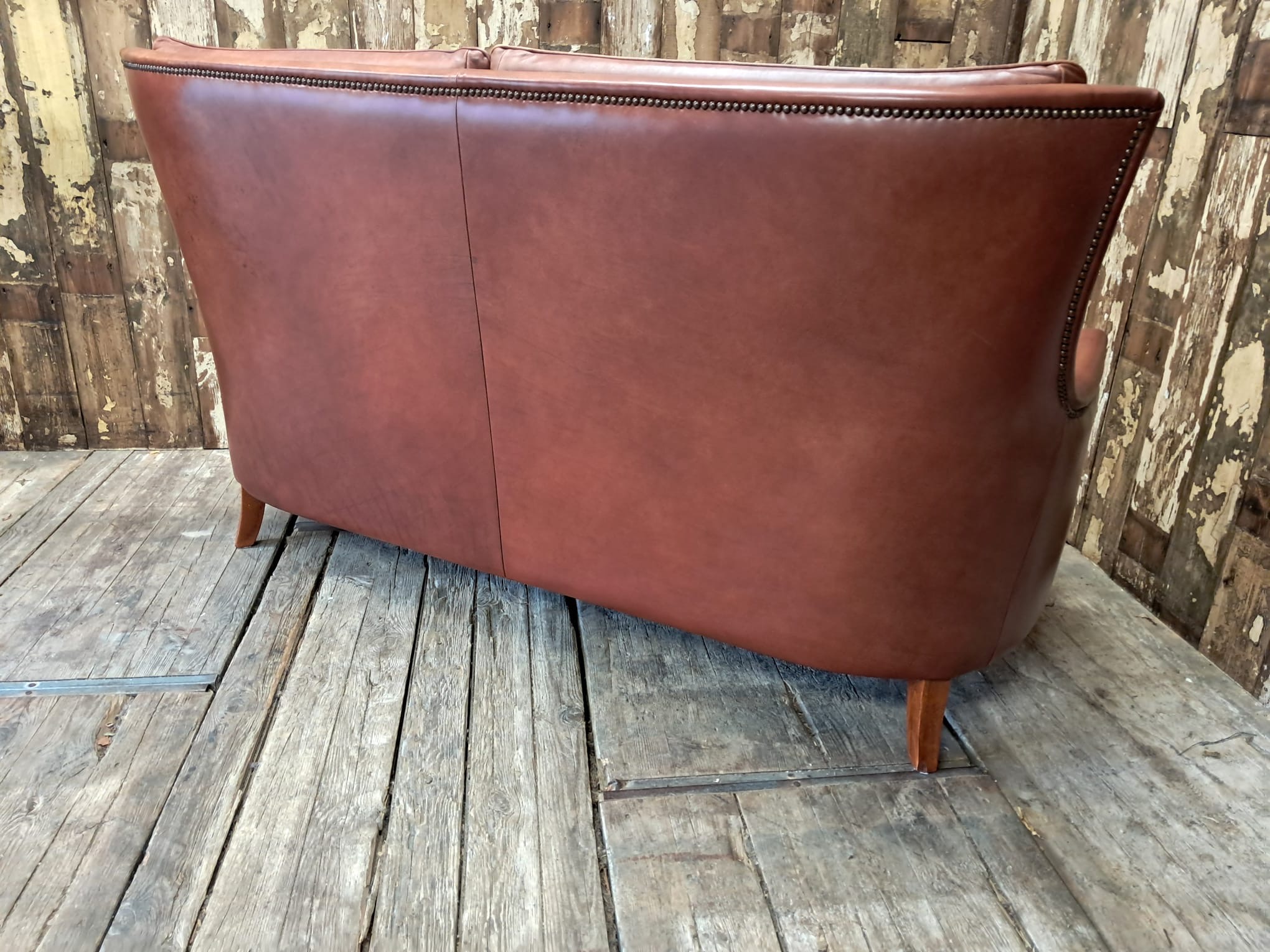 Rich tobacco brown leather with immaculate studwork to the edges and sweeping arms.
