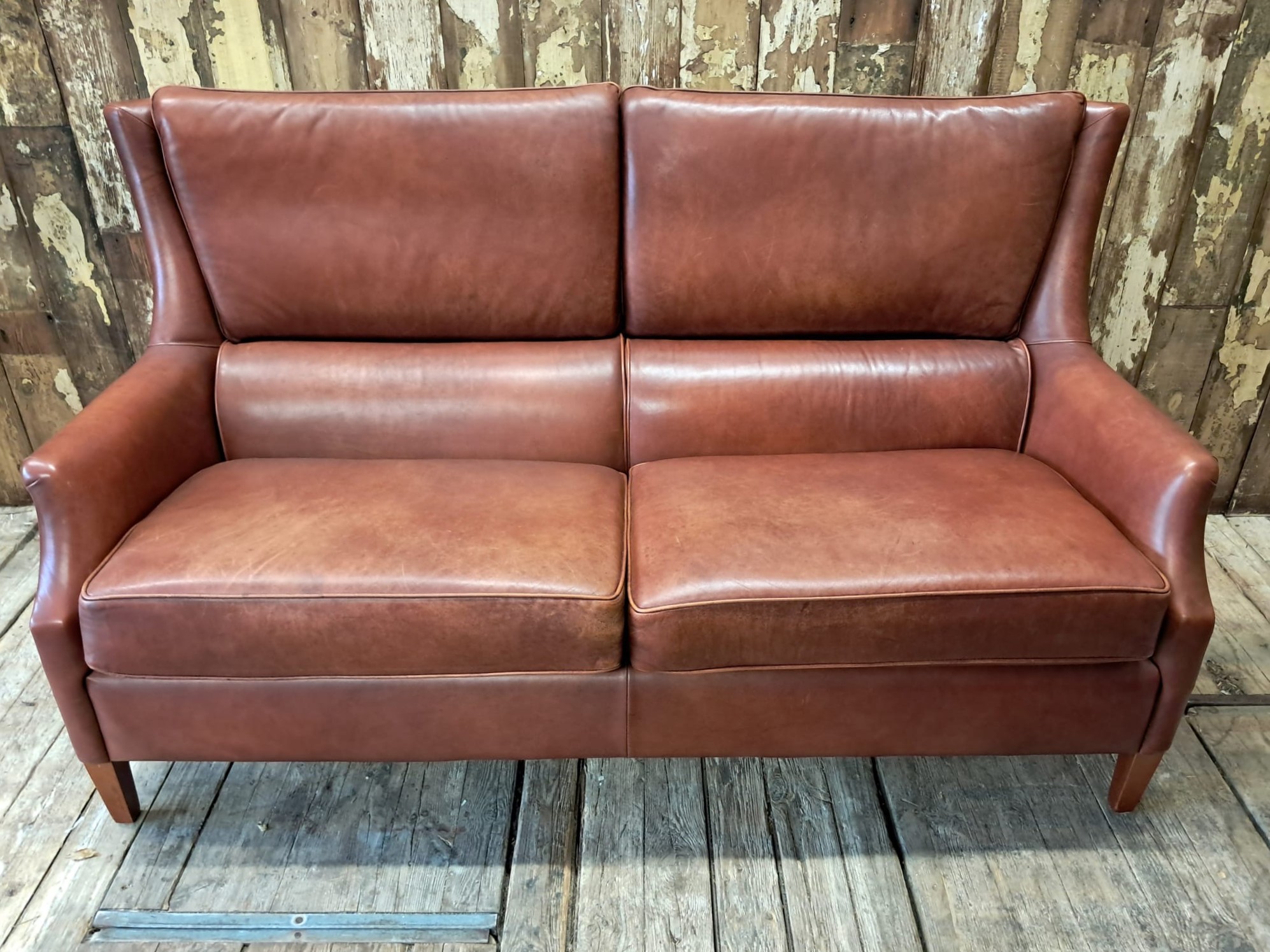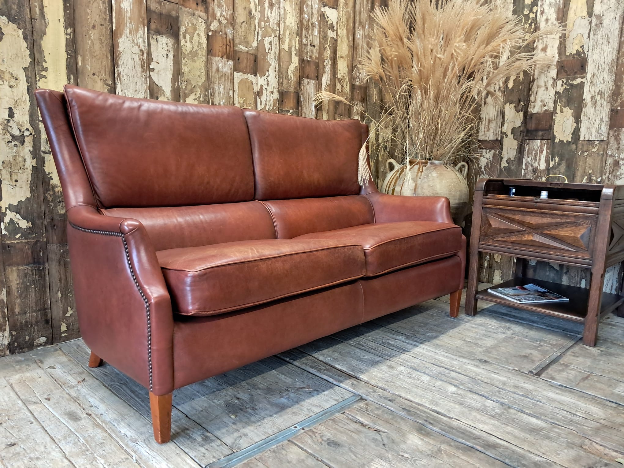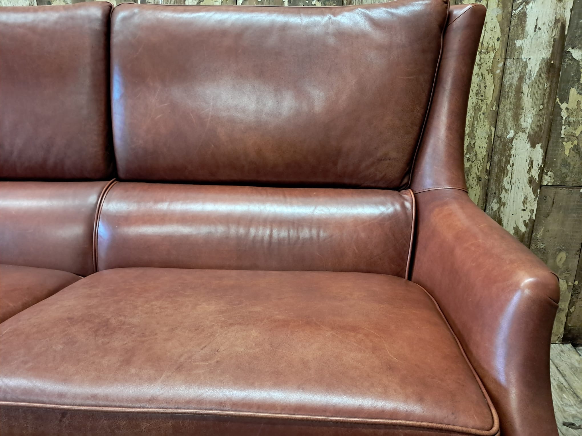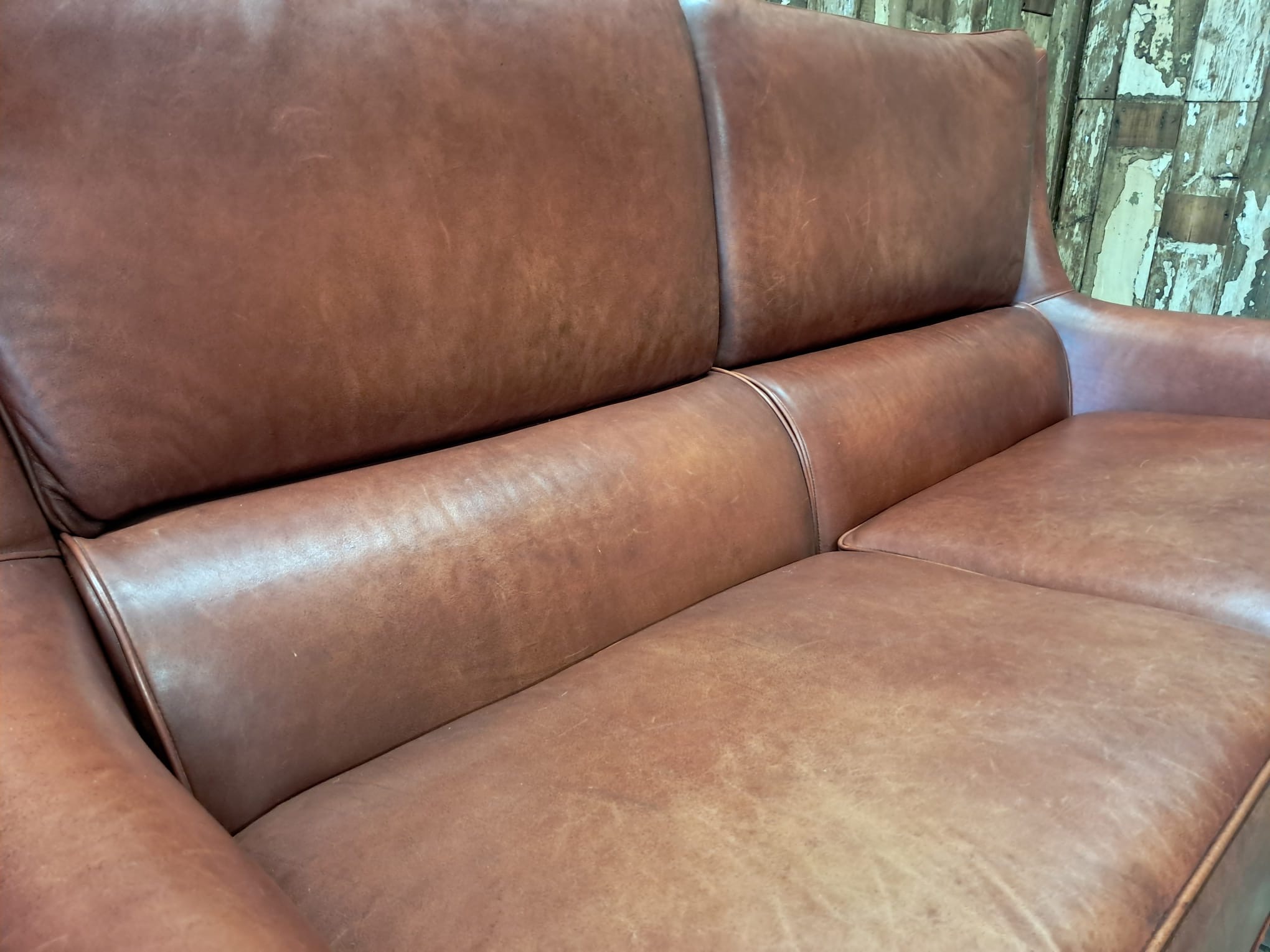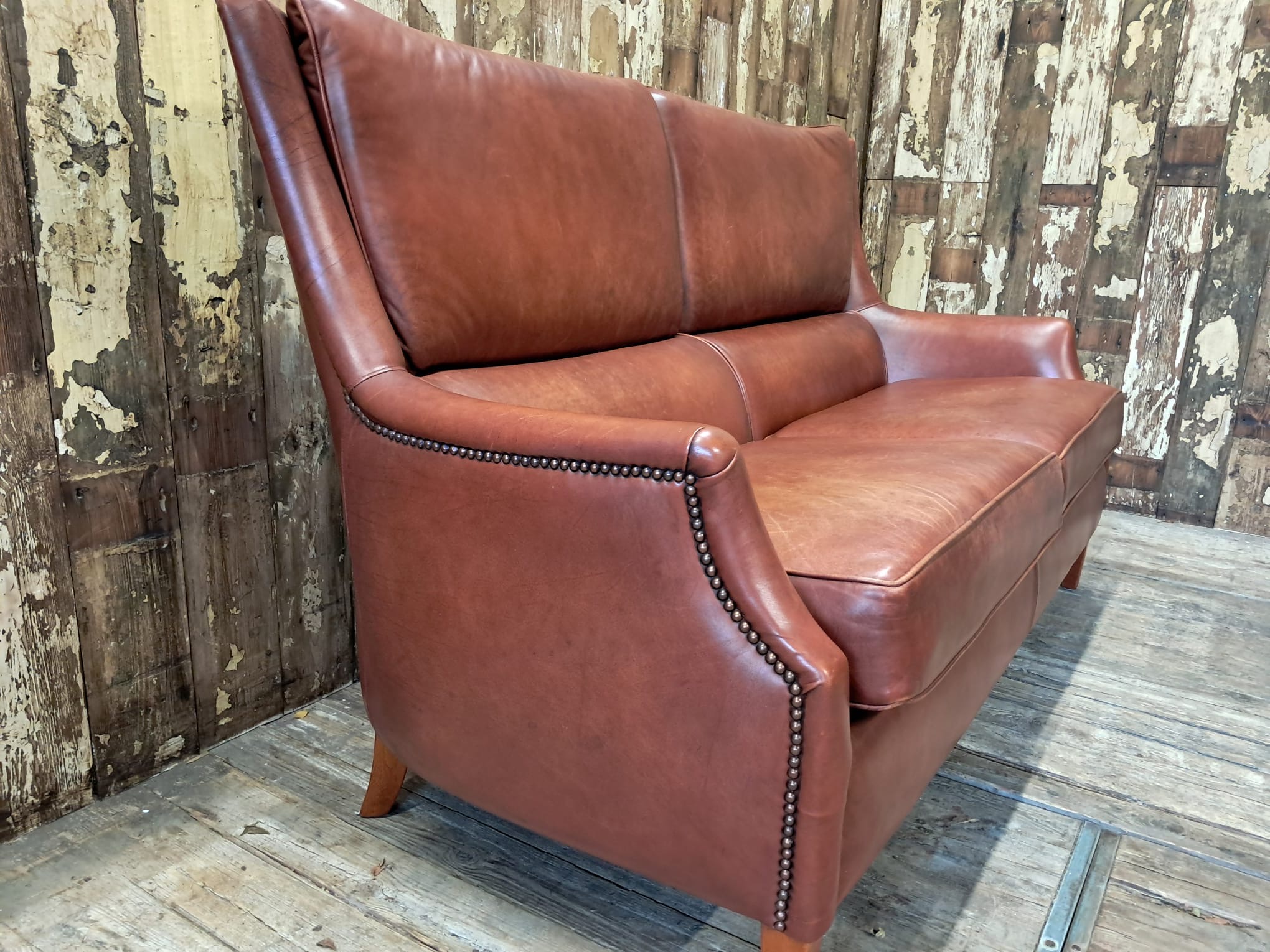 Rich tobacco brown leather with immaculate studwork to the edges and sweeping arms.