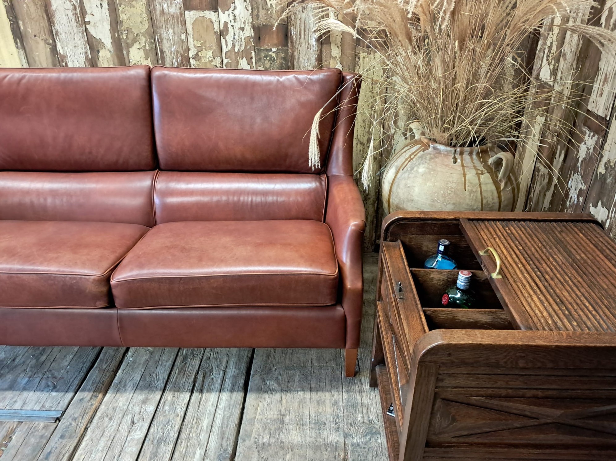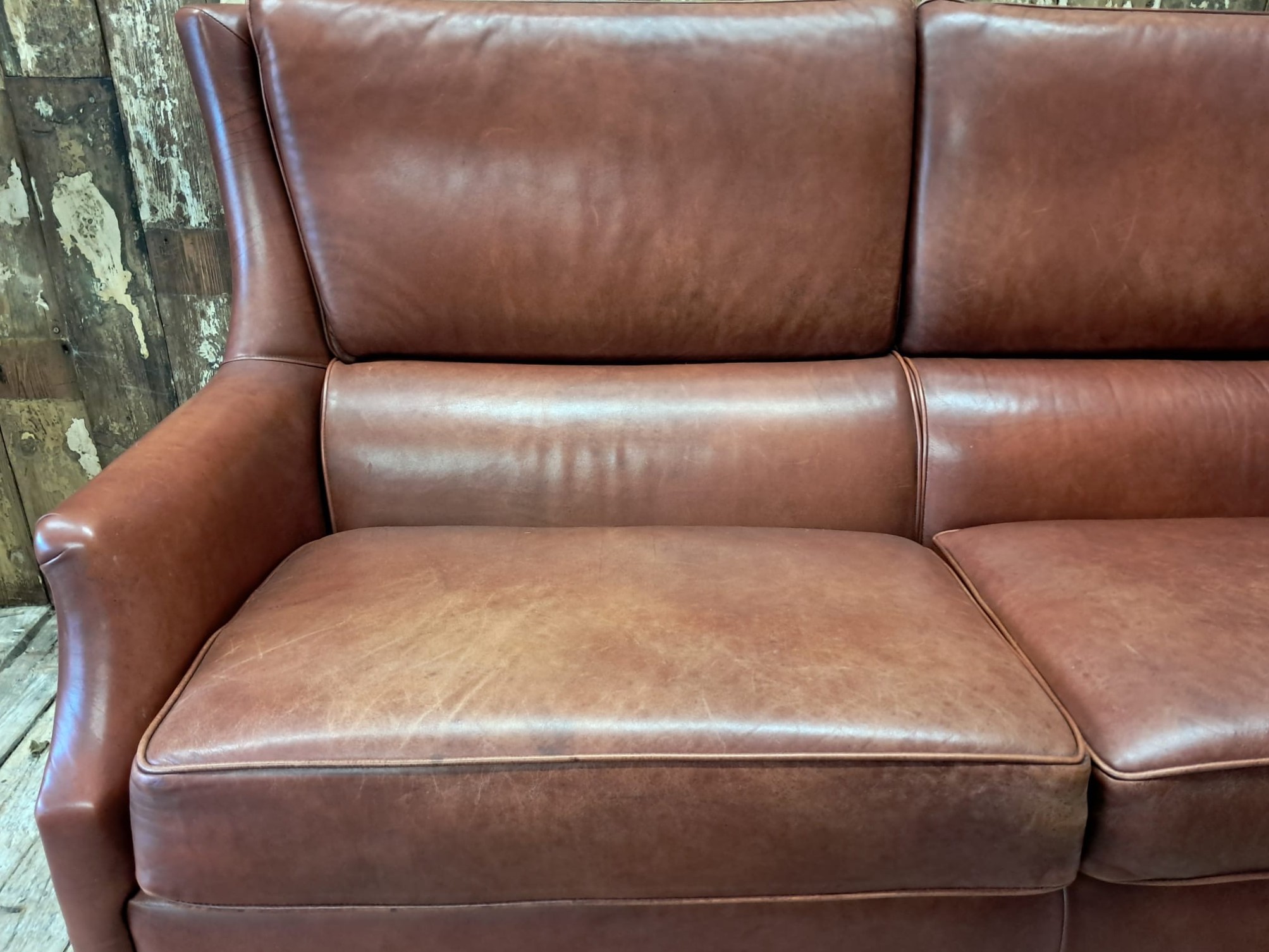 The leather is perfectly worn with a great patina and the high back and lumber support make this a comfortable and extremely stylish sofa.