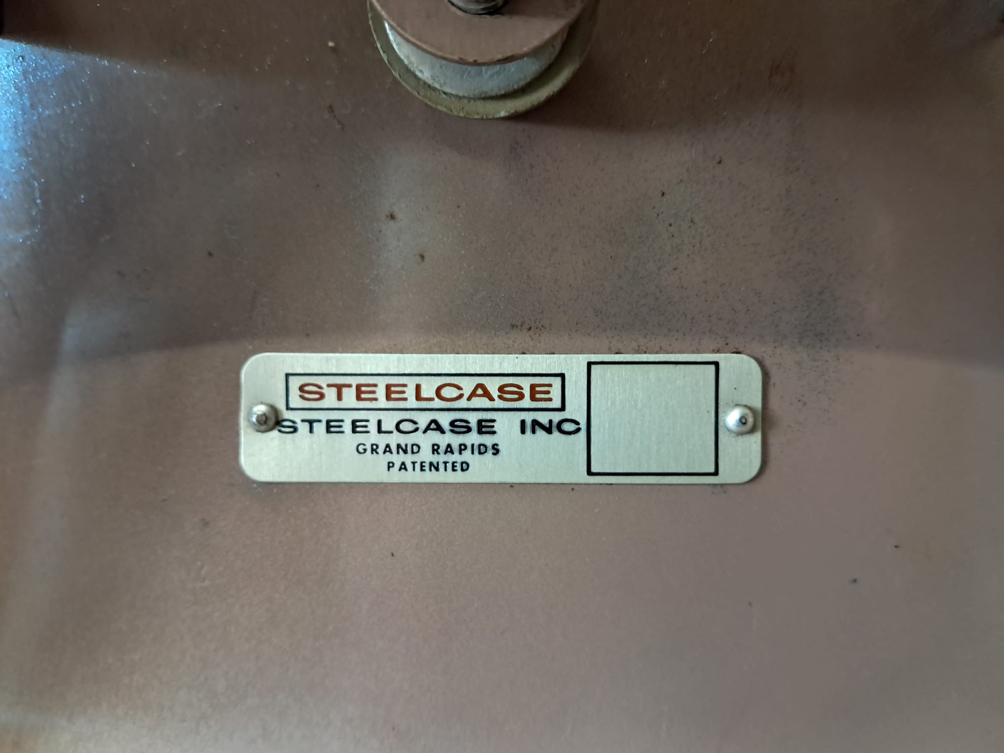 Made by Steelcase Inc, with original branding on the back rest, this robust chair has a steel frame with wheels and beige vinyl upholstery.