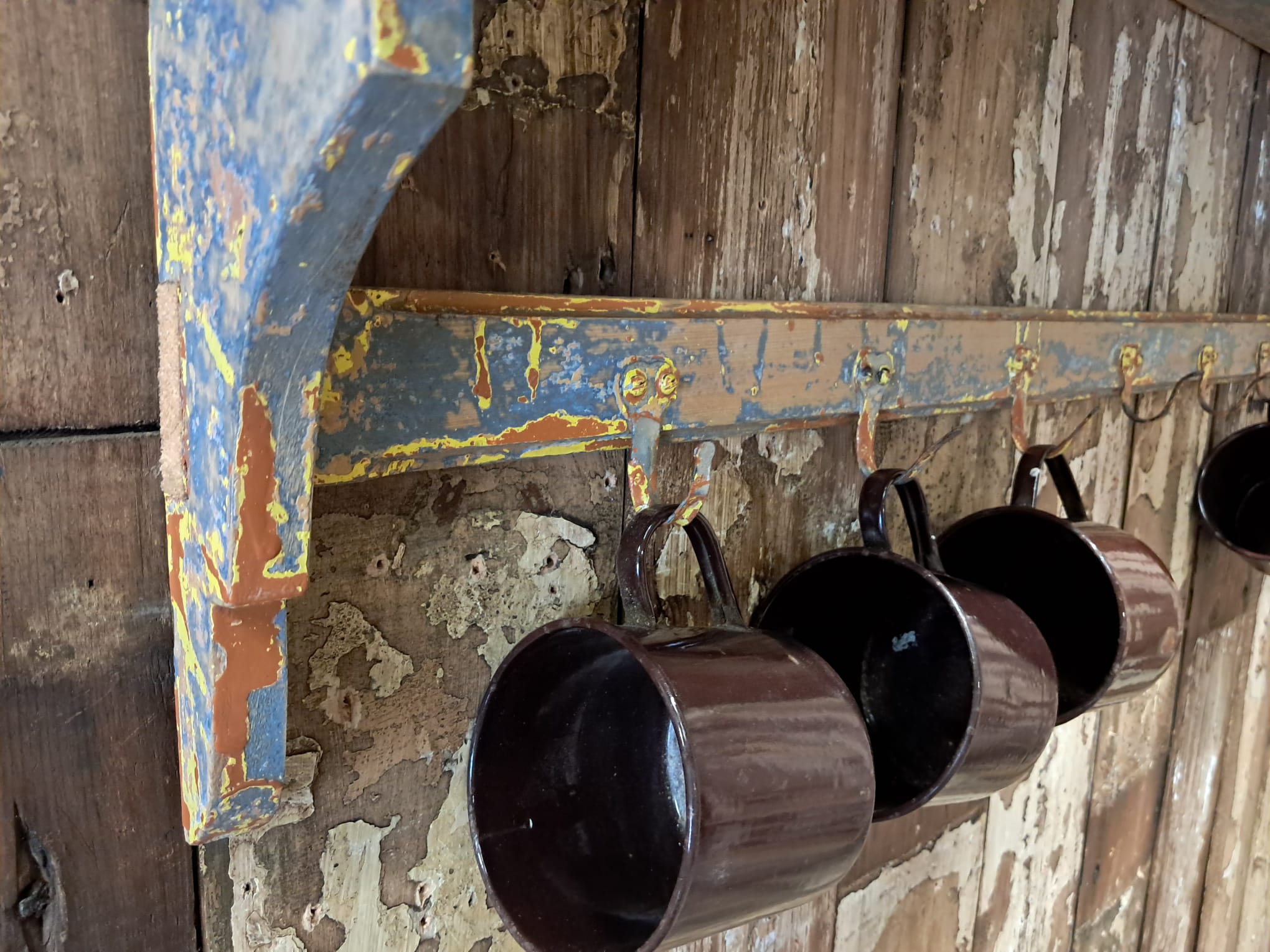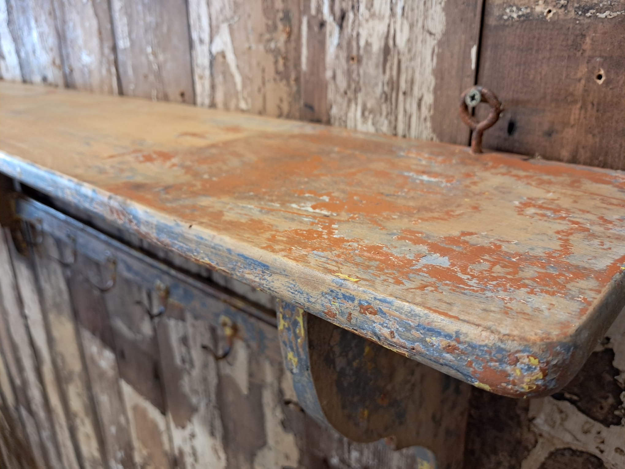 A 1940’s rustic French kitchen shelf with a set of six hooks.