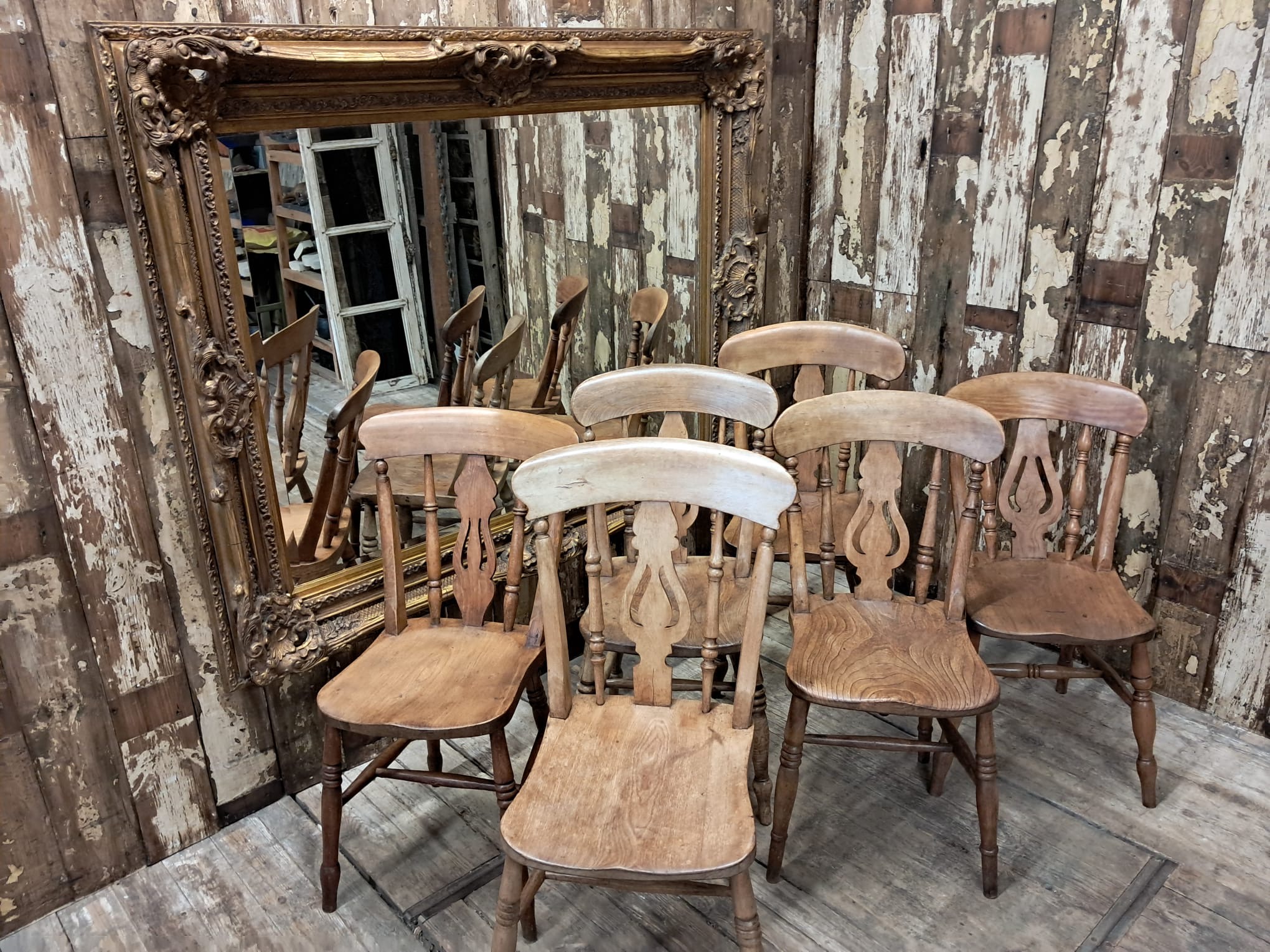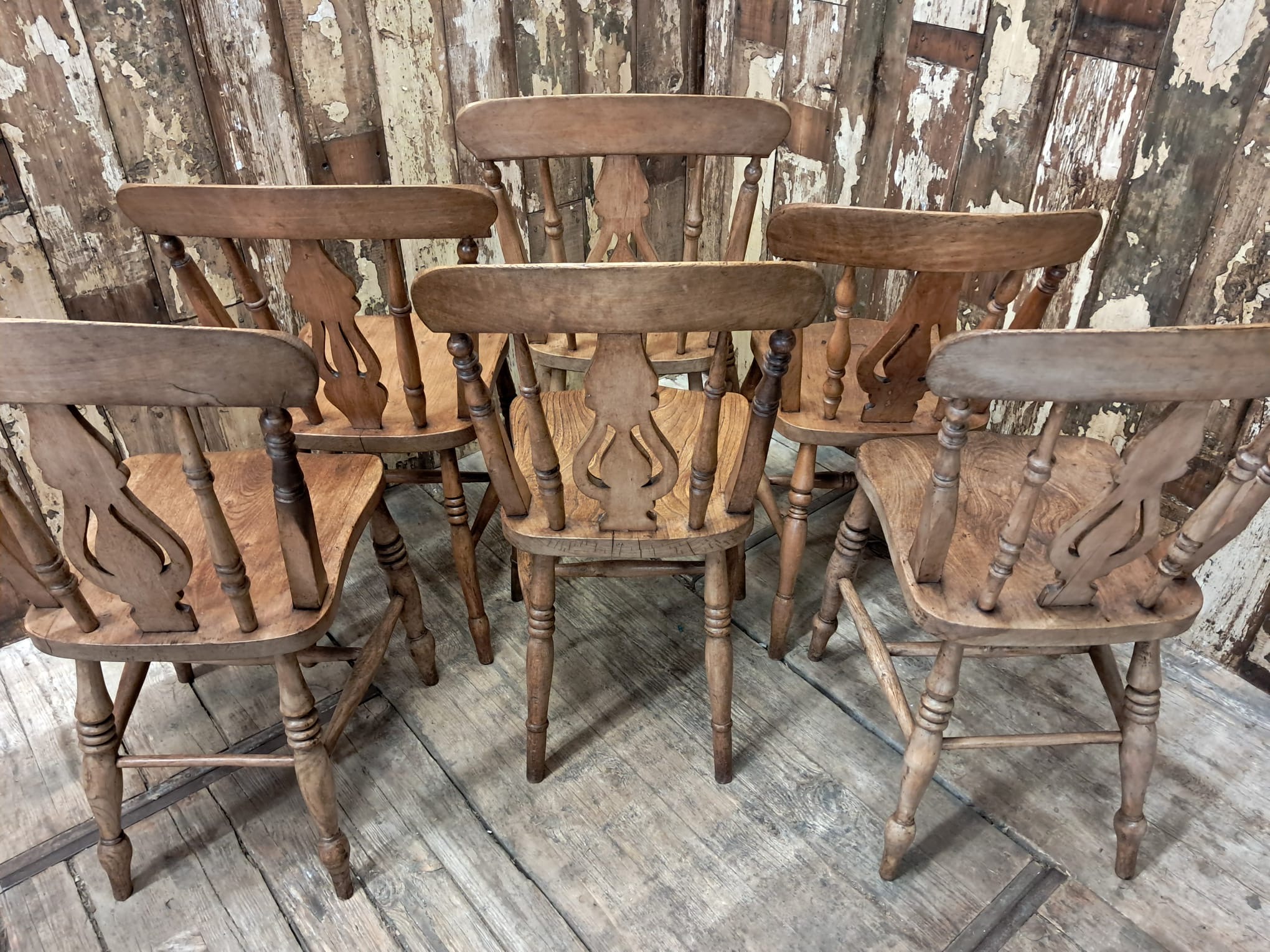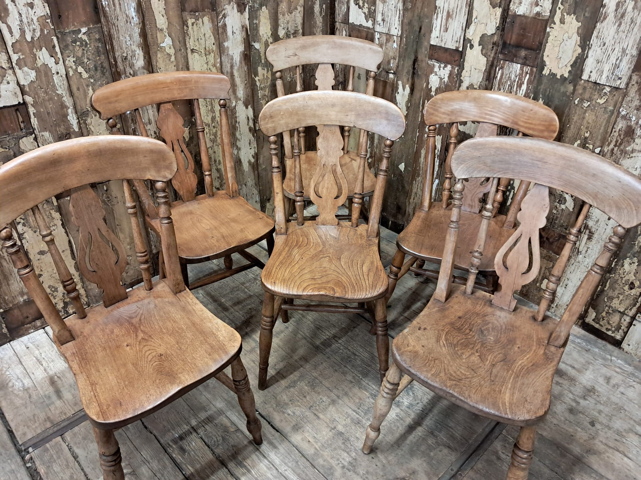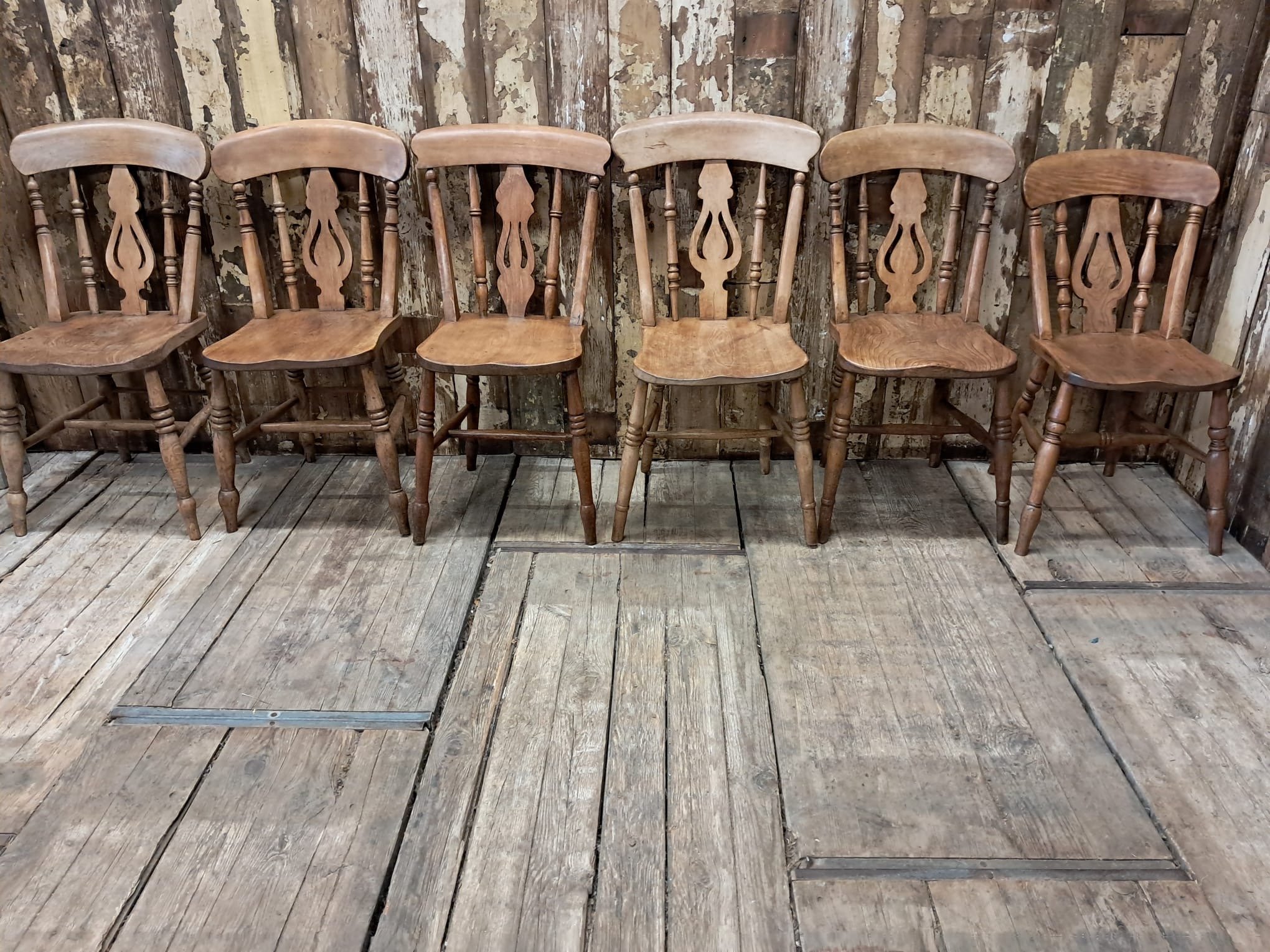 A set of 6 Victorian fiddle back farmhouse kitchen chairs.