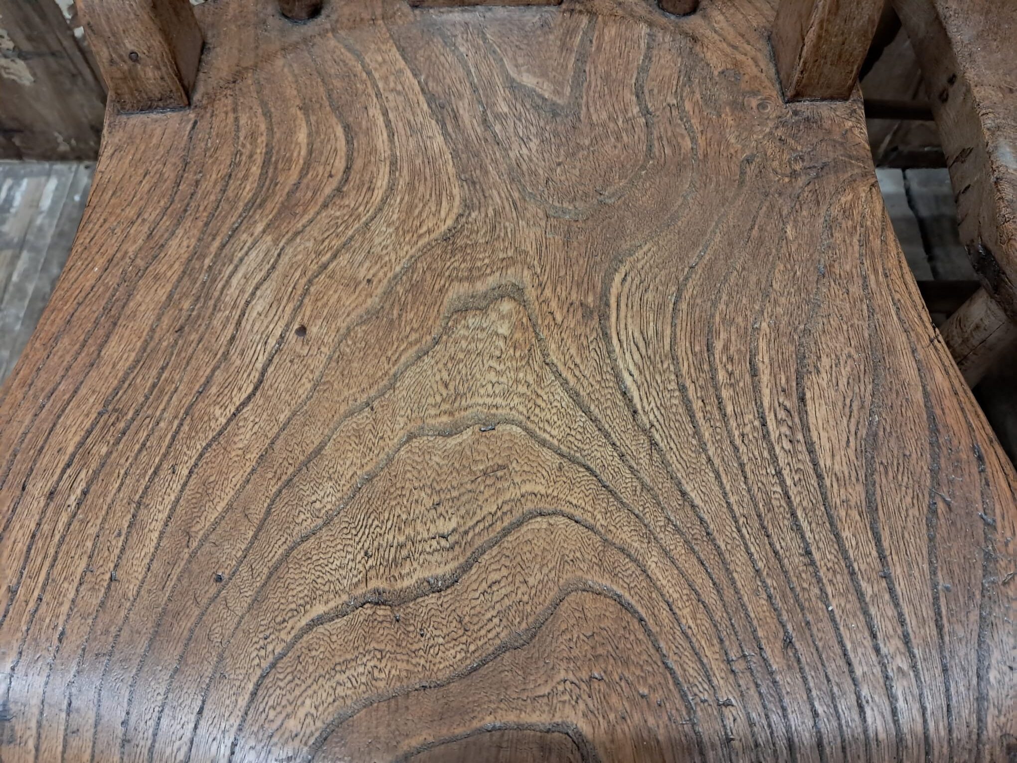 With solid elm saddle seats, and turned legs and stretchers, these classic chairs have a broad top rail with a fiddle shaped centre splat and turned spindles.