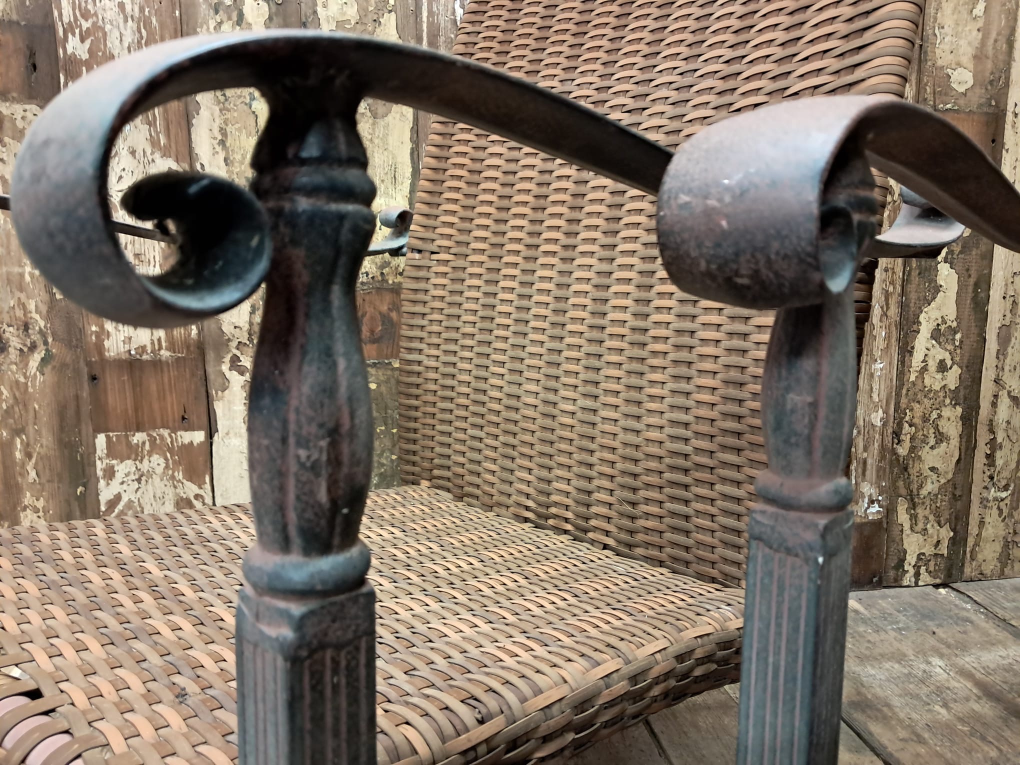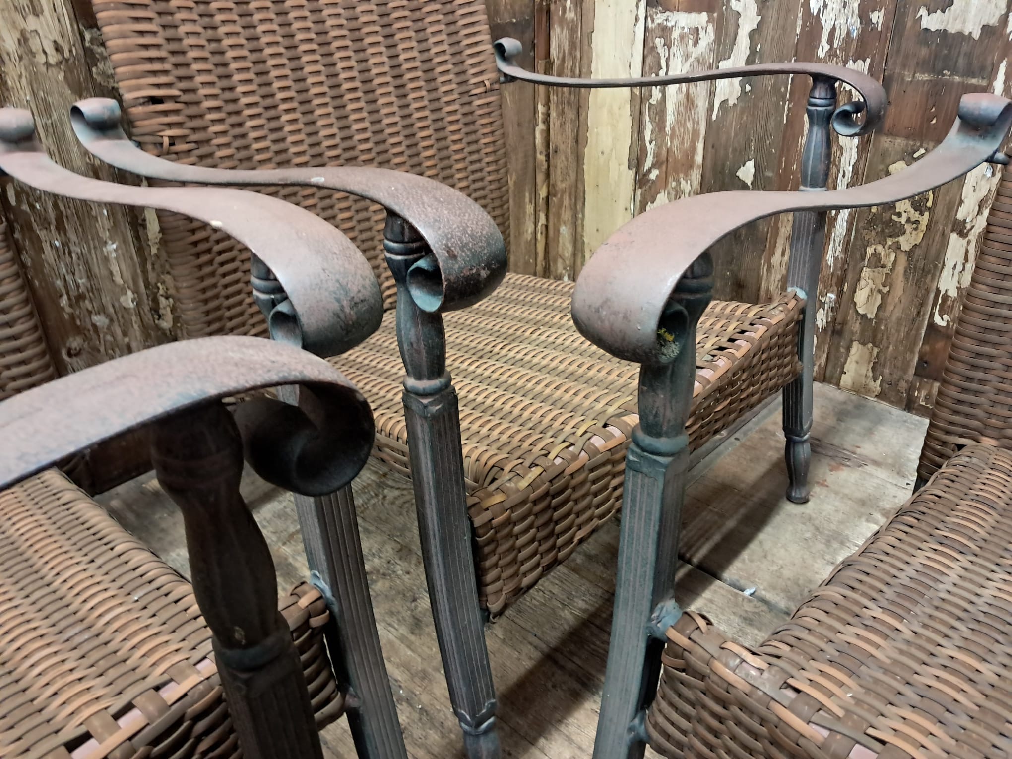 This highly unusual set, estate made in the West Country, have stunning hand forged steel frames with graceful scroll arms and Corinthian pillar style legs with decorative feet.