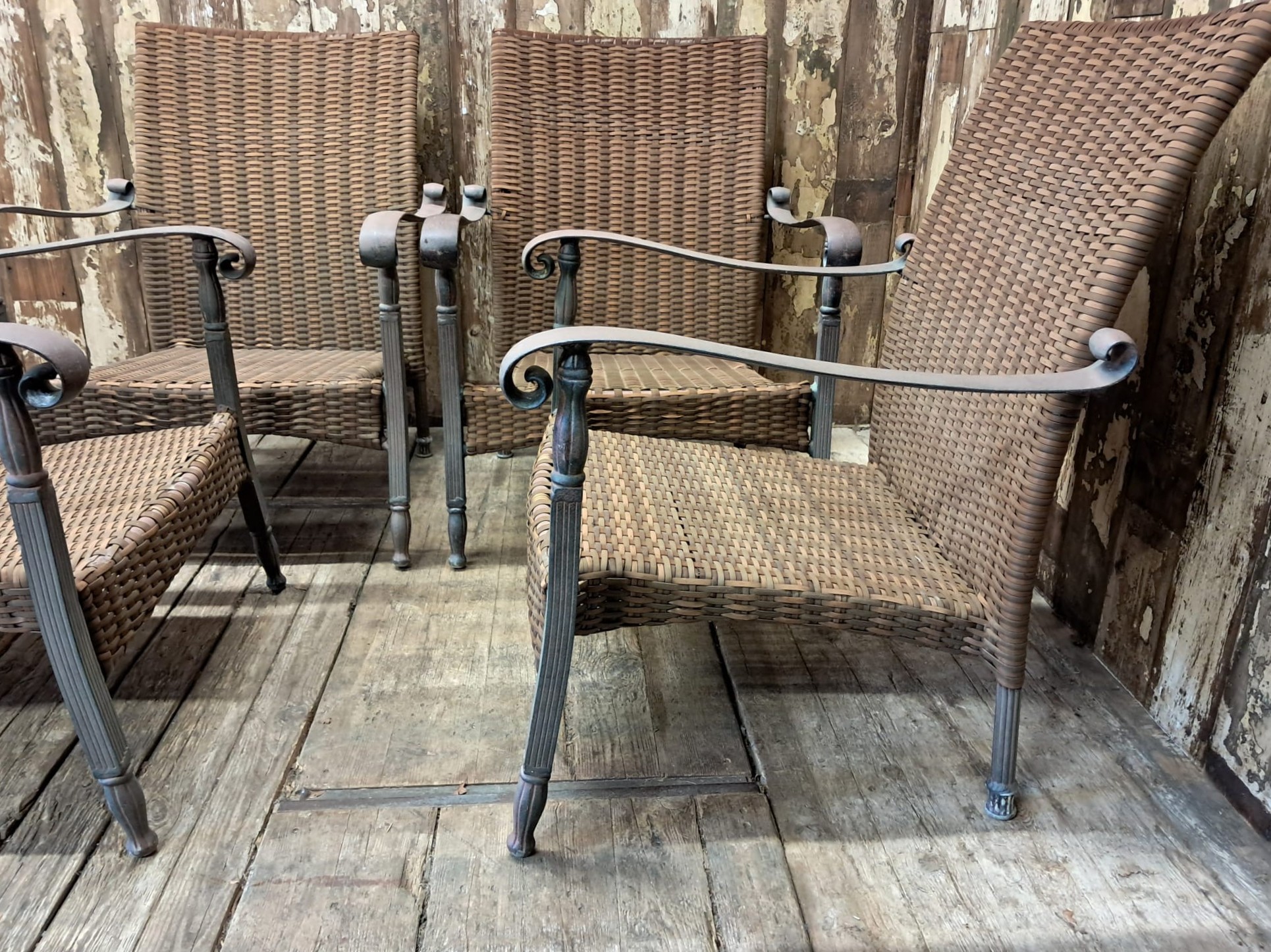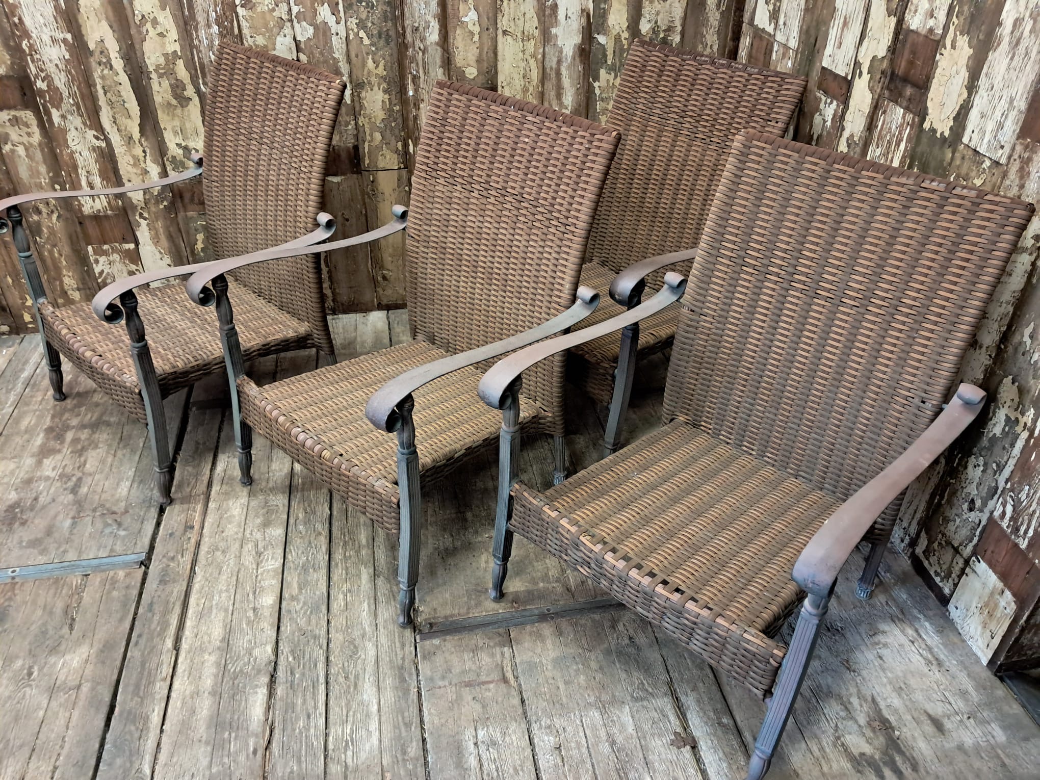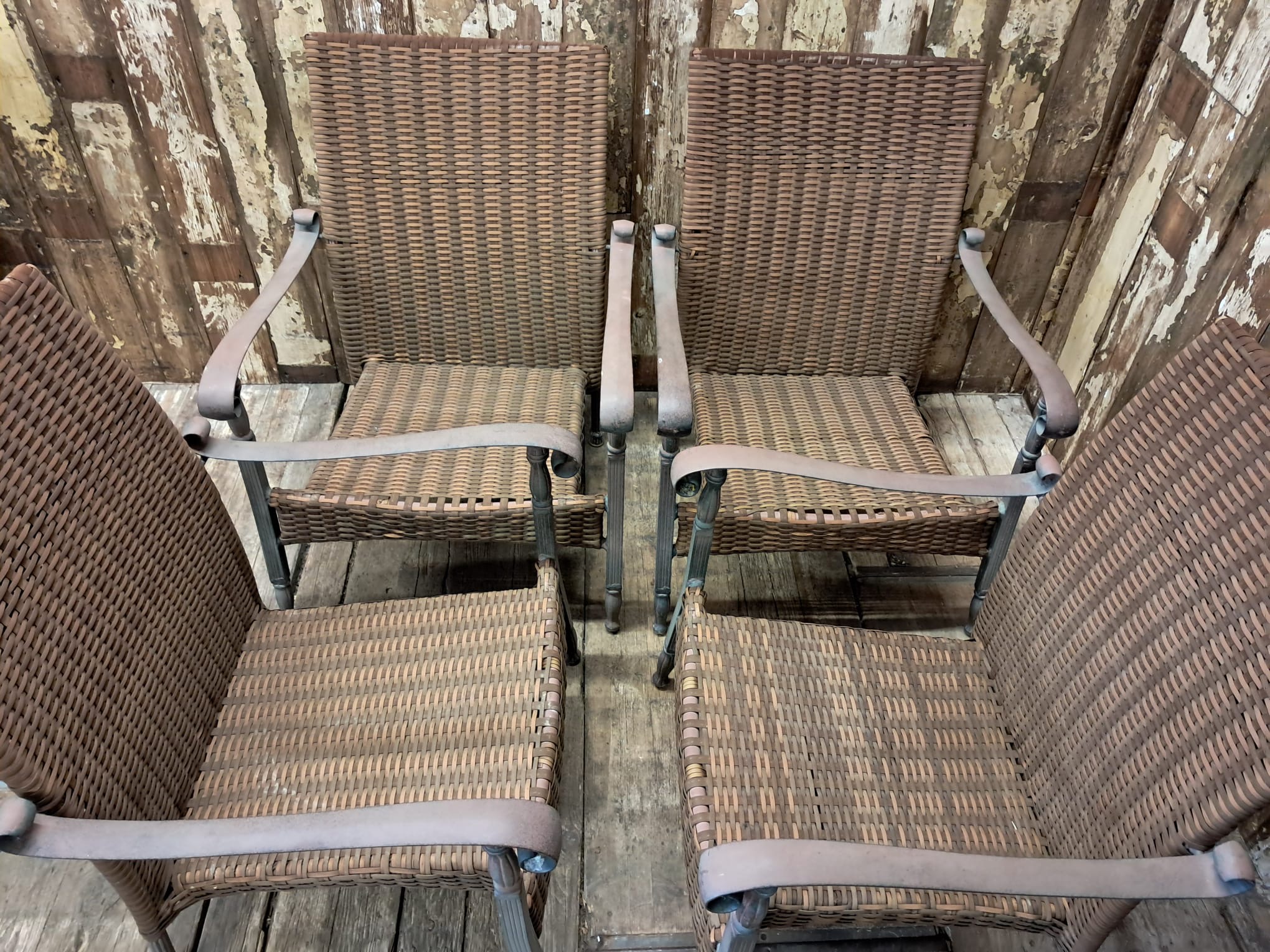 A set of four beautiful poly-rattan and steel garden armchairs.