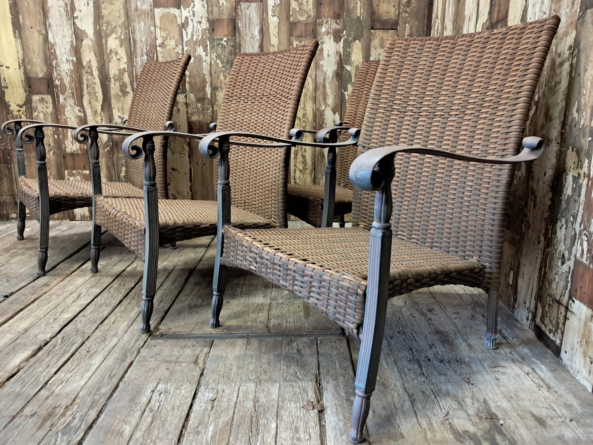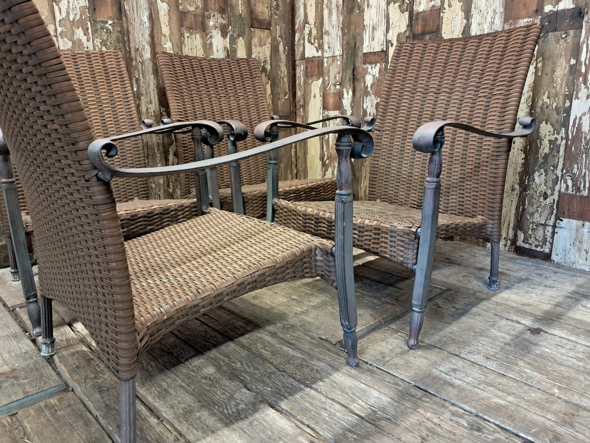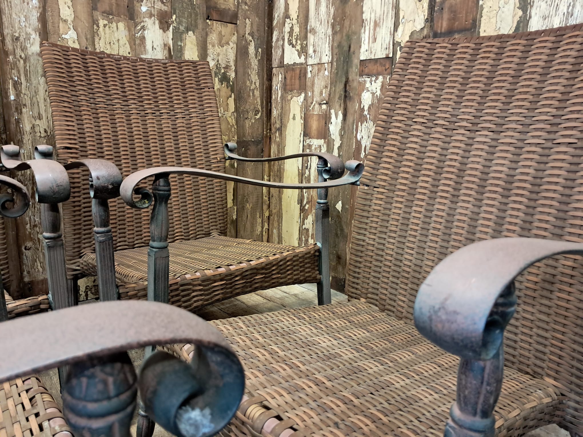A set of four beautiful poly-rattan and steel garden armchairs.