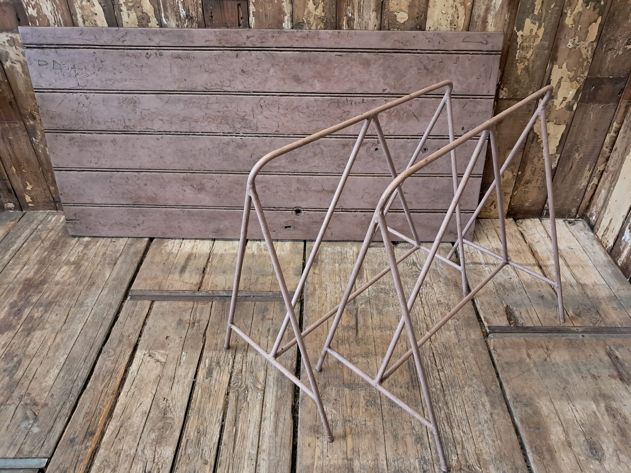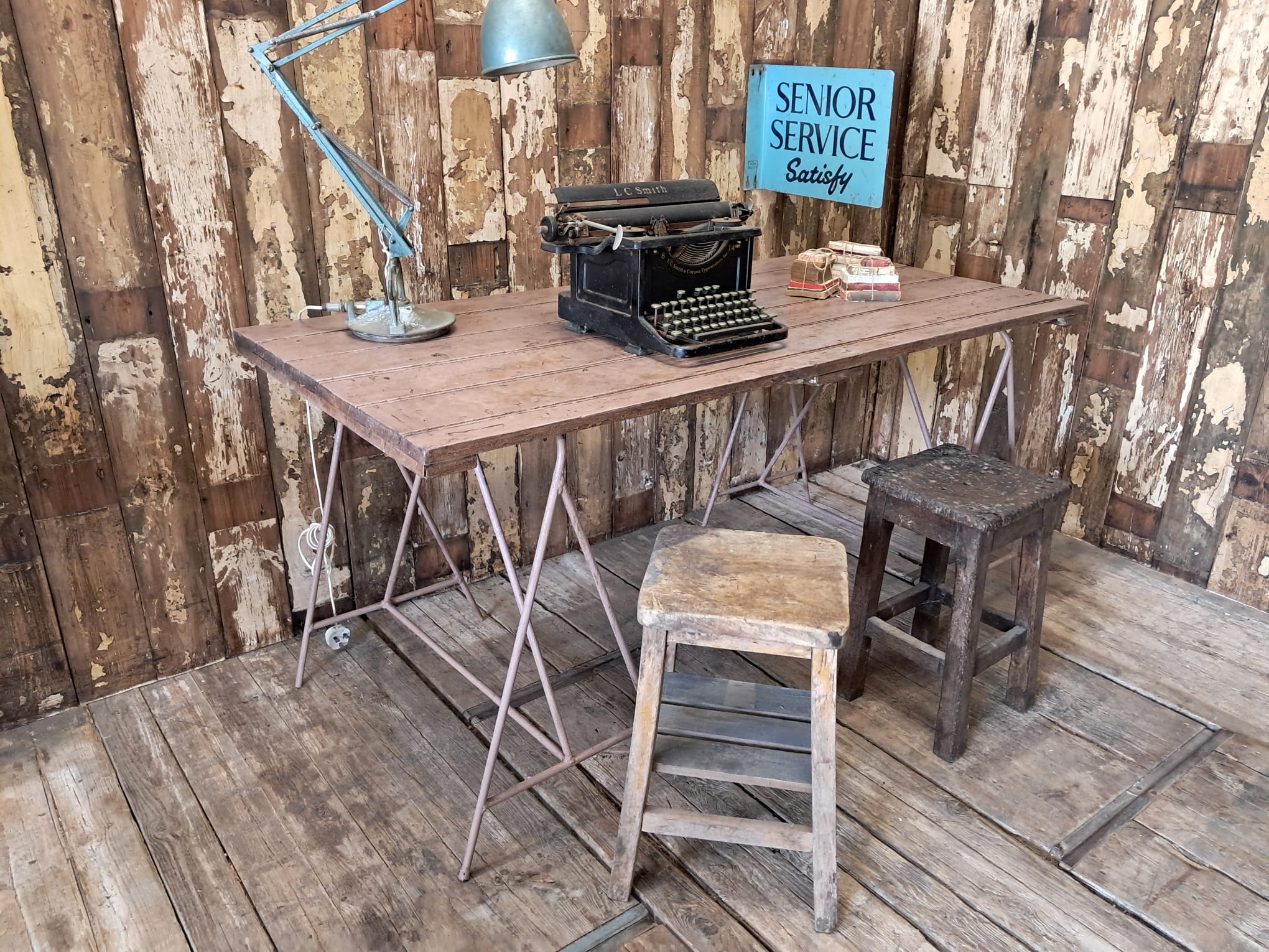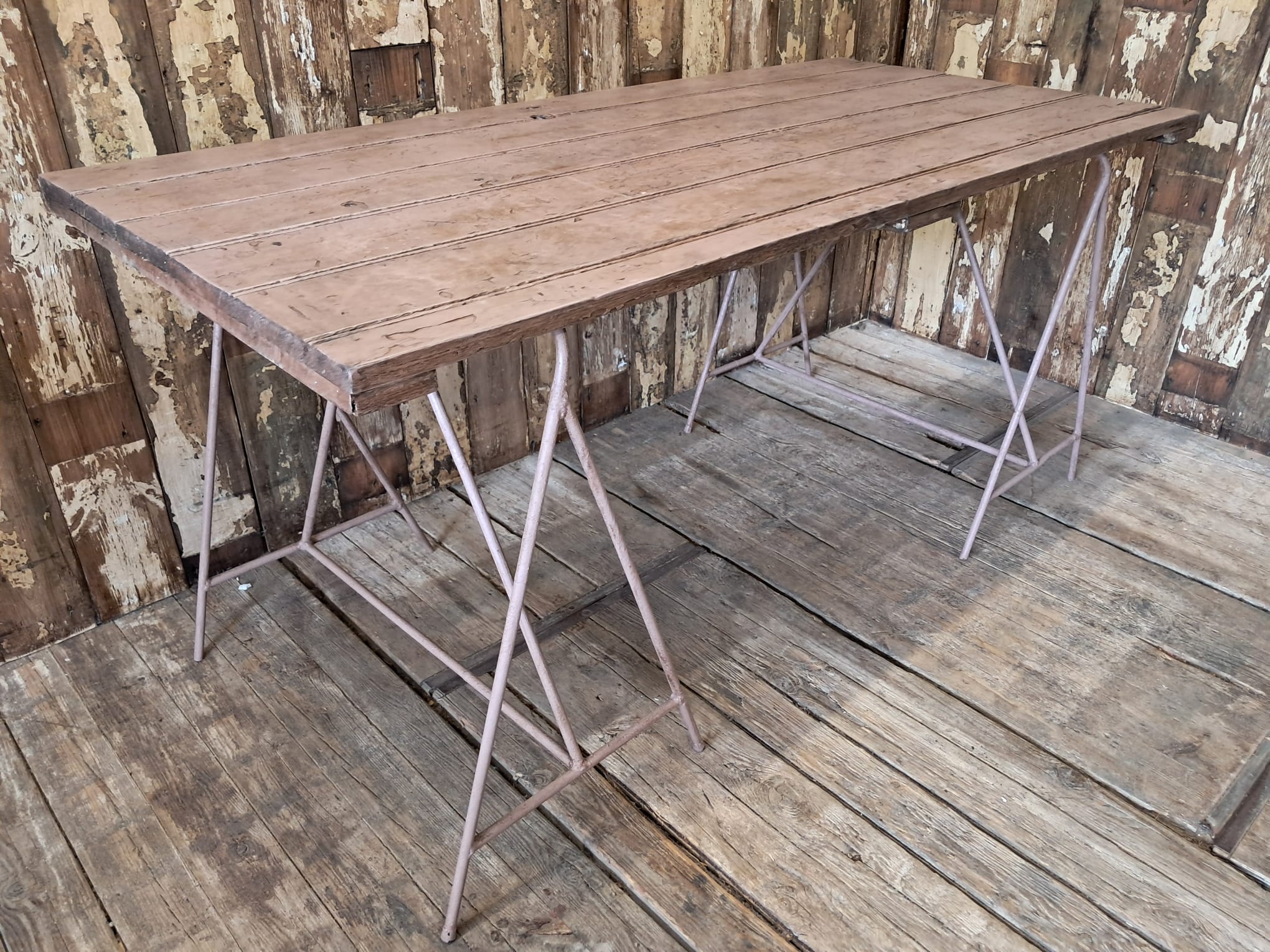 A super trestle table with steel trestle legs and a solid pine, cross braced, recycled door top.