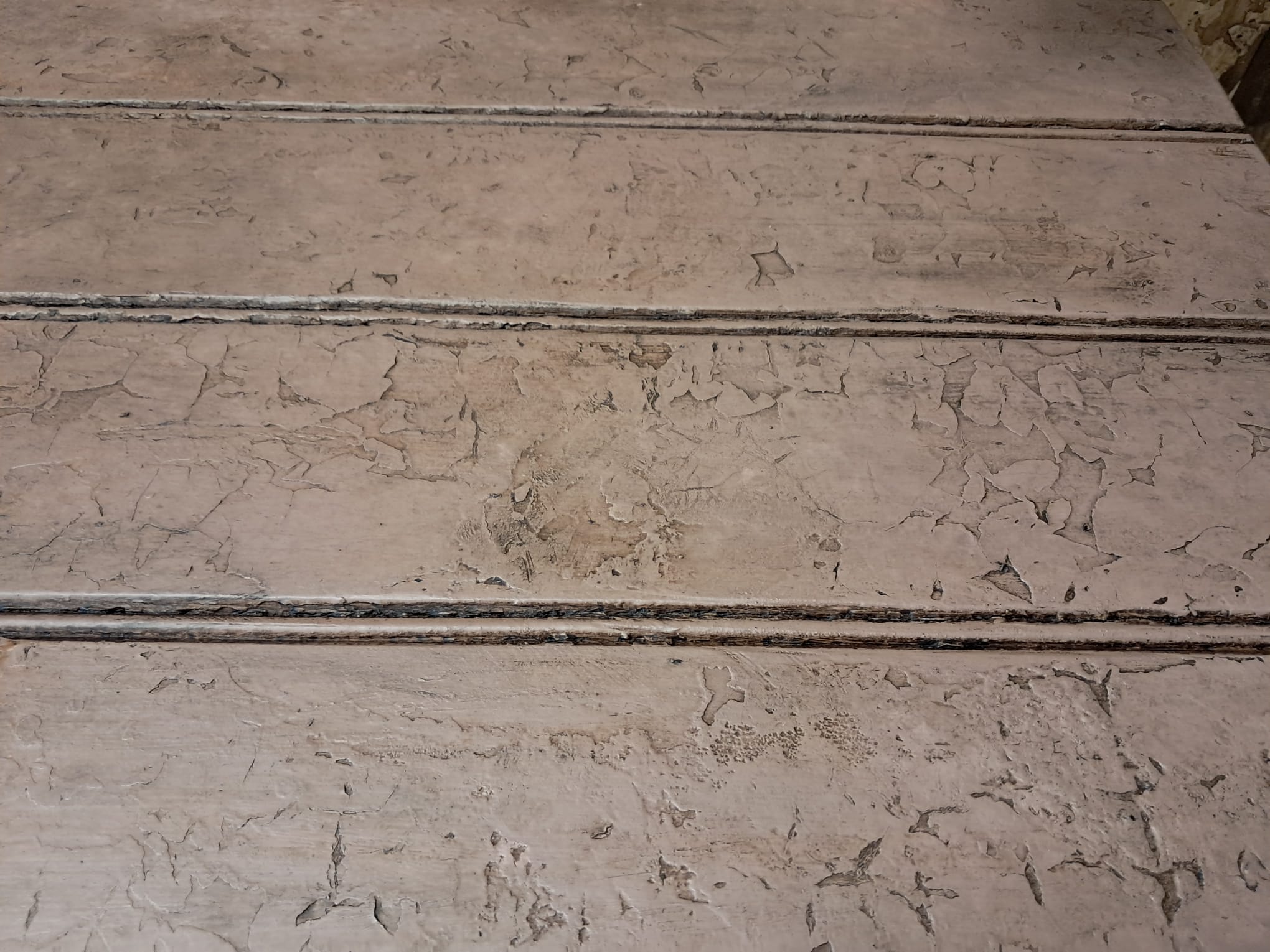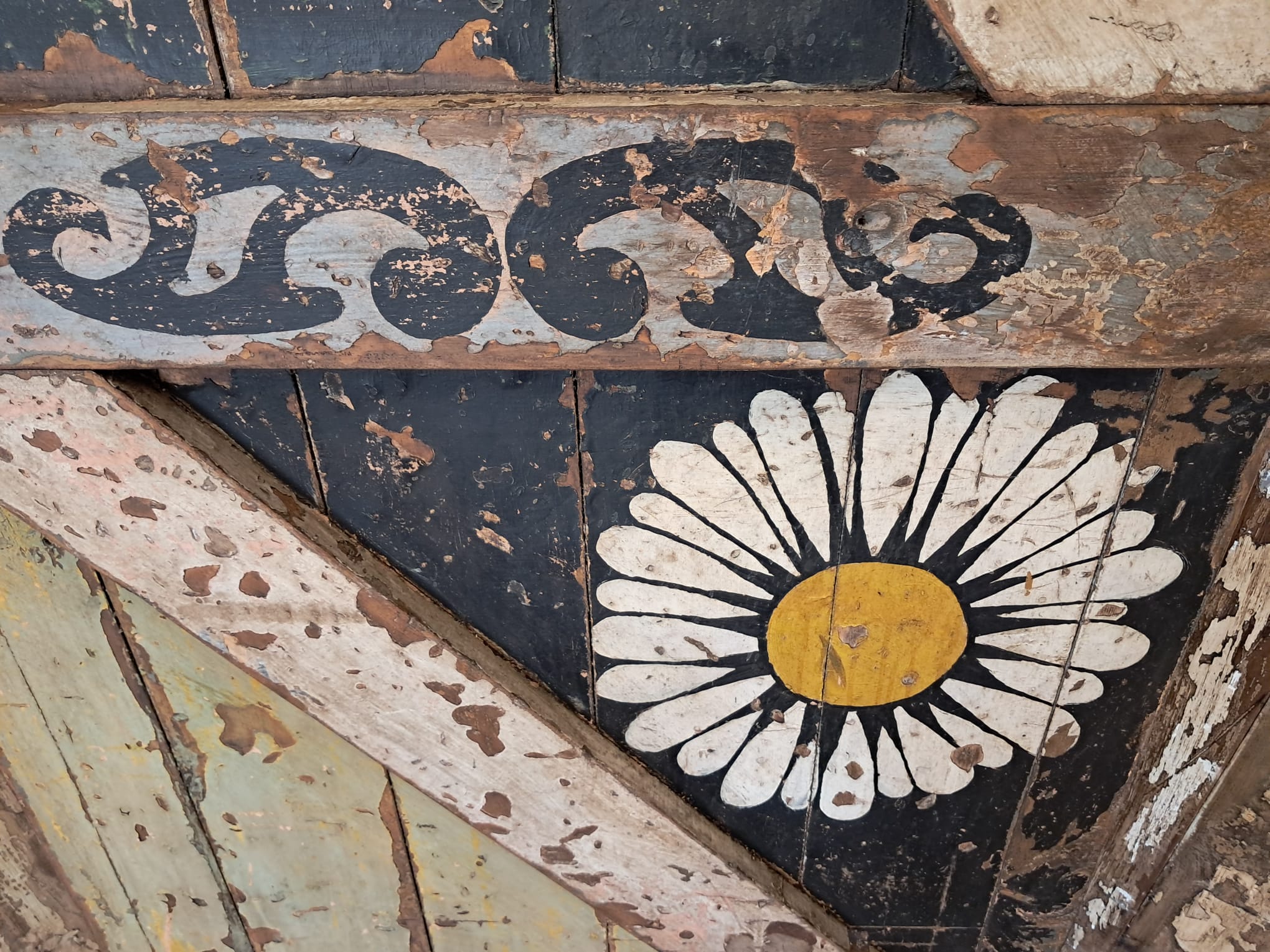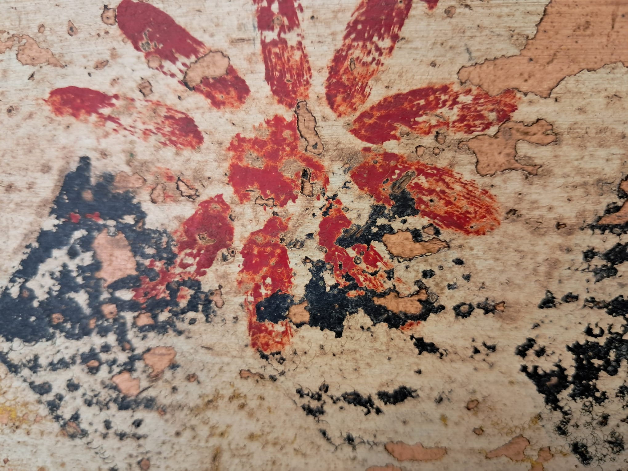 Finished in a subtle muted pink, the legs are unusual in shape and design and the hand painted folk-art on the reverse of the door adds a quirky touch.