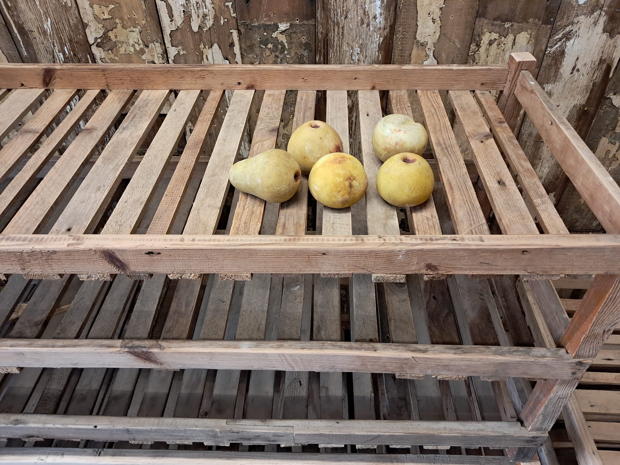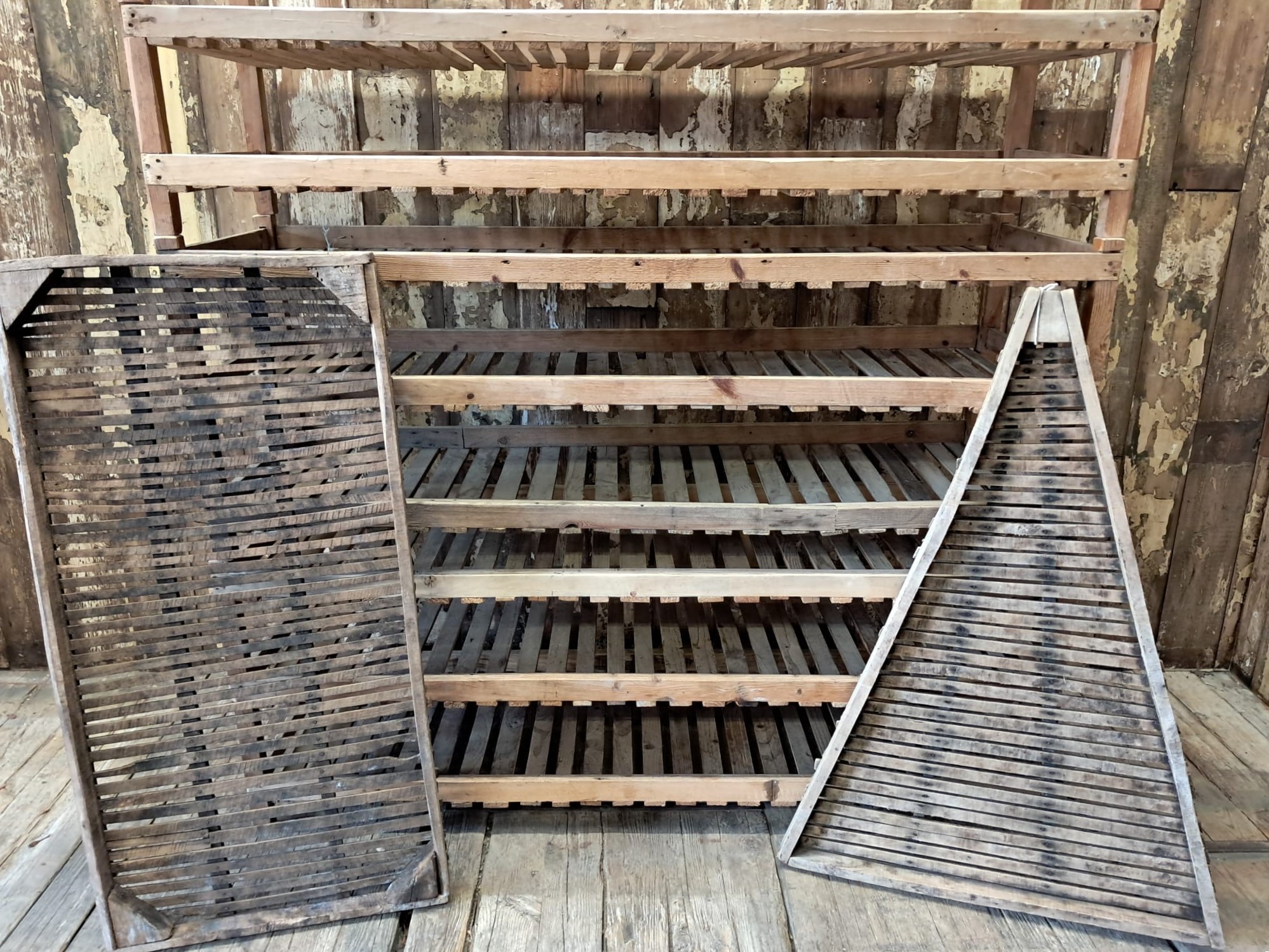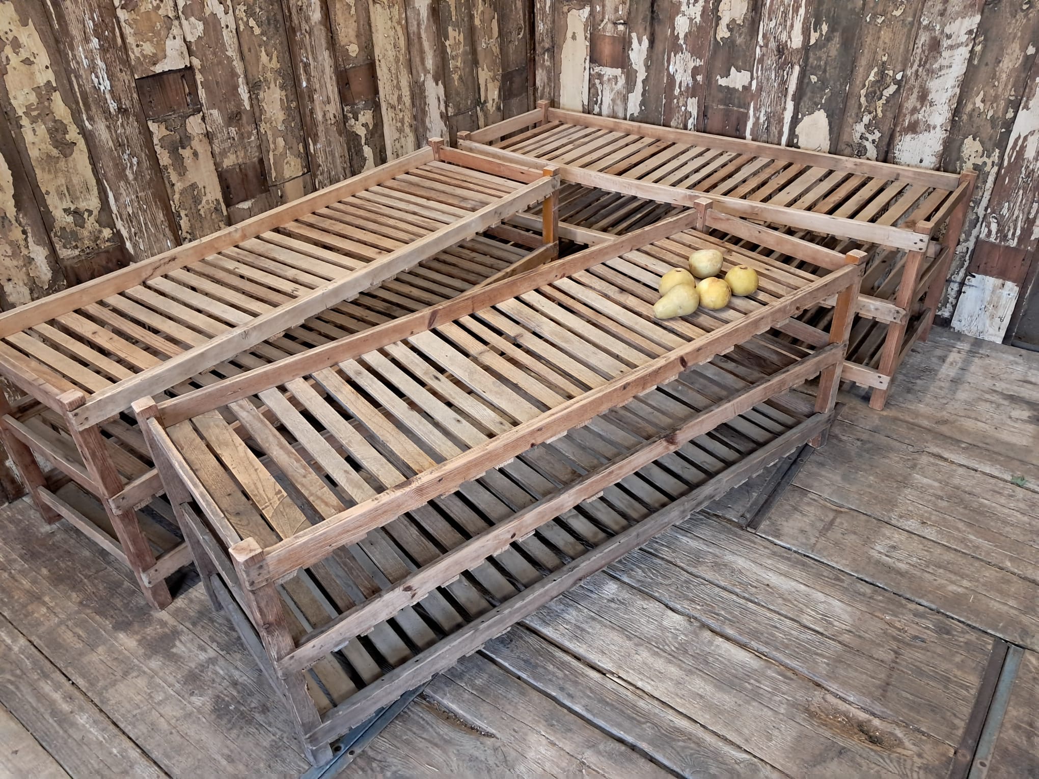 Three vintage French farm apple racks.