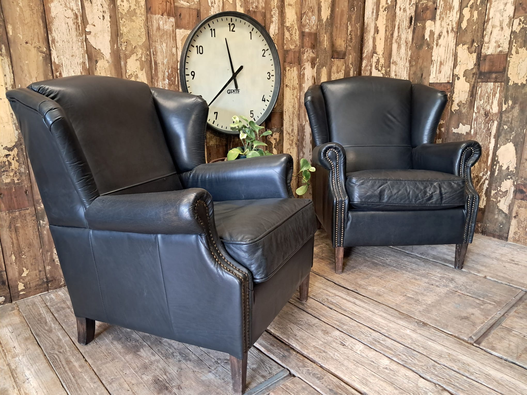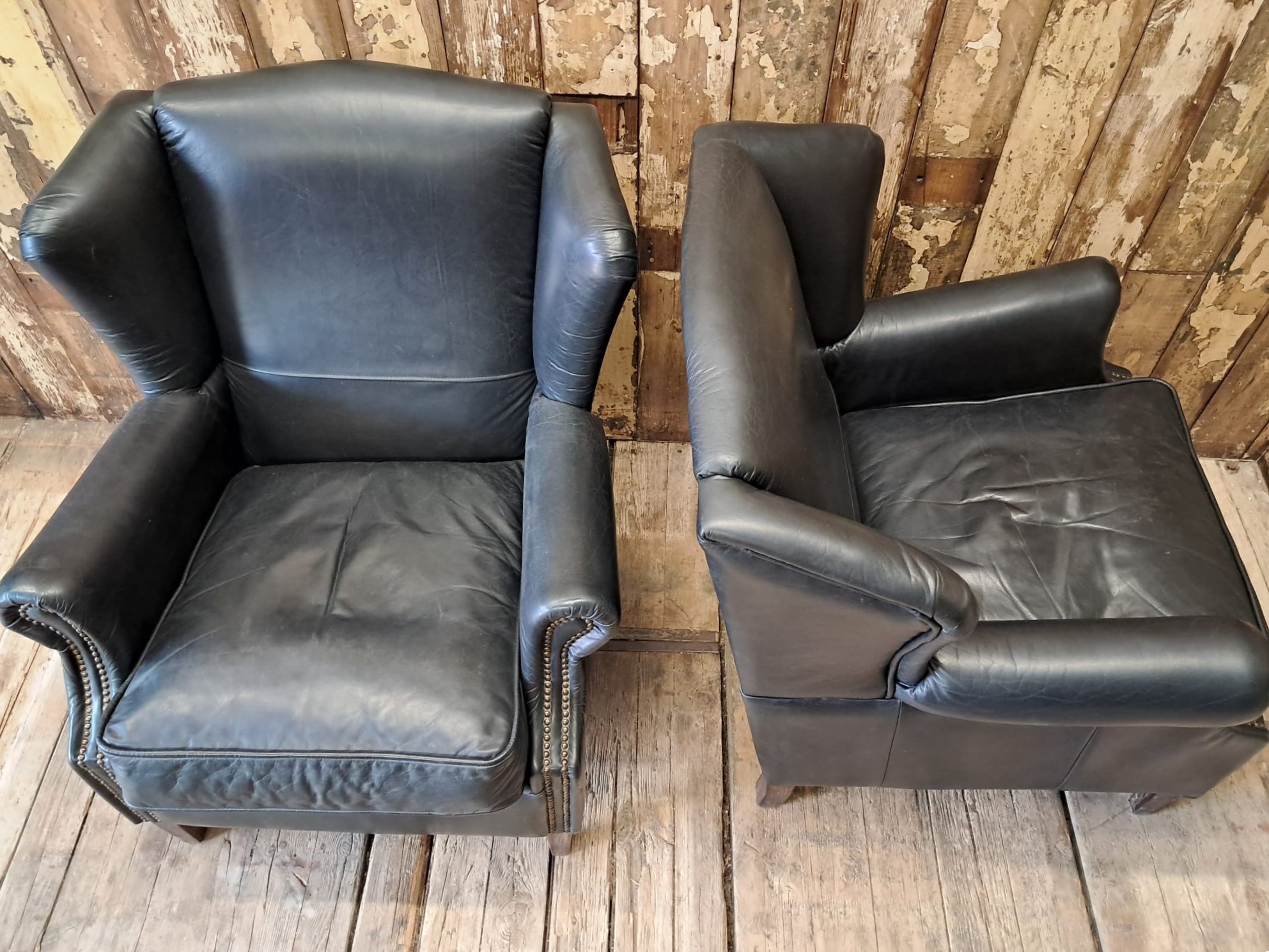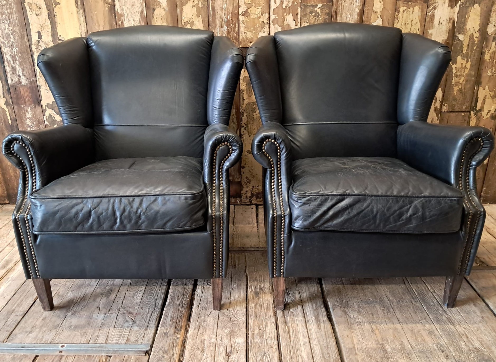 Vintage Black Leather Wingback Armchairs