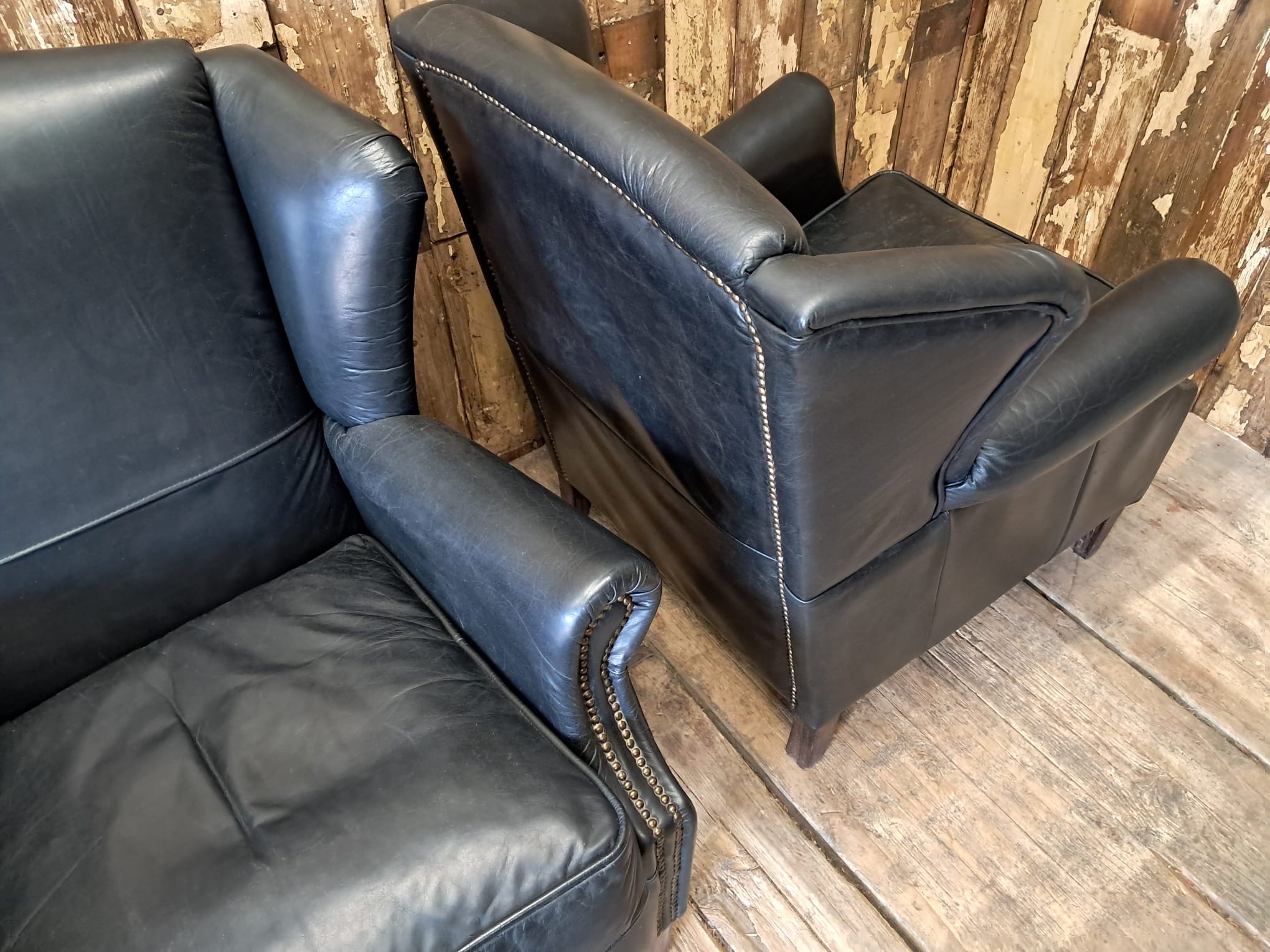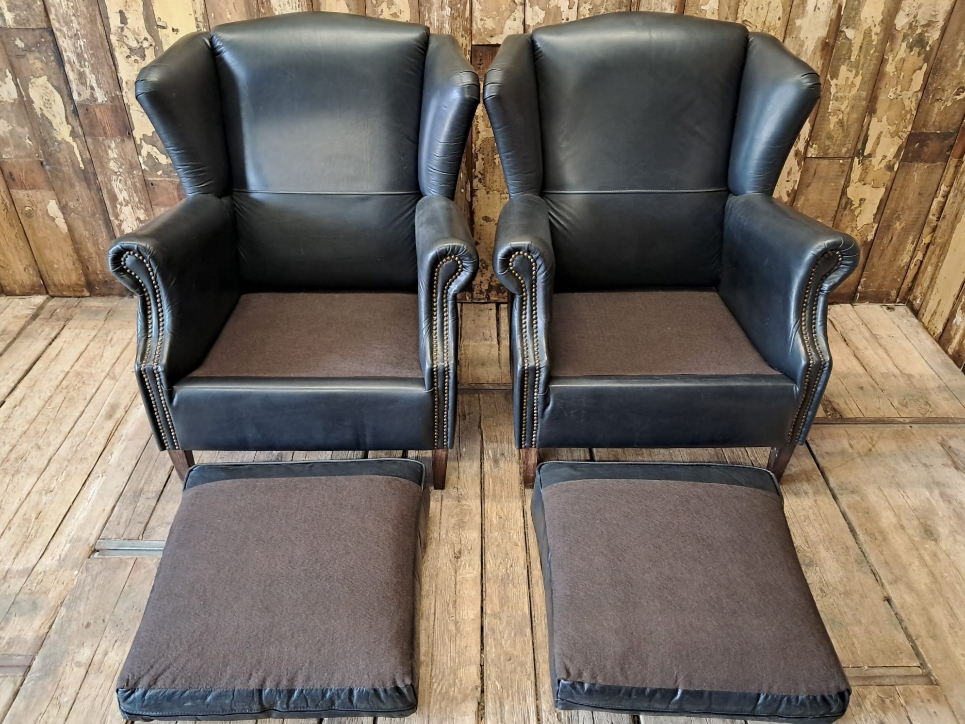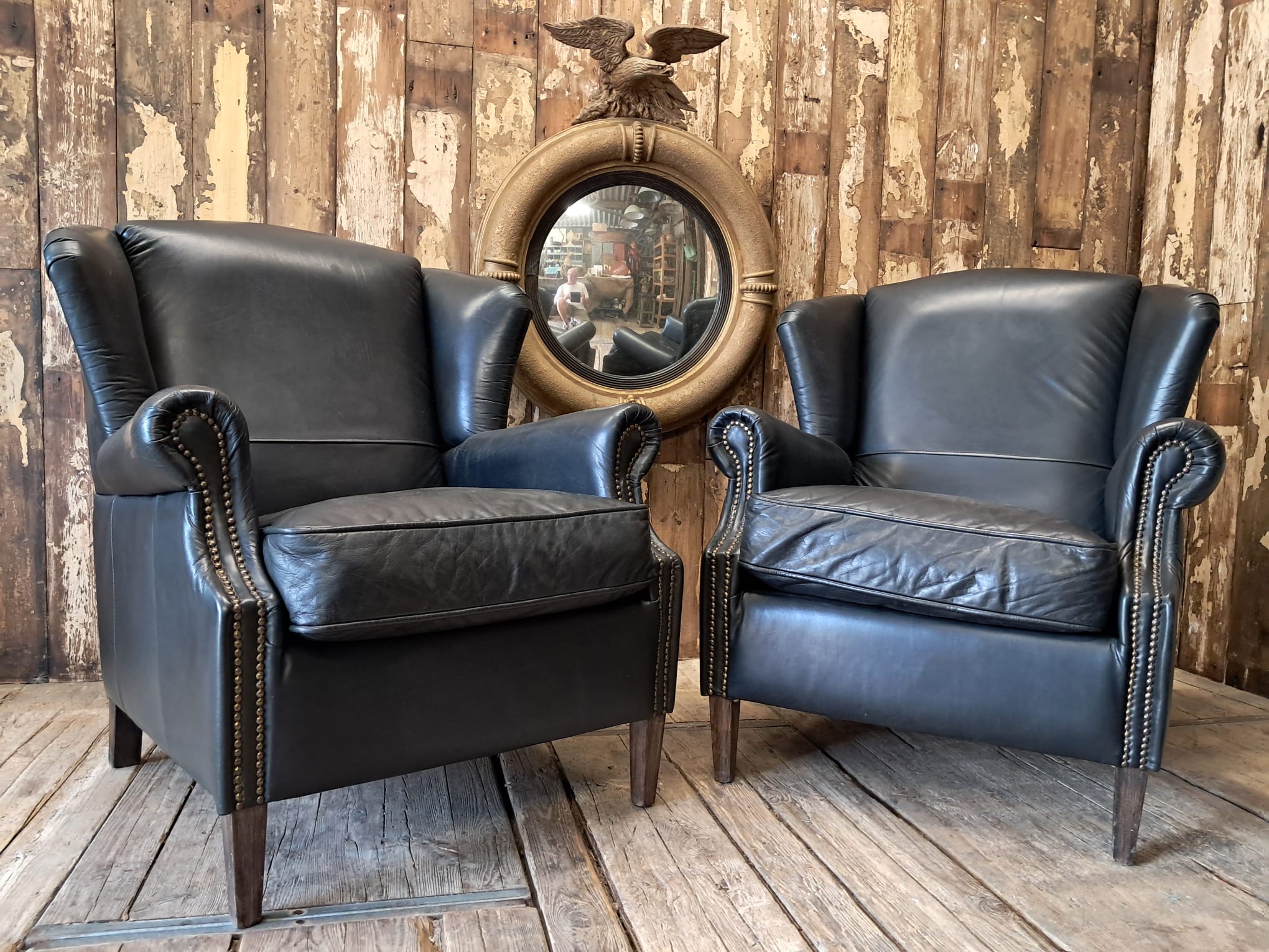 Vintage Black Leather Wingback Armchairs