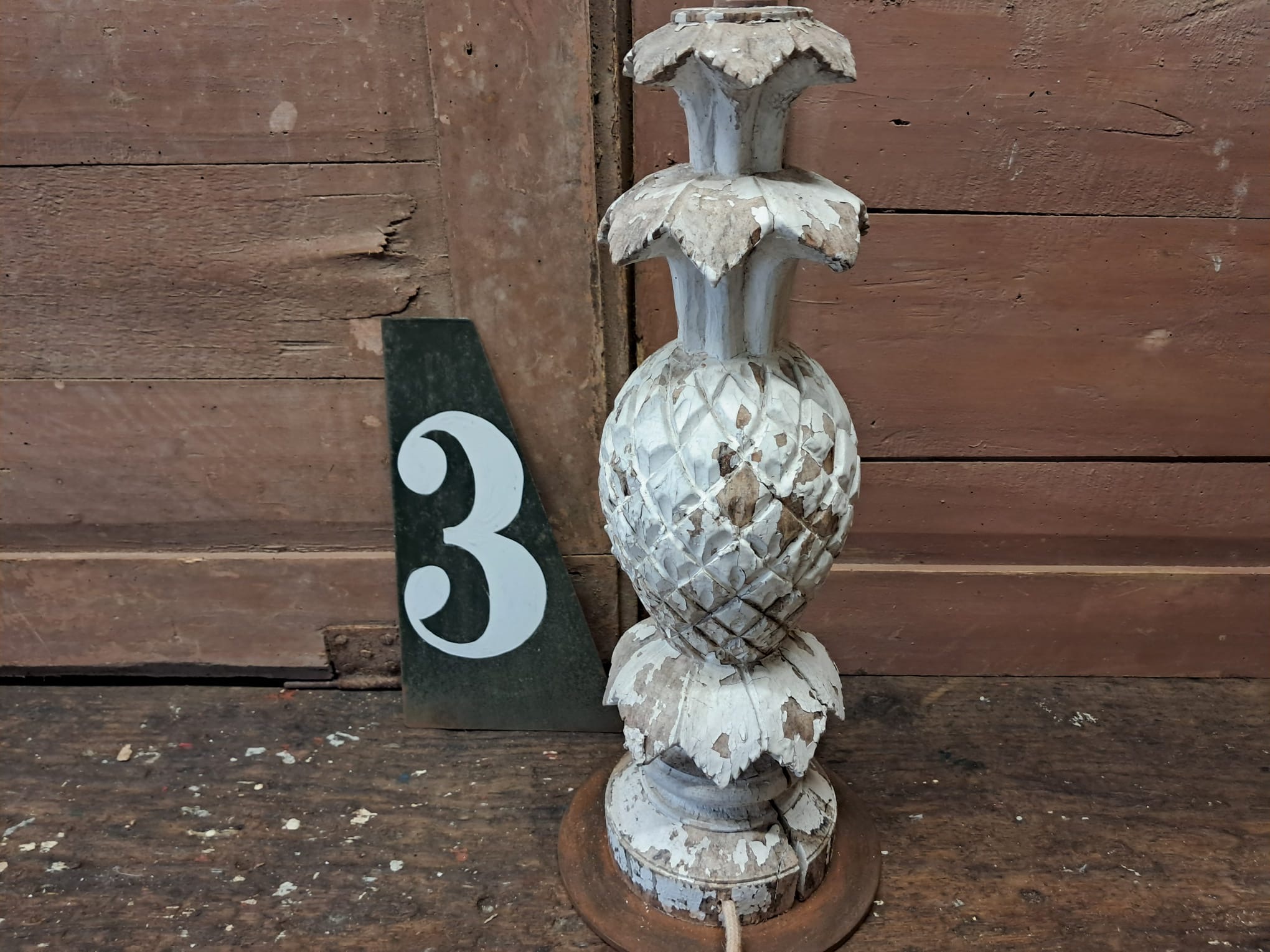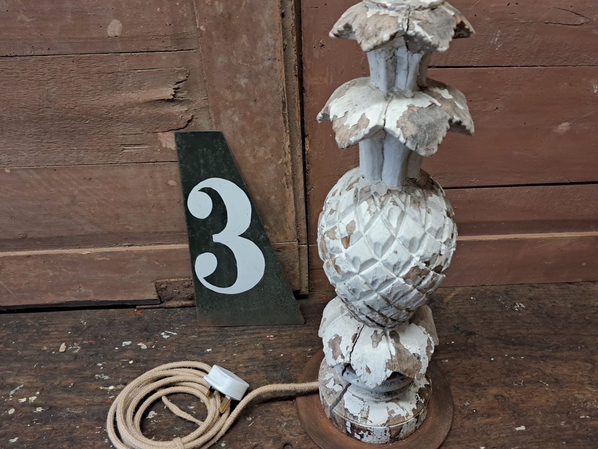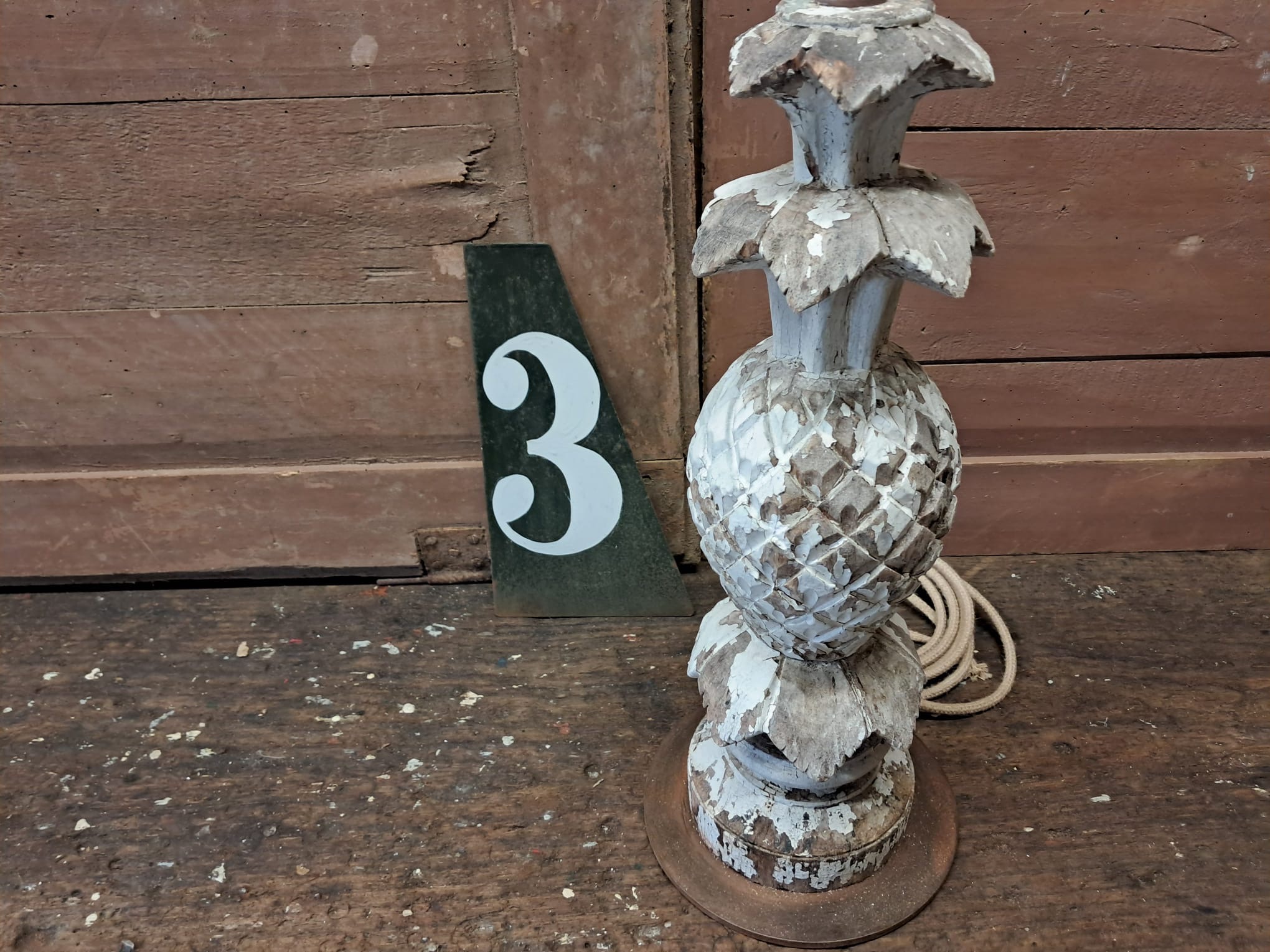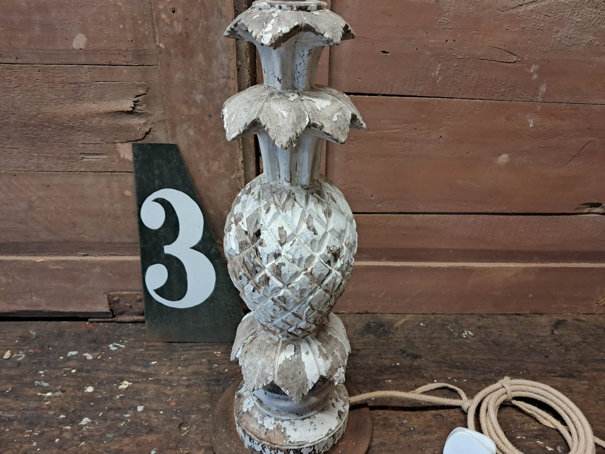 A hand carved wooden pineapple lamp in a natural bleached wood.